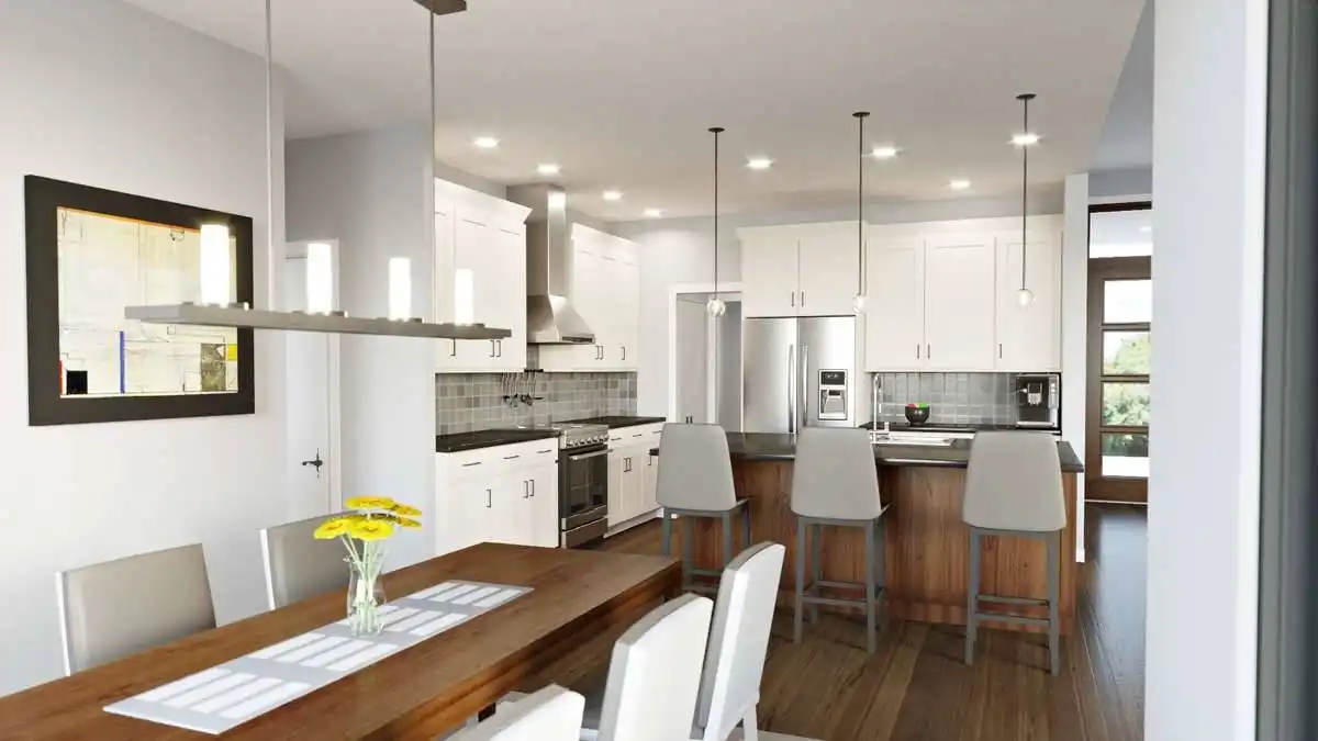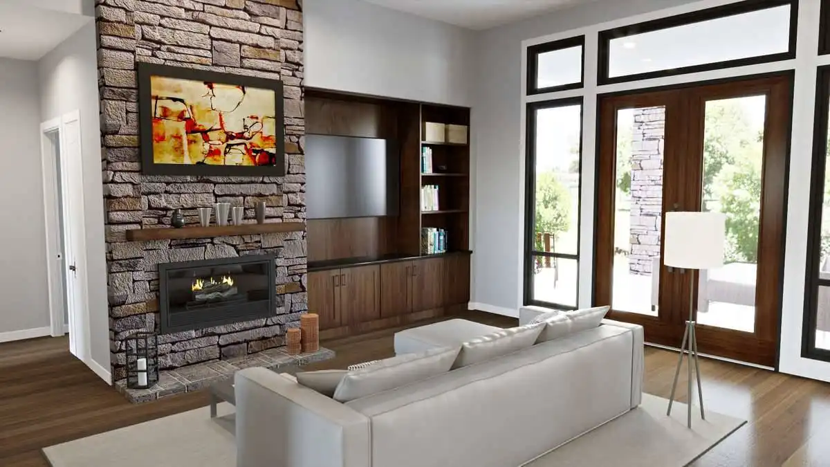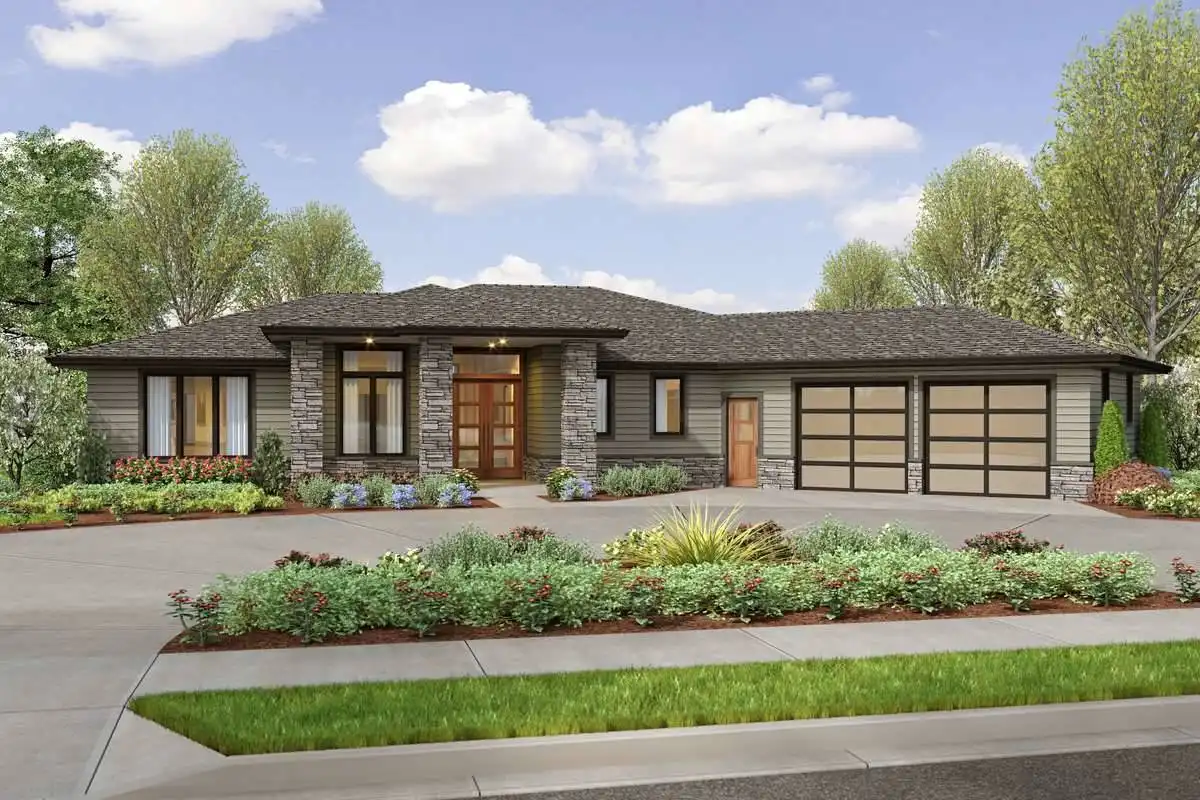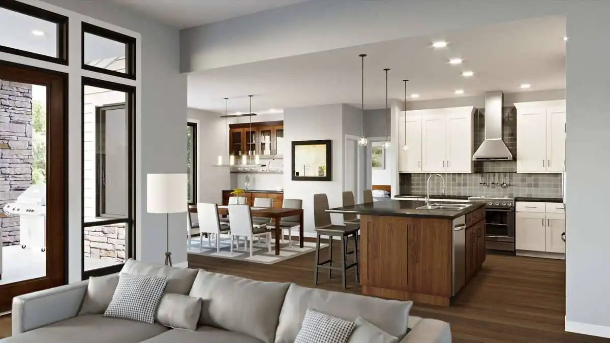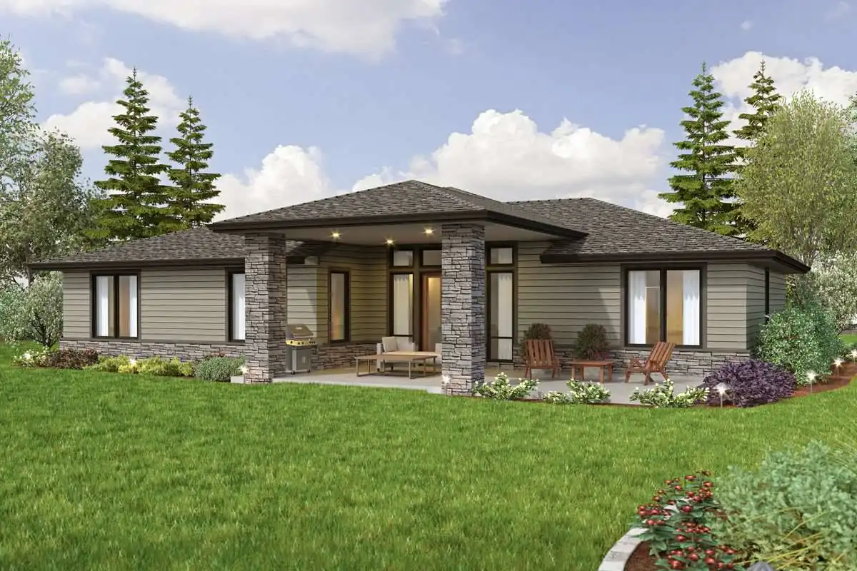 Experience ultimate comfort in this contemporary house plan. The 2,175 square foot space creates a homey feeling and efficiency. In this home, you'll have three bedrooms, two and a half baths and an office room. The space in this home is suitable for a new family who enjoys spending time together. When you want privacy, head to the master bedroom which has a private bathroom. The flow between the kitchen, dining room, and living room makes it very cozy. Enjoy time by the fireplace during cooler months and get to grilling on the patio during warmer months. Keep in mind this plan has a two-car garage as well.