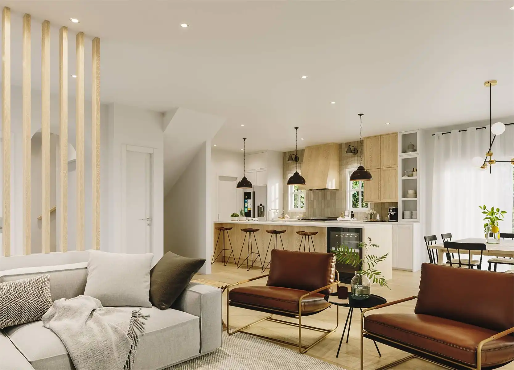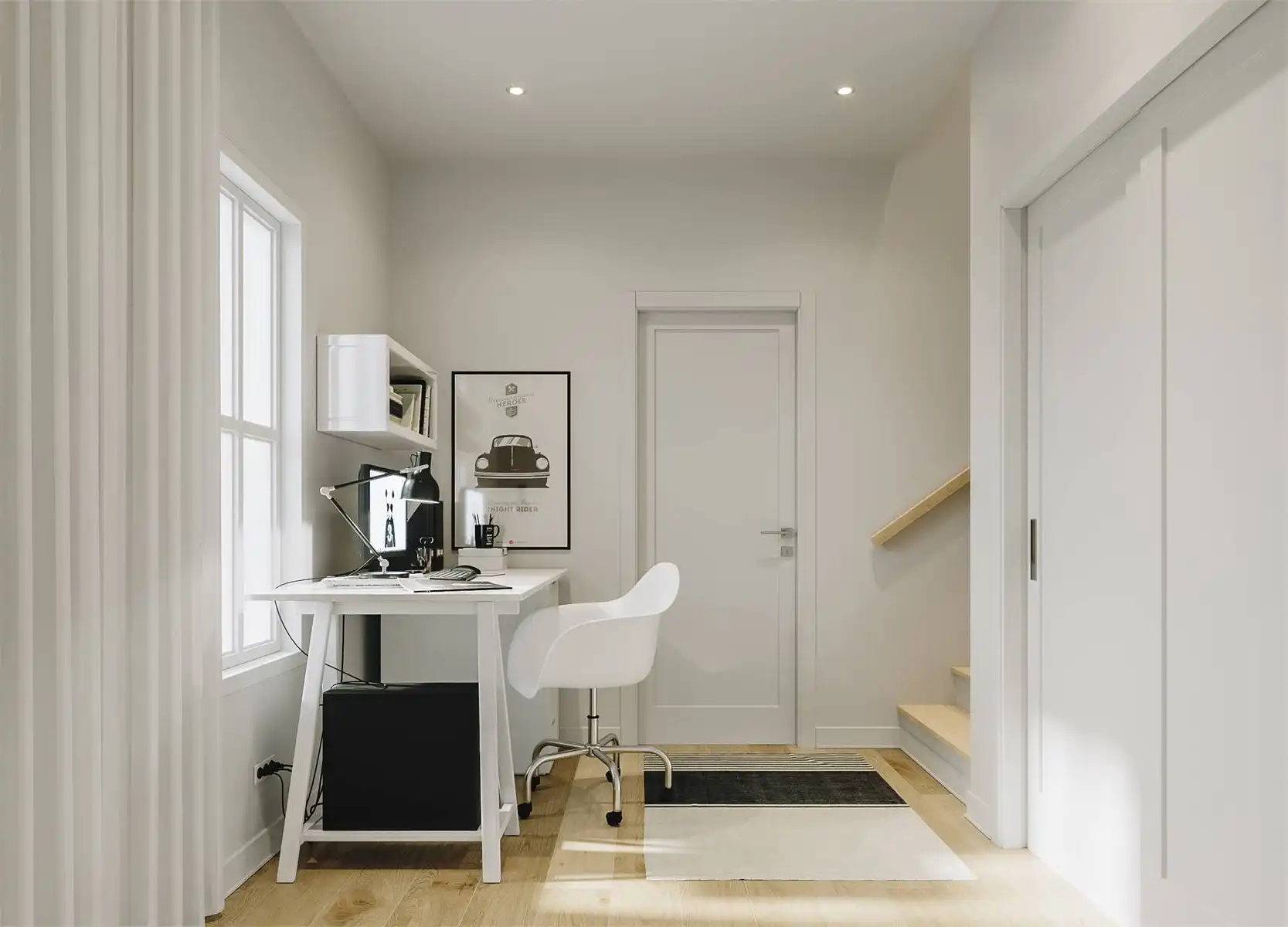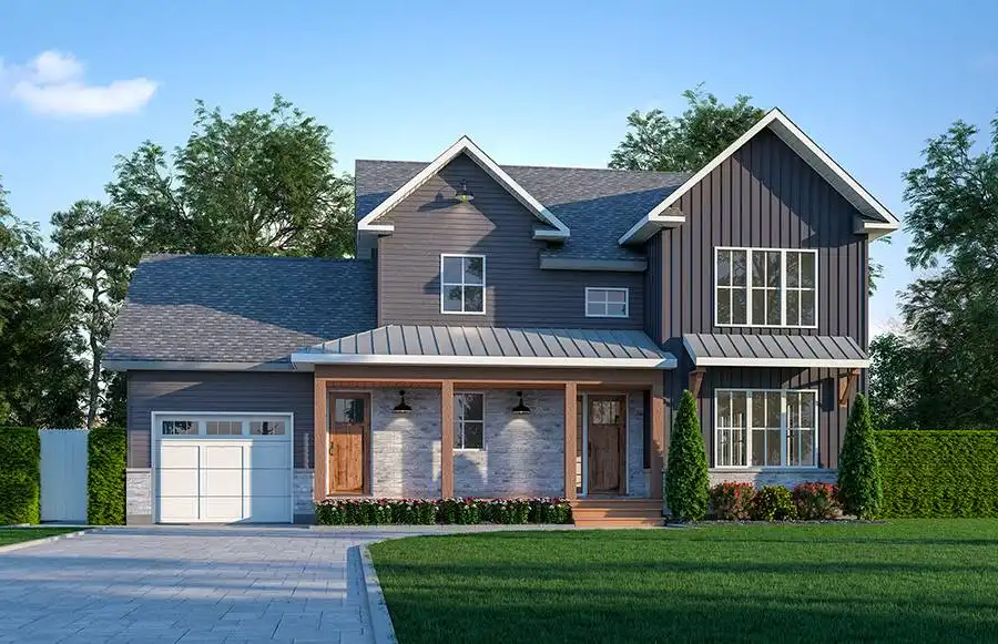 This delightful 3-bedroom country farmhouse design showcases an inviting front porch adorned with a charming blend of board and batten, clapboard, and stone exteriors. The front-facing one-car garage completes the exterior appeal. Upon stepping inside, you'll discover a private office graced by a window that offers a delightful view of the front porch, along with a convenient access door to the garage. This room also serves as the entry point to the basement via its staircase. The open floor plan seamlessly facilitates social gatherings with friends and family. The kitchen is well-appointed with an elongated island offering seating for up to five people, and it boasts a roomy pantry for ample storage. Sliding doors adorn the rear wall of the dining room, providing access to the backyard, while the living room features picturesque windows that frame views of the front of the house. Moving upstairs, three bedrooms share a generously-sized bathroom, and the laundry room is discreetly situated on this level for added convenience.