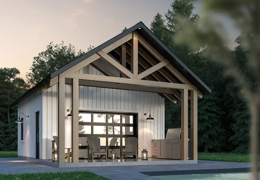 Plan 6626 is a lovely little design that you can use to expand your property for work and play! It offers 400 square feet split between the pool house in front and the shed in back. Both have garage doors and regular swinging doors, and the pool house side also has a powder bath. With an outdoor kitchen in front, this makes a great place to host from, and you can also make it a studio or playroom, if you like!