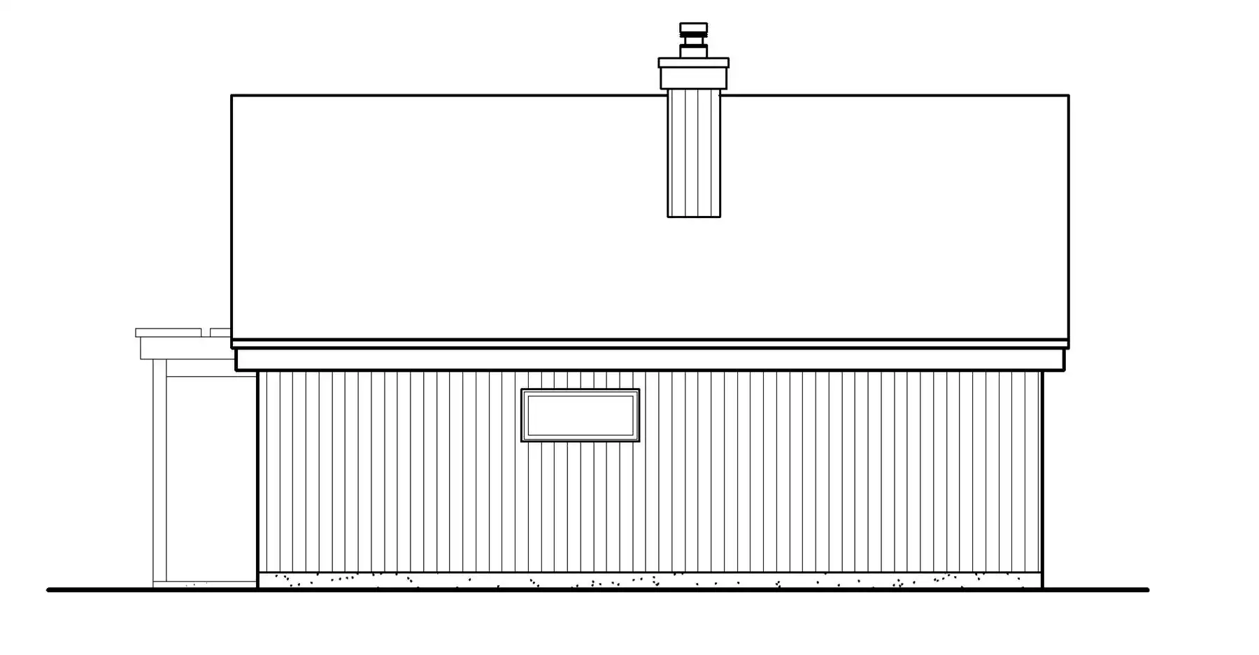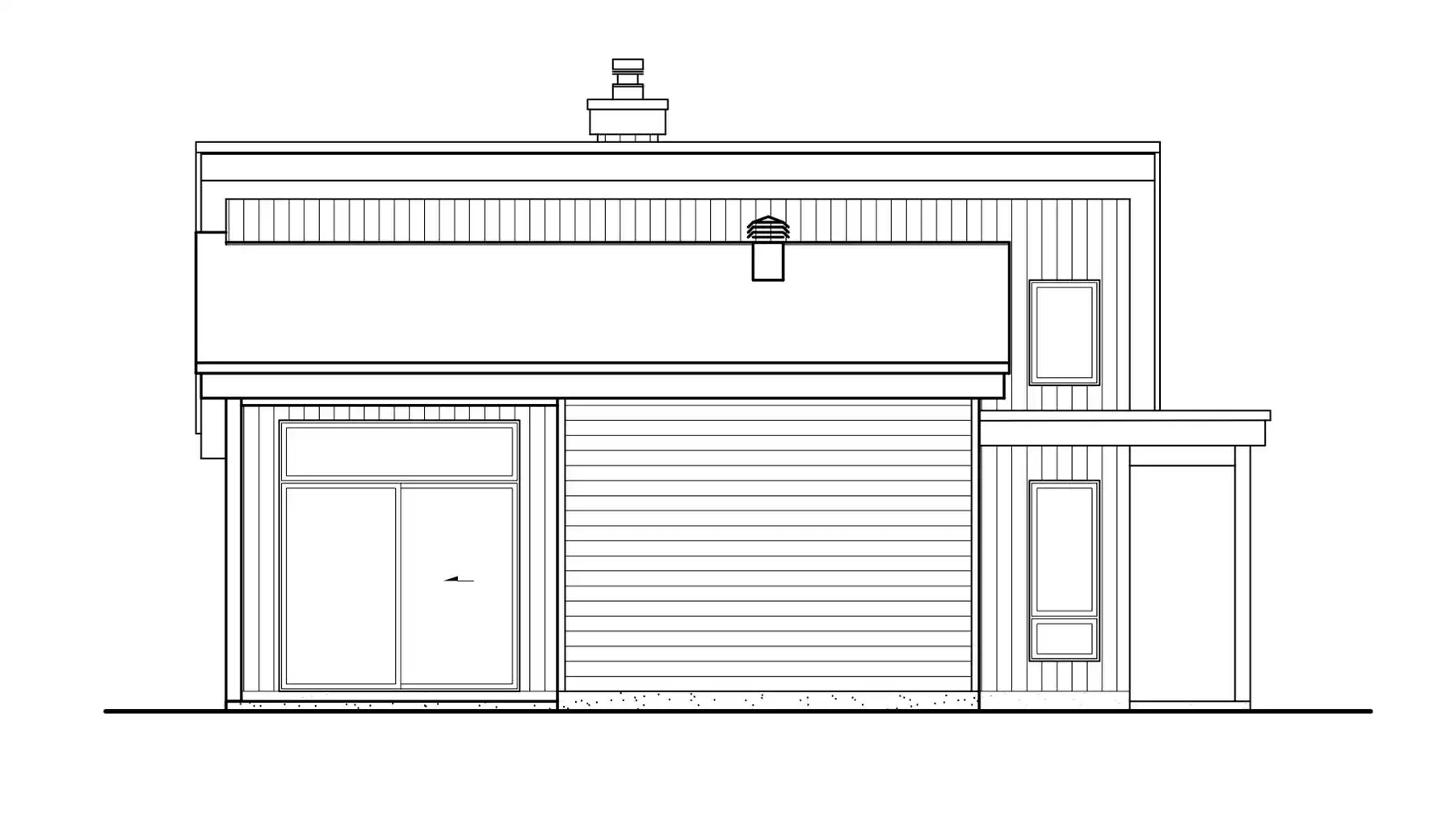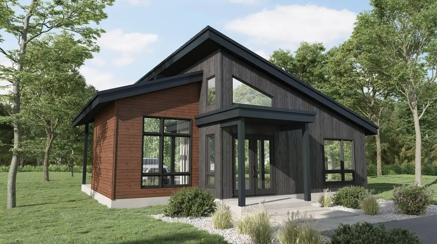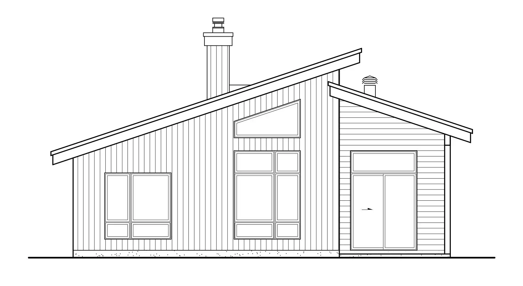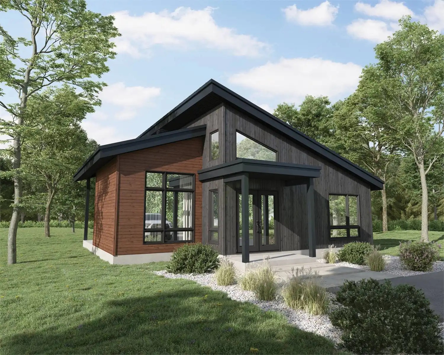 House Plan 6631 is a small contemporary-style cottage with a slanted roof and multiple windows that make it a great choice for natural surroundings. It is 34 feet wide by 30 feet deep and has 860 square feet across one level. It is an open-concept design with cathedral ceilings and a kitchen with an island, dining space, and a living room with a wood stove. There are two bedrooms and they share bathroom with space for a washer and dryer.