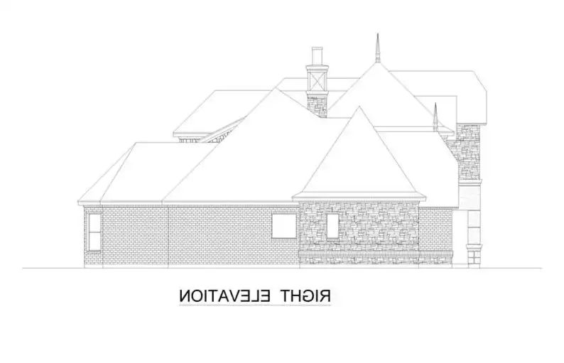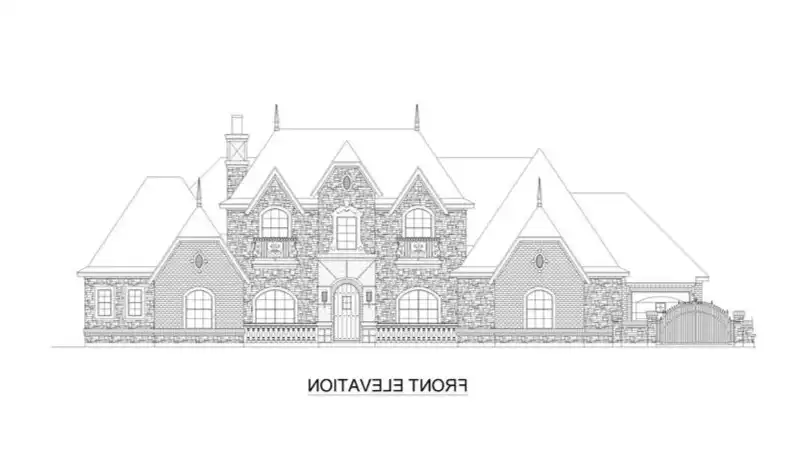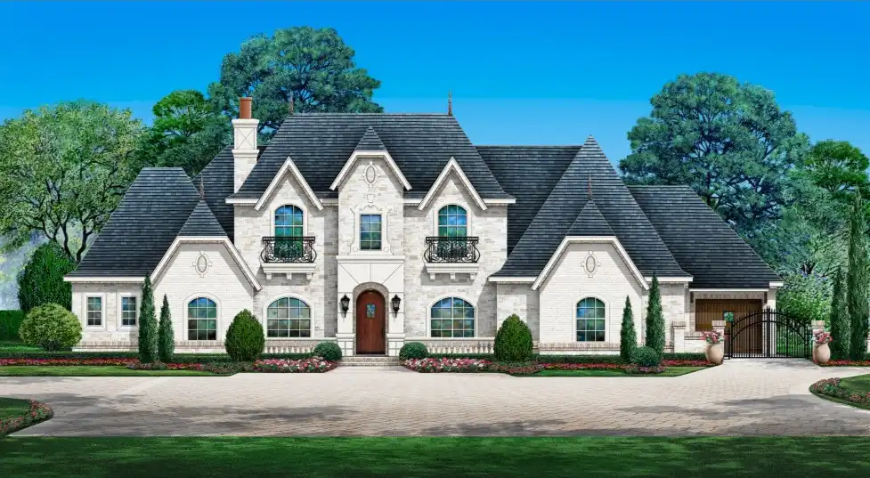 This European home plan spans across two levels, encompassing 4,182 square feet of living space, complete with five bedrooms and four and a half bathrooms. The charming exterior boasts a beautiful blend of brick, stone, and stucco, resulting in an attractive and welcoming curb appeal. Upon entering the home, a formal dining room greets you to the left of the foyer, while a study/office sits to the right, perfect for those who work from home. The main living area features an open floor plan that seamlessly connects the family room, gourmet kitchen, and breakfast nook with large windows and access to outdoor lounge and cooking patio. The gourmet kitchen comes complete with a large angled island, ideal for both meal preparation and entertaining guests. Adjacent to the kitchen, the breakfast nook offers a comfortable space for casual dining, with easy access to the rear covered patio and lounge, creating an ideal space for outdoor entertaining. The luxurious master suite is conveniently located on the main level, alongside two additional bedrooms with ensuites. Upstairs, you'll discover two more bedrooms, along with a game room and bonus room.