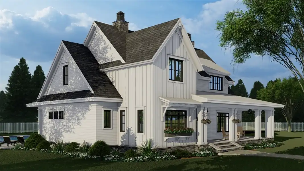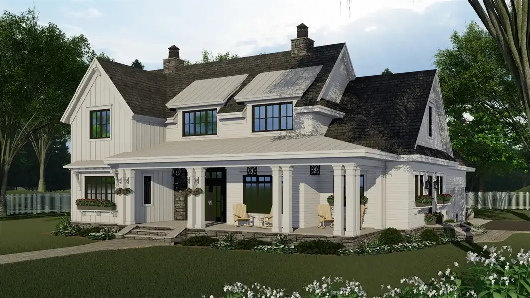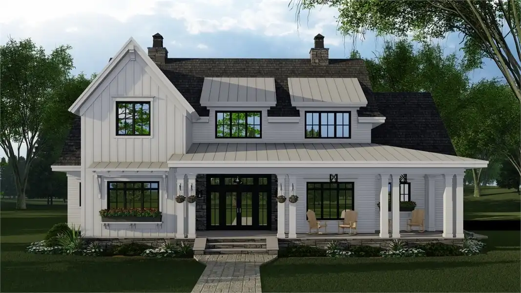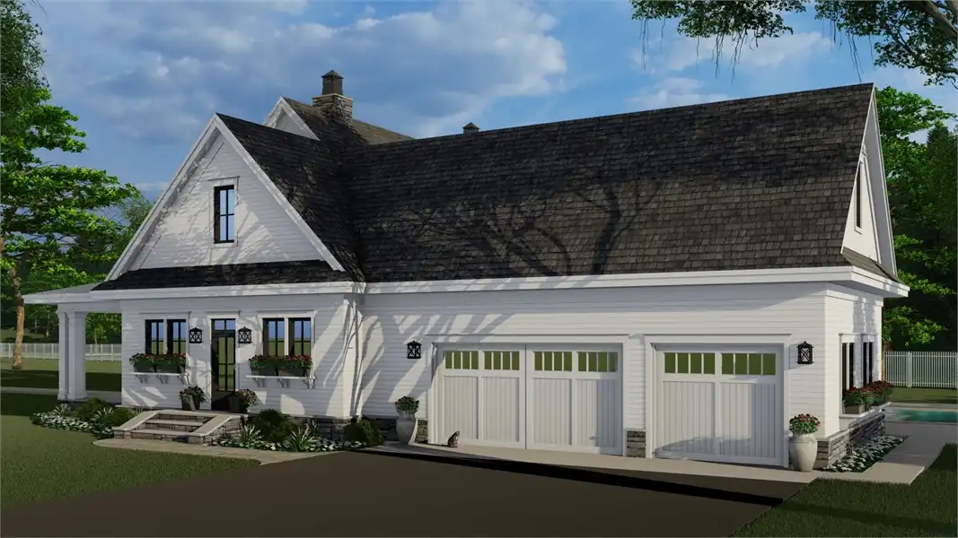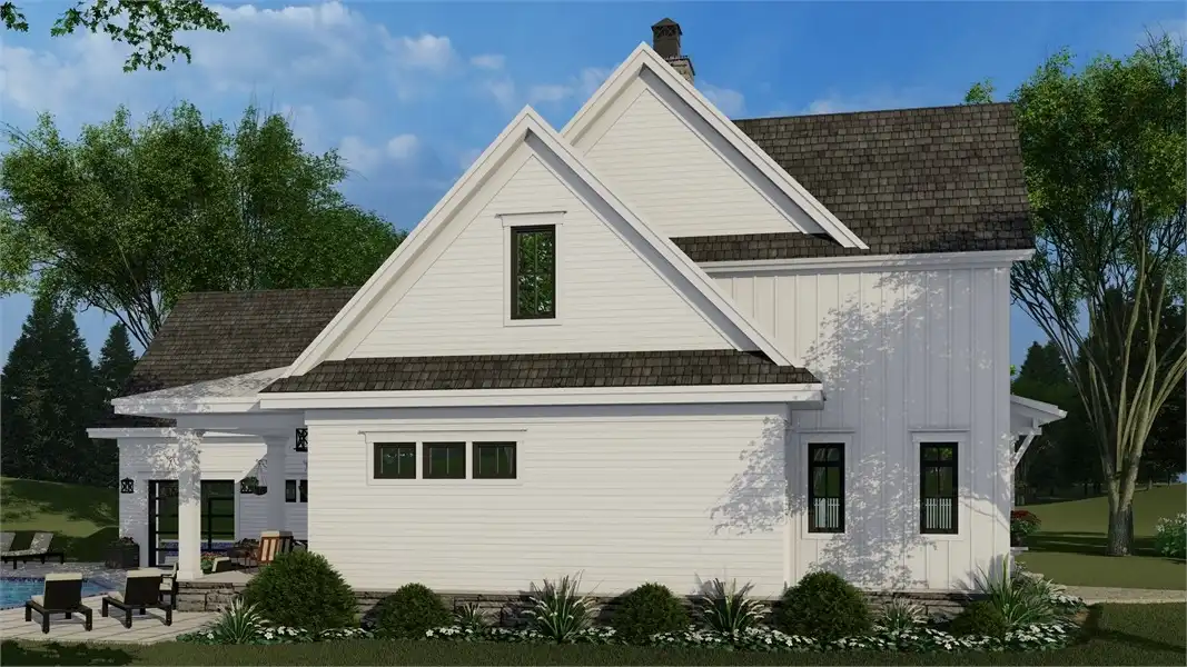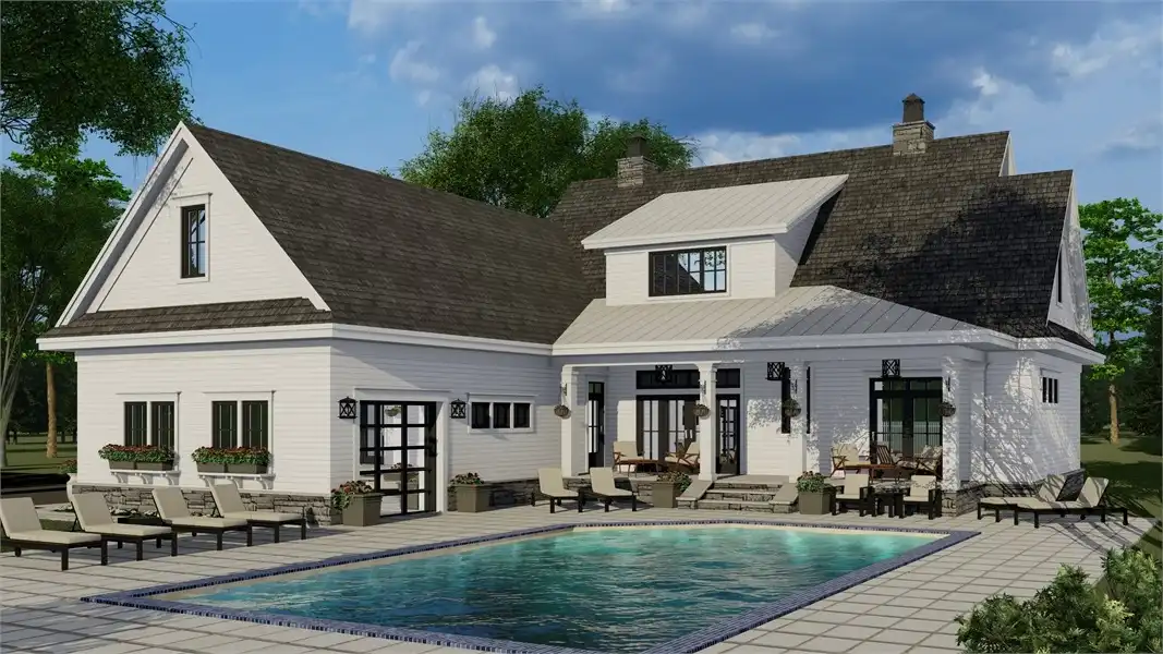 If you need a spacious modern farmhouse with a great layout for family, take a look at what House Plan 6650 has to offer! In 2,913 square feet, you'll find stunning open living, 4 split bedrooms including a main-level master suite, and plenty of nifty extra features like a prep kitchen, a pocket office, a large laundry/mudroom, and even a pool/garage bath. Owners will love their bright bedroom, five-piece bath, and dual walk-in closets while the kids will enjoy a pair of Jack-and-Jill bedrooms upstairs. There's also another bedroom near a hall bath, just across the loft. Make sure to notice how the two-story great room and loft help keep each other bright from both sides despite the wall between them thanks to the interior transoms! House Plan 6650 is perfect for hosting with communal spaces on both levels, and if you need any more room, just look to the bonus over the three-car garage!