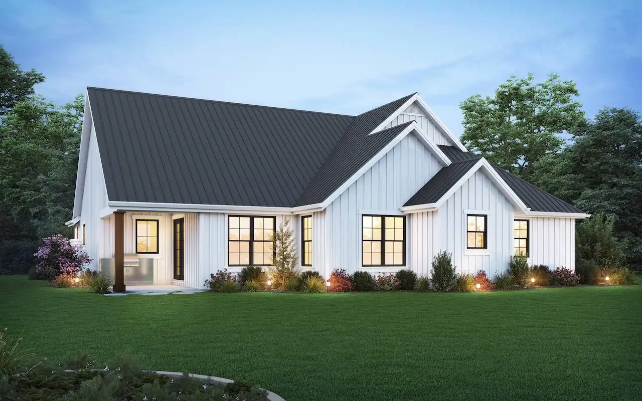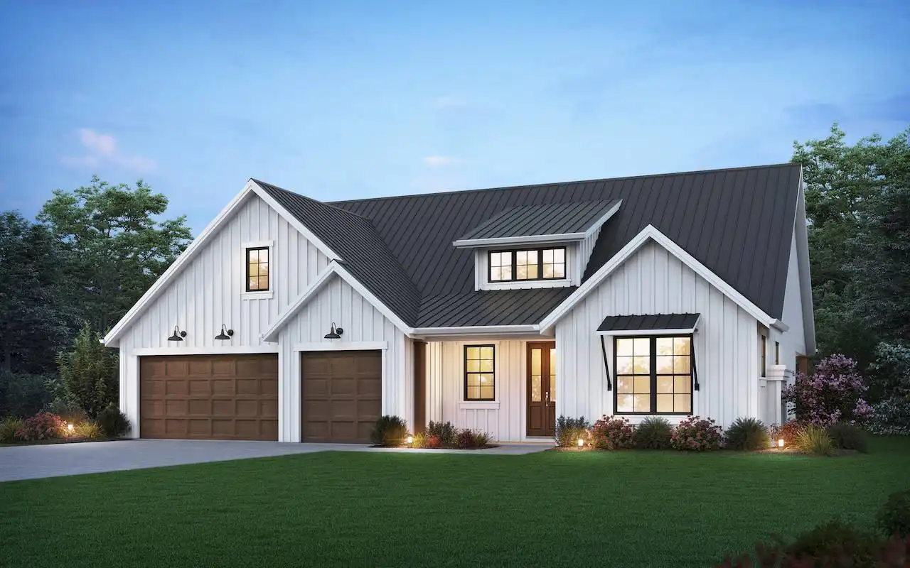 With 2,117 square feet, 3 bedrooms, and 2.5 bathrooms, House Plan 6654 checks the boxes for most modern families. The single-level layout and neat farmhouse curb appeal also cater to today's tastes! Inside, the section beside the three-car garage includes a small office, a vaulted great room, an L-shaped kitchen with an island, and the dining room. The unique layout has a casual feel in front and is a bit more formal in back, so you can host however you like! All three bedrooms are in a hallway behind the garage for privacy from the street. First, there's the master suite with a spacious five-piece bath and walk-in closet. Then there's the laundry room, centrally located for convenience. The two secondary bedrooms share a divided Jack-and-Jill bath. House Plan 6654 has a wonderfully balanced design that everybody can appreciate!