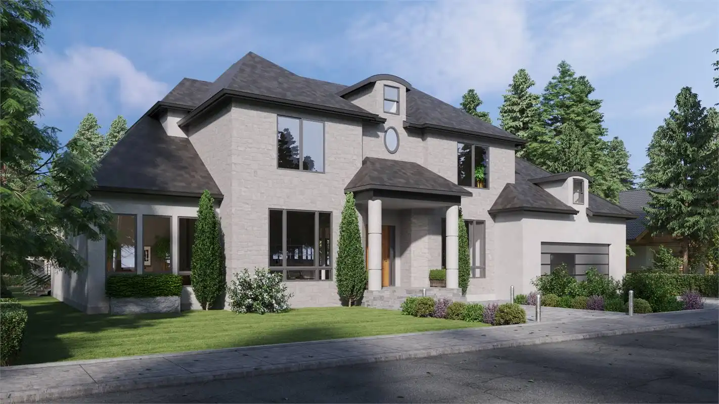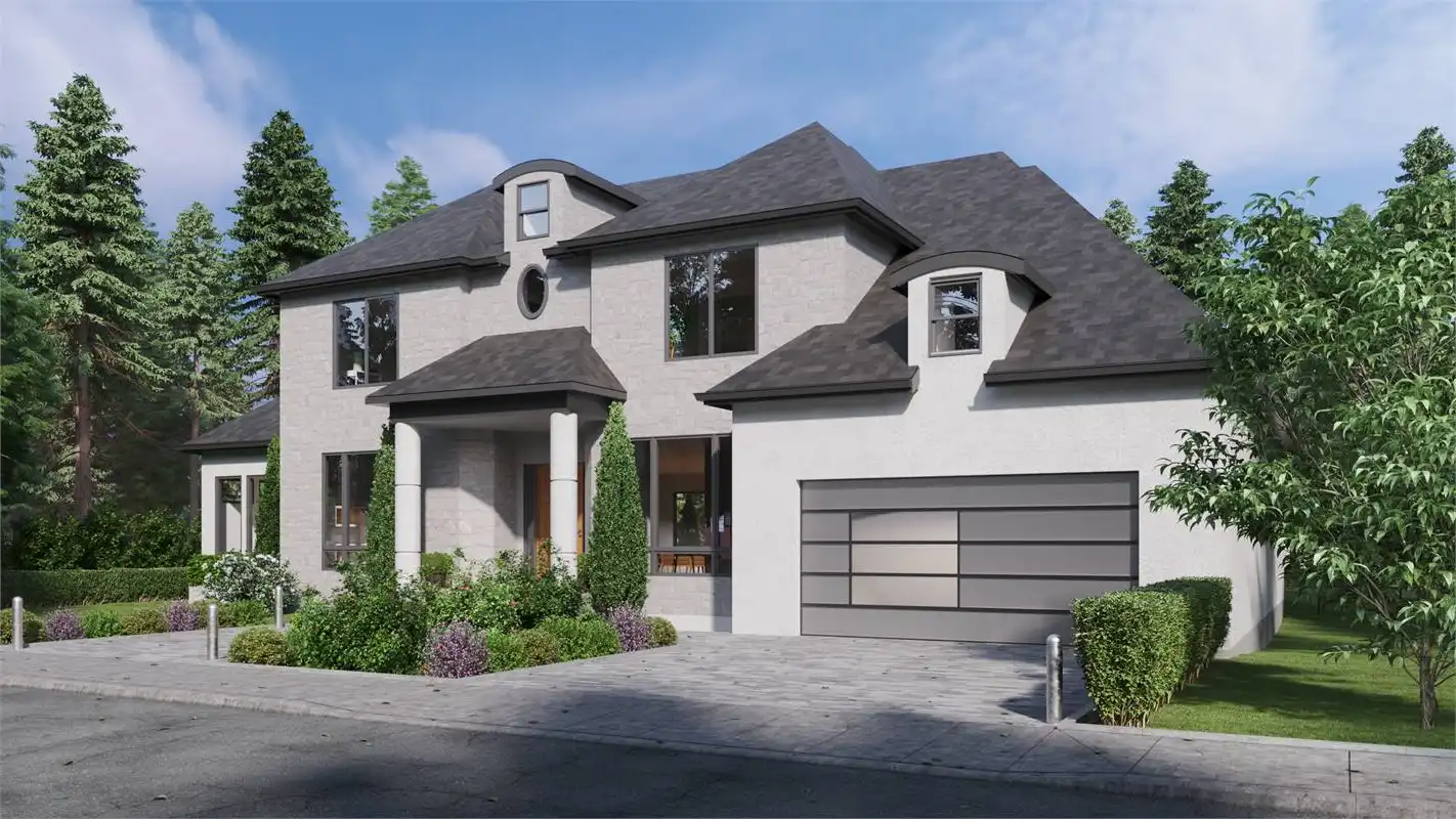 House Plan 6670 showcases contemporary style with a layout that balances openness, privacy, and everyday comfort. The exterior stands out with a raised seam metal roof, while double entry doors lead into a welcoming foyer flanked by a home office and formal dining room. The rear facing great room is warm and inviting, anchored by a fireplace with built ins and large windows that bring in natural light and backyard views. An oversized opening leads into the kitchen, maintaining an open feel while clearly defining each living area. The kitchen includes a T shaped island with seating for casual dining and a nearby pantry that offers plenty of storage. A main floor guest suite provides convenience and flexibility, ideal for hosting overnight visitors. Upstairs, the remaining bedrooms are thoughtfully arranged alongside a dedicated laundry room. The primary suite is generously sized and features a luxurious bathroom with a freestanding tub and an expansive walk in closet. With 4,505 square feet of living space, this two story design is well suited for modern family living.