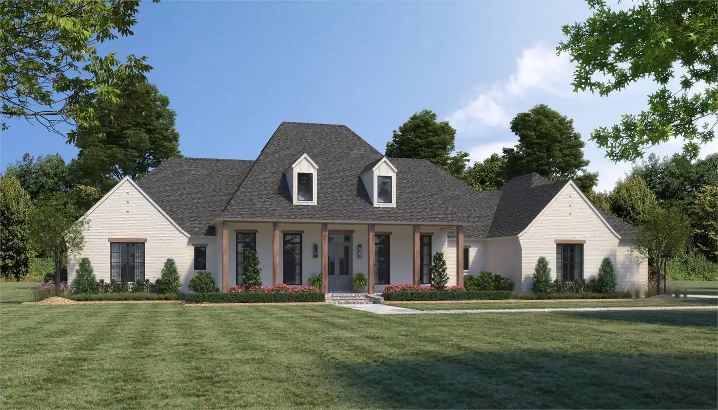 Indulge in luxury living with this stunning Acadian style home, boasting a generous 3,514 square feet of living space. The oversized primary bedroom is a standout feature with its impressive 11-foot tray ceiling, en-suite bathroom, and large primary closet. The bathroom is complete with separate vanities, a substantial shower, and a freestanding tub. The three additional guest bedrooms offer ample space, with a Jack and Jill bathroom and an extra full bathroom for guests.