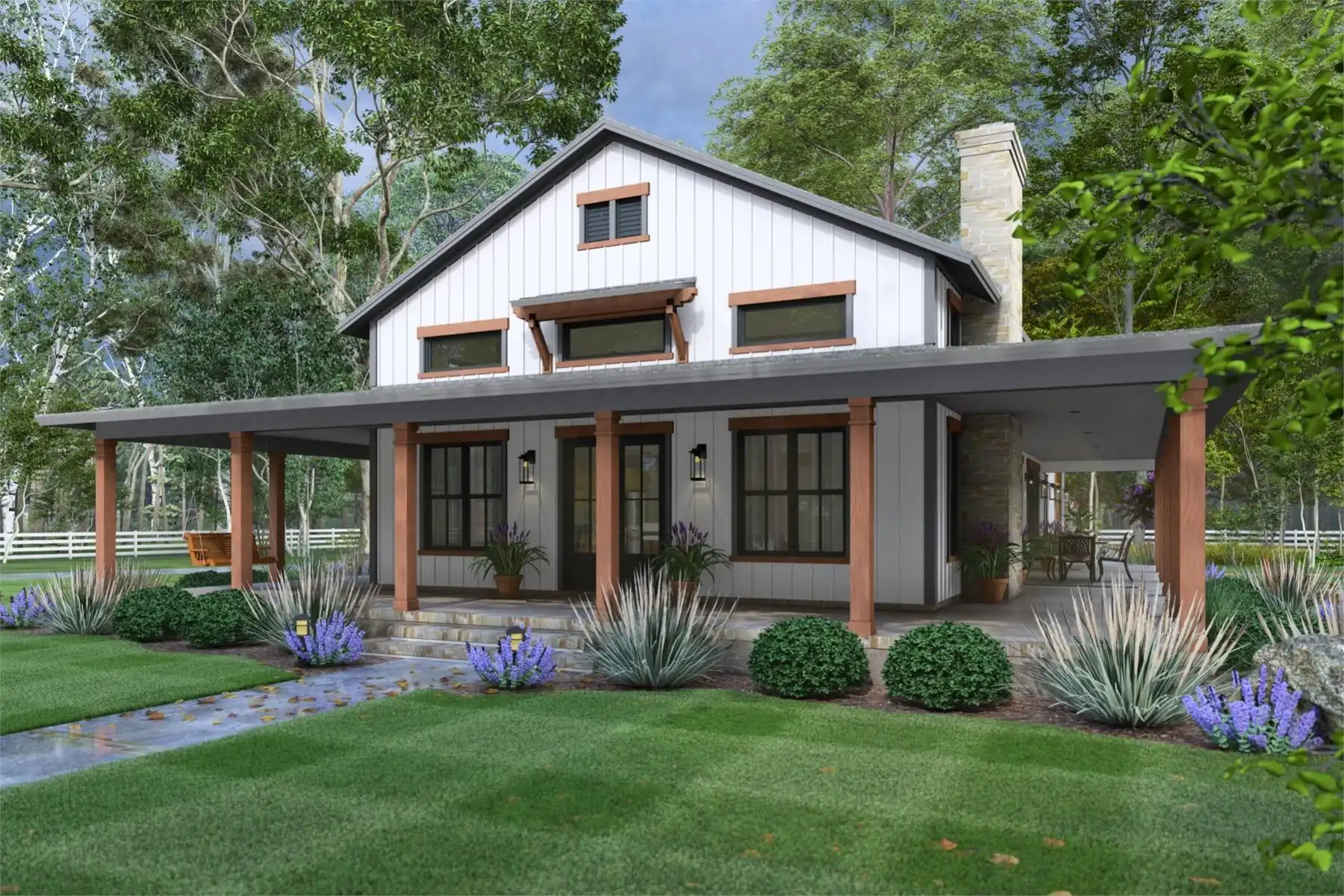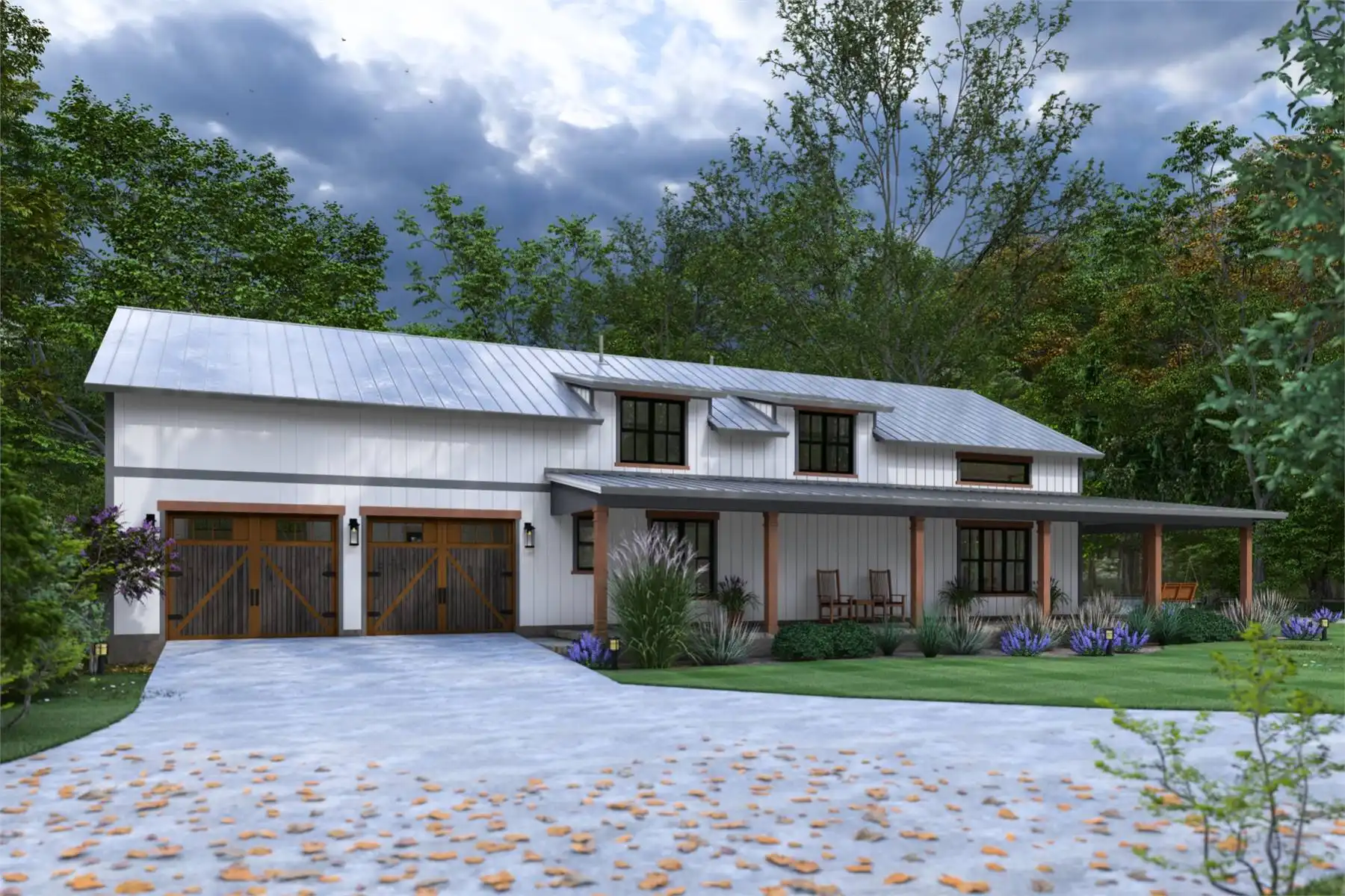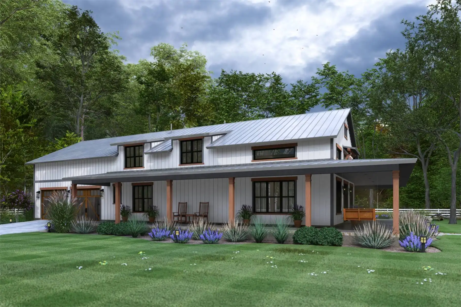 House Plan 6685 is a barndominium with a rectangular footprint that is easy to build to help keep costs low! Behind its rustic country charm complete with a wraparound porch, you'll find 2,218 square feet with three bedrooms and three bathrooms. The main level includes the primary bedroom suite and the guest suite in the hall that connects the two-car garage to the open-concept living on the other end of the house. The living area has a fireplace and vaulted ceilings and sits beside the island kitchen. The final bedroom is placed upstairs, off the loft overlooking the great room. This design spreads its spaces wonderfully to maximize the feel of the home!