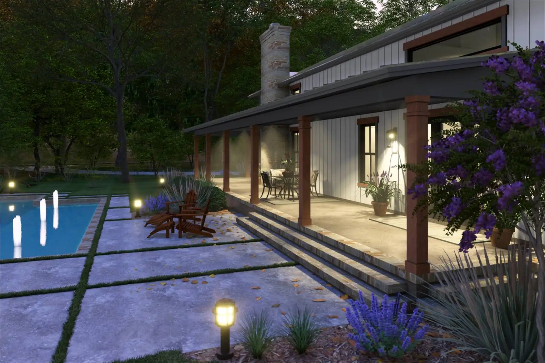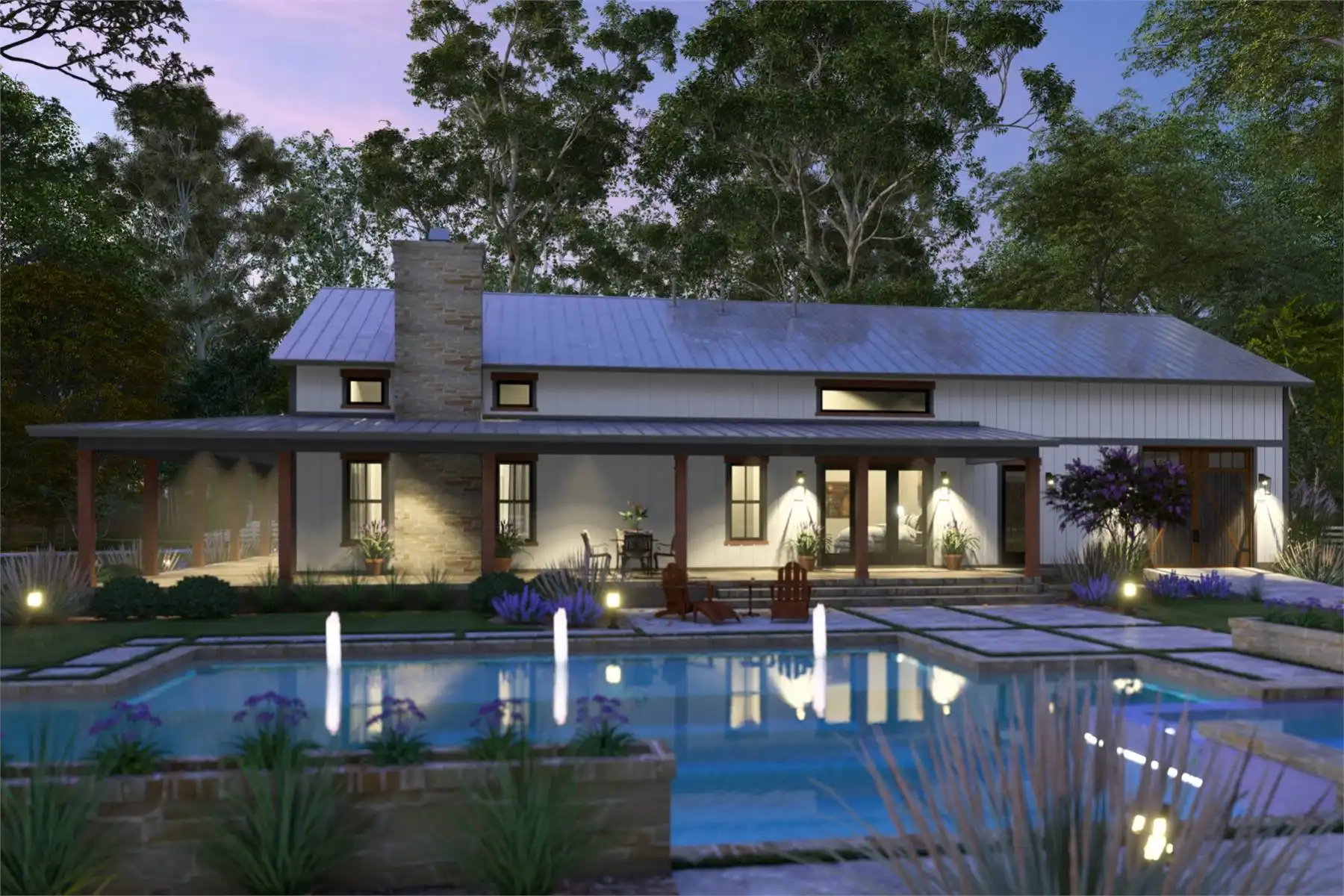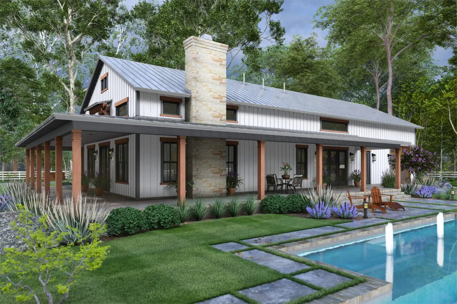House Plan 6685 is a barndominium with a rectangular footprint that is easy to build to help keep costs low! Behind its rustic country charm complete with a wraparound porch, you'll find 2,218 square feet with three bedrooms and three bathrooms. The main level includes the primary bedroom suite and the guest suite in the hall that connects the two-car garage to the open-concept living on the other end of the house. The living area has a fireplace and vaulted ceilings and sits beside the island kitchen. The final bedroom is placed upstairs, off the loft overlooking the great room. This design spreads its spaces wonderfully to maximize the feel of the home!
