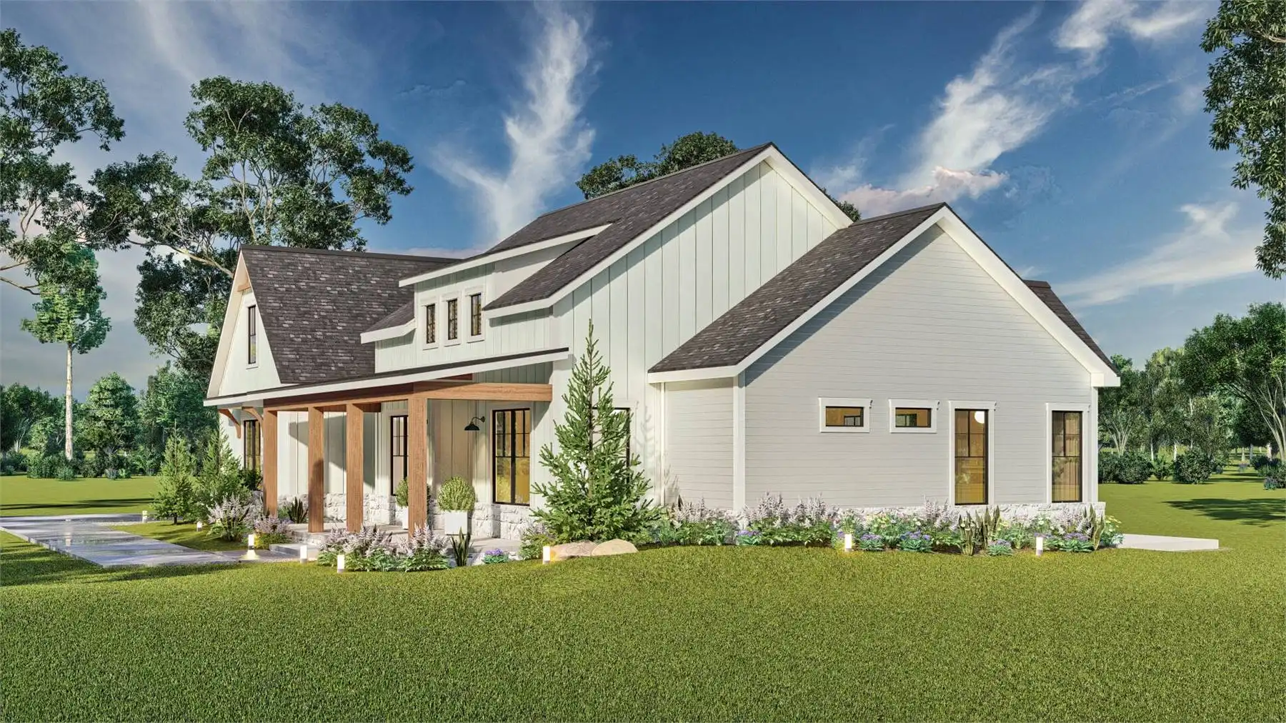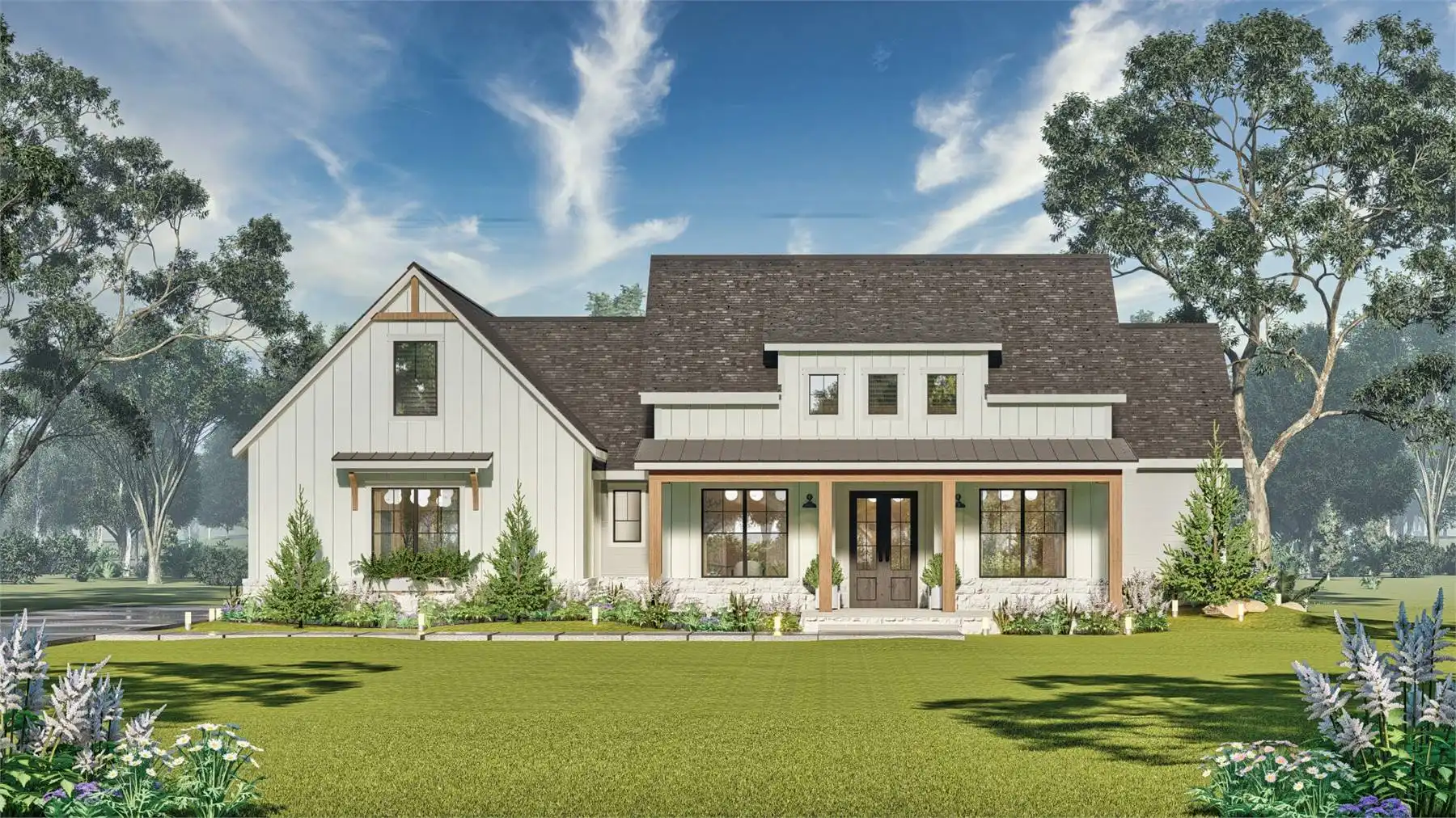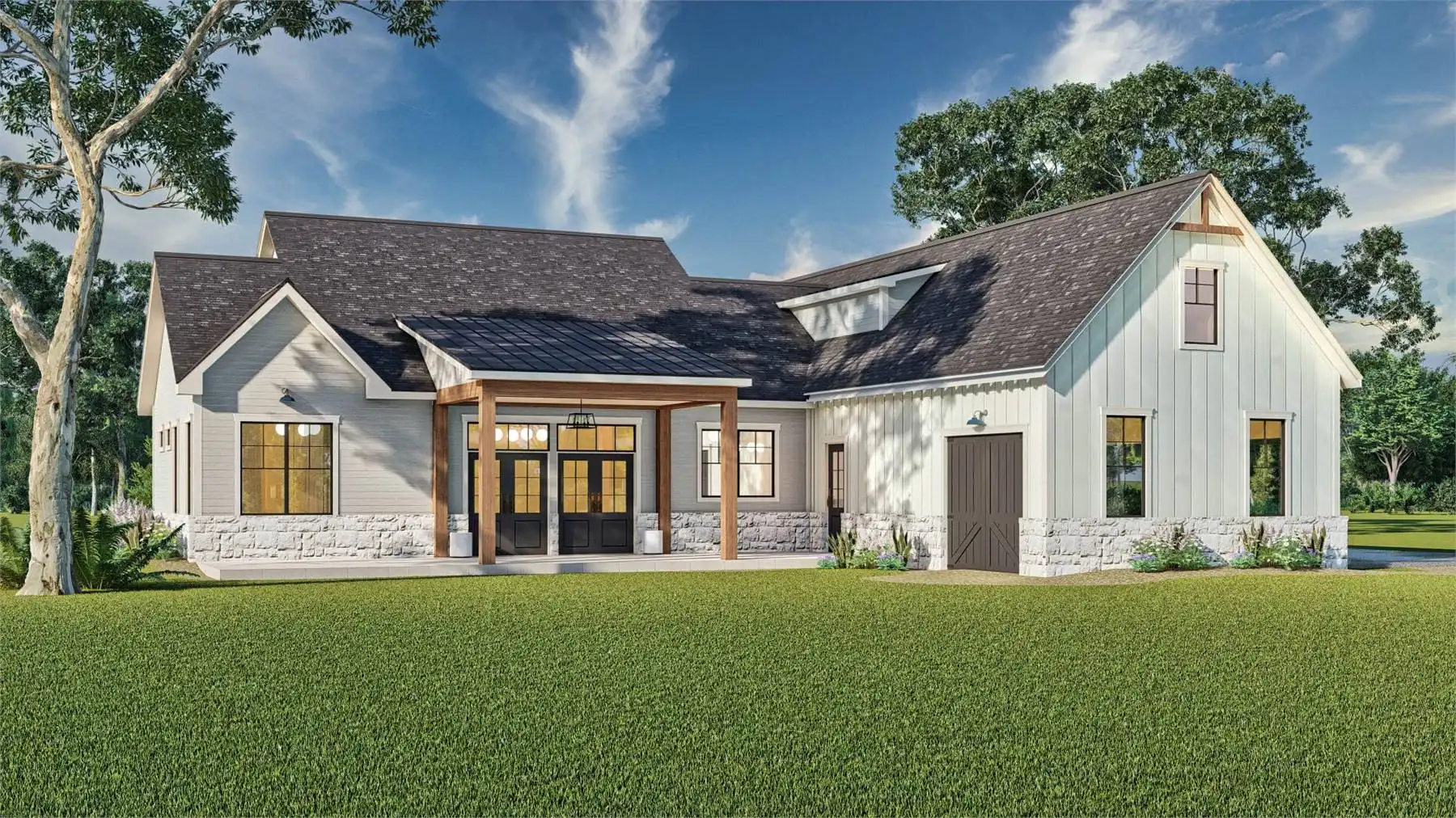 Welcome to this striking one story country house design featuring 2,473 square feet. Upon entering through the double front doors, a foyer establishes the charming ambiance of the residence. To the right, a formal dining room with a beamed ceiling beckons, creating an inviting space for hosting guests and enjoying celebratory gatherings. The core of the home lies in the open floor plan, featuring lofty ceilings in both the kitchen and great room. The great room boasts a fireplace with built-in shelves, fostering a cozy atmosphere. Double doors effortlessly connect to the screened-in rear porch and expansive open patios.The kitchen, complete with a sizable island and strategically positioned walk-in pantry, serves as a culinary haven. The opulent master suite, located on the right side, features a soaking tub between a walk-in shower and a private toilet water closet. Twin sink vanities flank the entrance to a walk-in closet, while a discreet pocket door provides access to the adjacent laundry room. On the opposite side, two additional bedrooms each offer a walk-in closet and private full bath. Discover the optional upper level, featuring a full bath off the landing and a vaulted hallway leading to two bonus rooms above the garage and master suite. To the rear, a generously sized three-car garage ensures ample space for family vehicles and storage.