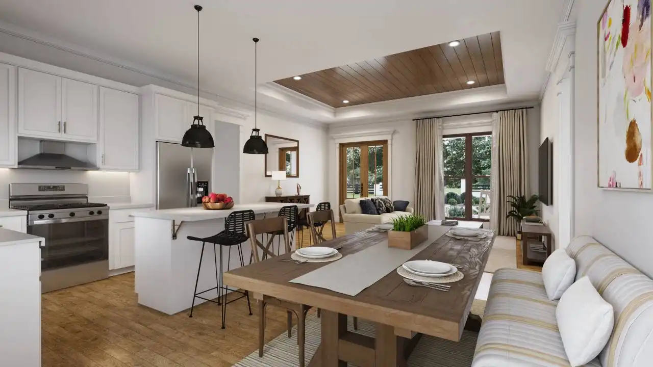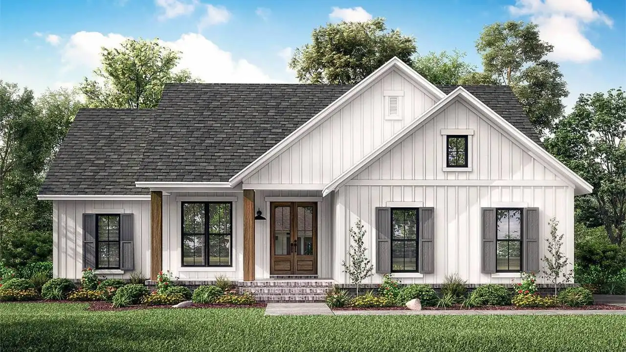 Welcome to this charming 3-bedroom country cottage, where rustic warmth meets contemporary design. The inviting front porch, adorned with charming board and batten siding and timber accents, welcomes you inside. Inside, a thoughtfully designed split bedroom layout ensures privacy while keeping the central area open for family gatherings. The kitchen takes center stage in this cottage, featuring a functional island for both cooking and casual seating. Open the sliding door to access the covered porch, seamlessly connecting indoor and outdoor spaces for relaxation or entertaining. Convenience meets style with a strategically placed laundry room by the family entry off the two-car garage. The country cottage style is evident in clean lines, a neutral palette, and a perfect mix of rustic and contemporary elements, creating a home that is comfortable, practical, and timeless. Whether you're in the kitchen, on the porch, or enjoying family time in the open central area, this 3-bedroom country cottage is a delightful blend of charm and modern living.