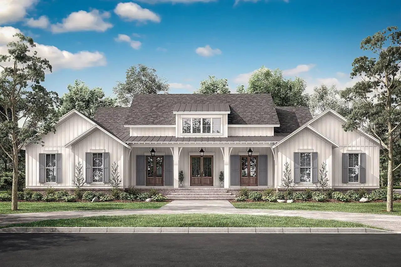 Welcome to an exquisite 3,076-square-foot modern farmhouse designed for flexible family living. The covered front porch, adorned with delightful lighting fixtures, introduces you to the inviting foyer with raised ceiling heights and exposed brick, seamlessly guiding you from the kitchen to the great room. Explore the open floor plan with 12-foot ceilings and a 13-foot tray ceiling in the dining area. The great room, featuring a central fireplace, grants access to the home office. The well-appointed kitchen caters to culinary enthusiasts with a large center island and a spacious walk-in pantry. The owner's suite offers privacy through a split bedroom layout, access to the rear porch, and an ensuite bathroom with a soaker tub and a spacious walk-in closet. Each secondary bedroom ensures comfort with ensuite access to its bathroom and walk-in closets. Lastly, the two-car garage features a practical mudroom entry, making unloading easy and organized.