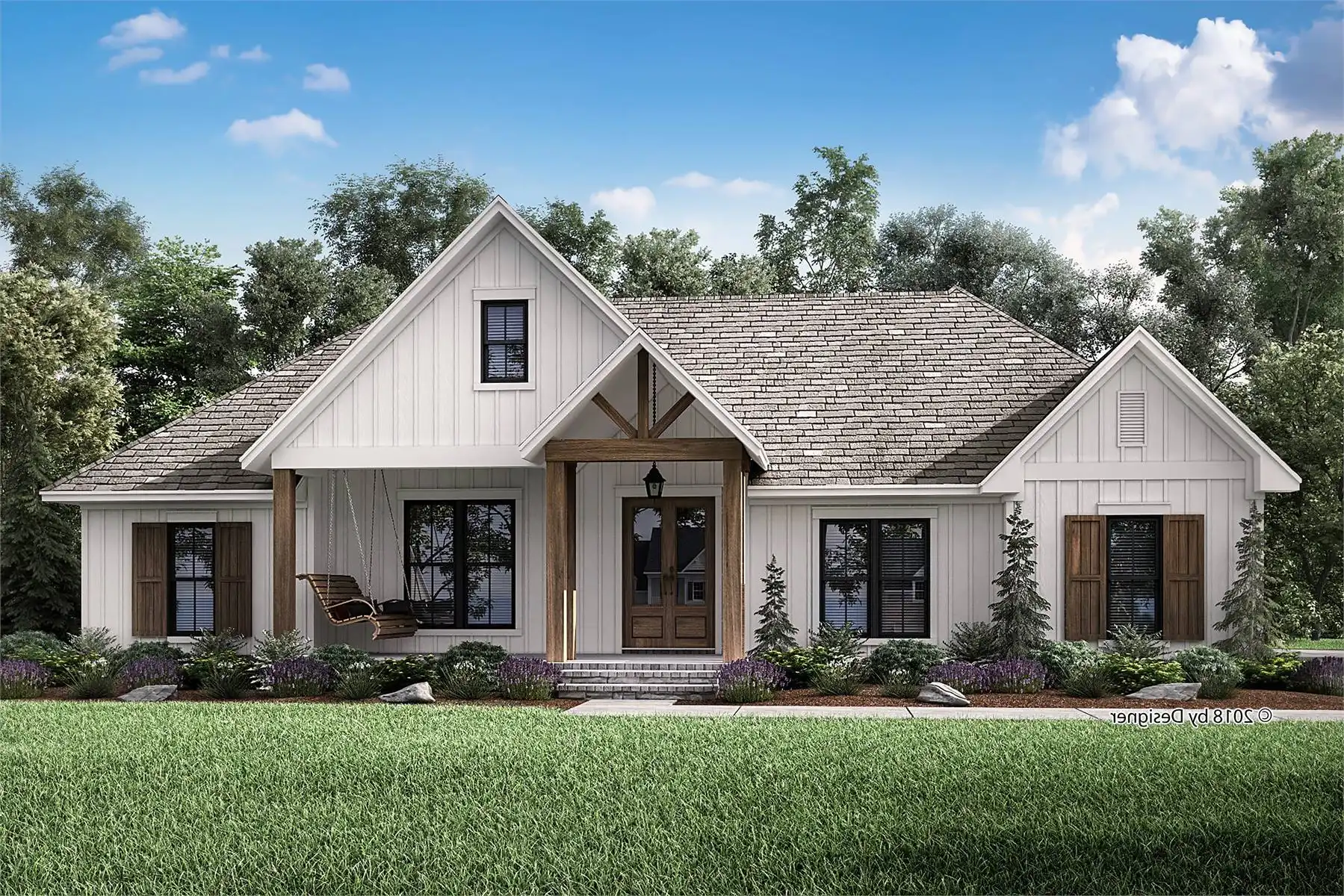 Explore this charming 2,201-square-foot farmhouse that effortlessly blends style and functionality. The front exterior features board and batten siding, charming natural wood accents, beautiful gables, and an inviting covered porch. Upon entering, the vaulted great room commands attention with built-in shelves framing the gas log fireplace. The open floor plan seamlessly guides you to the dining and kitchen area, which boasts a large island and access to the rear covered porch. The primary suite, enhanced with a tray ceiling, hosts an ensuite with a jetted tub and a spacious walk-in closet, providing private access to the adjacent laundry room. Two additional bedrooms on the main floor are located on the right side, sharing a full bathroom. Upstairs, the bonus room adds versatility, serving as a playroom, lounge area, or guest bedroom. Completing the picture is the two-car garage situated at the rear of the home.