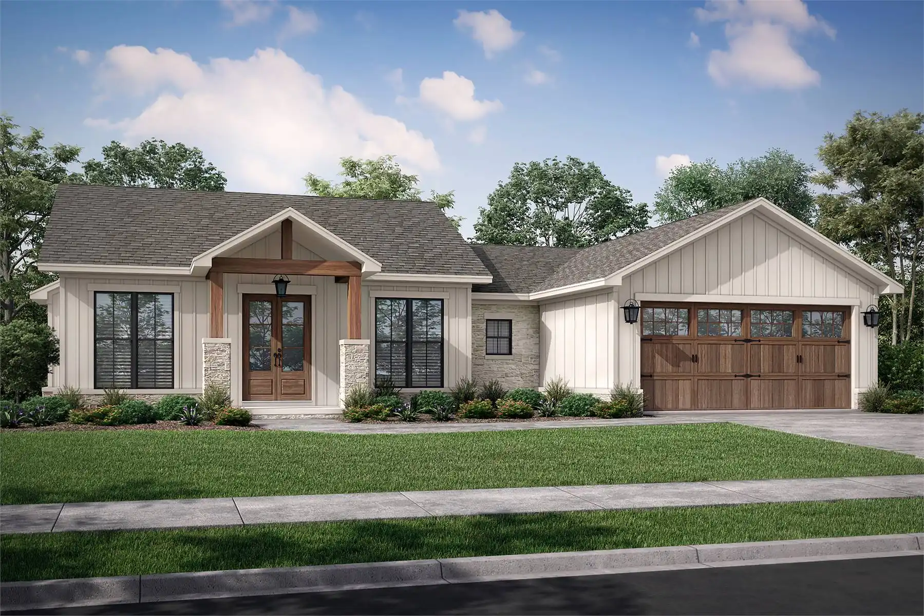 Discover the allure of this captivating 1,600-square-foot modern farmhouse, harmonizing craftsman details with a contemporary interior crafted for family living. Enter an open floor plan where the great room makes a striking impression, seamlessly connecting to the kitchen and dining area with direct access to a rear porch. A spacious walk-in pantry ensures ample storage for culinary needs. The owner's retreat boasts a generous bedroom with window views and an ensuite bath featuring a freestanding tub, custom shower, and dual vanities, complemented by a generous walk-in closet. Equally sized secondary bedrooms across the home provide ample closet space and share a full bath.