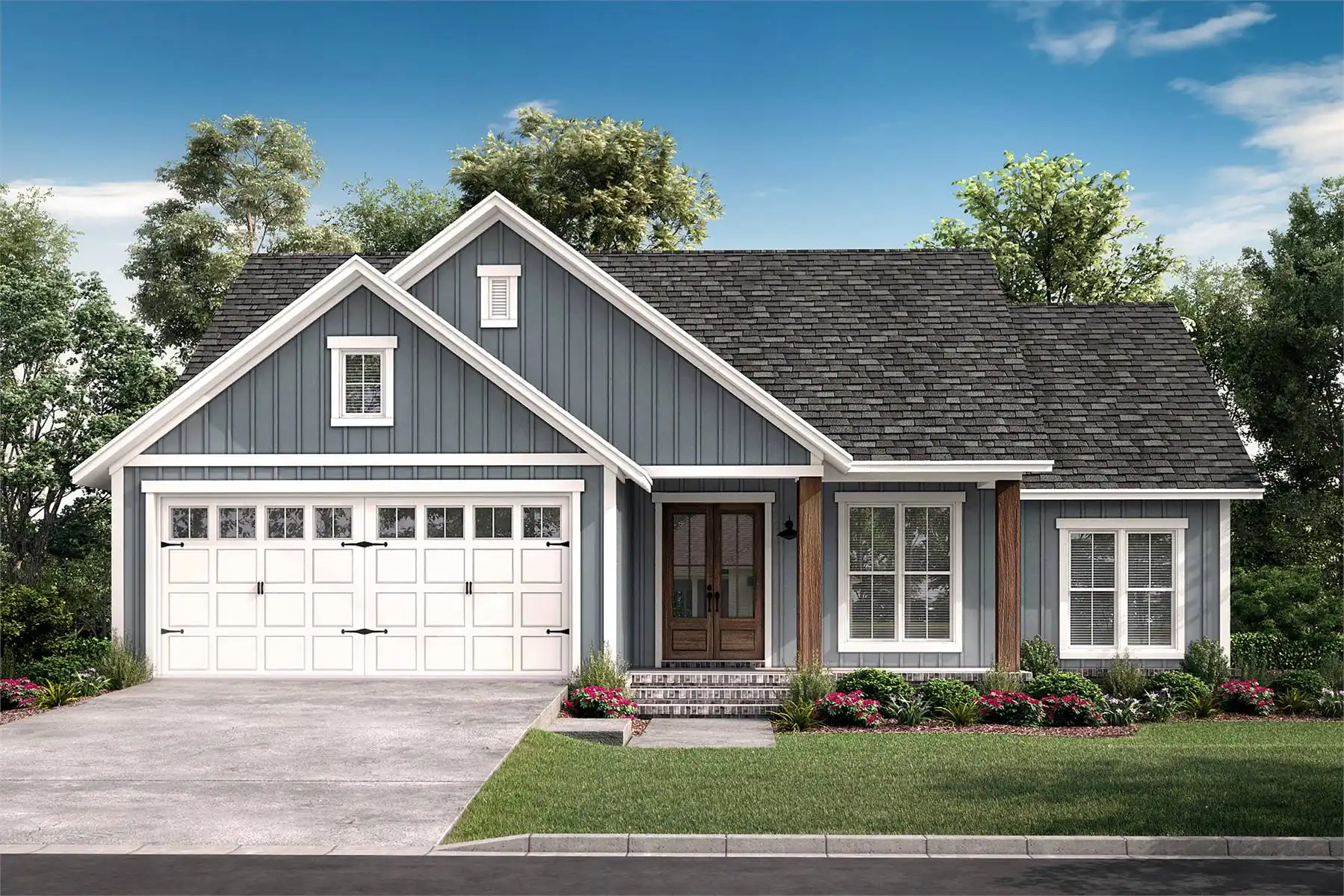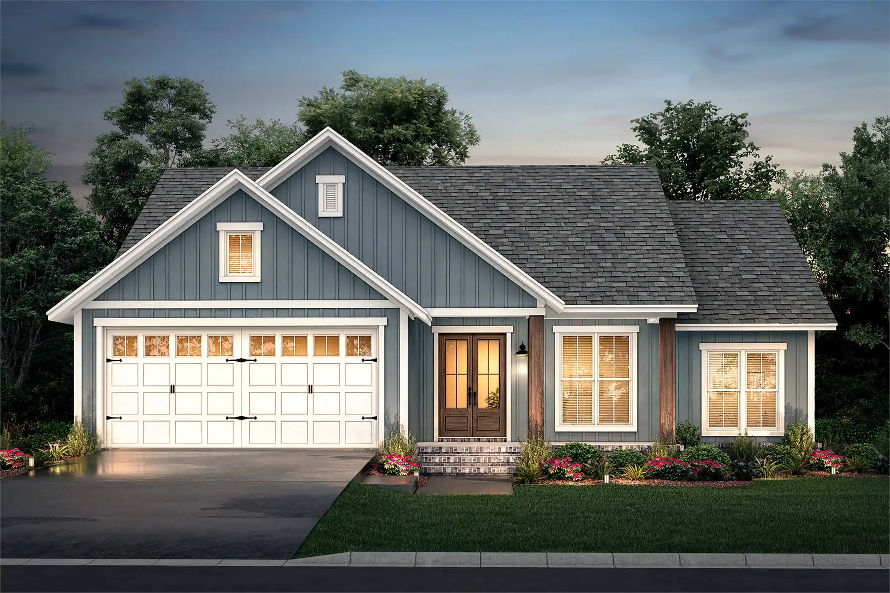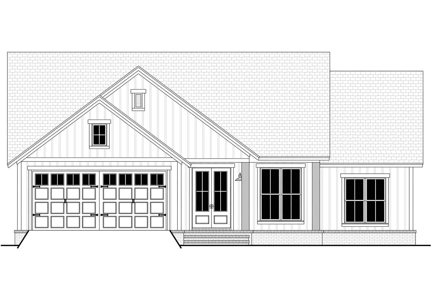 Need a neighborhood-friendly ranch of modest size? Consider House Plan 6743 with its simple footprint and 1,521-square-foot layout with three split bedrooms! It offers cute country curb appeal with porches in front and back, too. The great room makes up the heart of the home, with a trayed ceiling over the living space in front and a spacious U-shaped island kitchen in back. Two bedrooms and a shared hall bath are on one side while the master suite is tucked in the hallway with the laundry room and garage entry. This would make an awesome home for families on a budget!