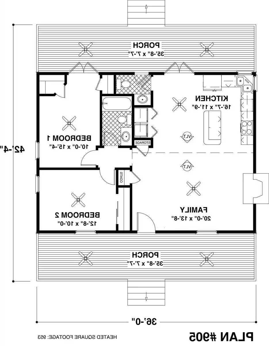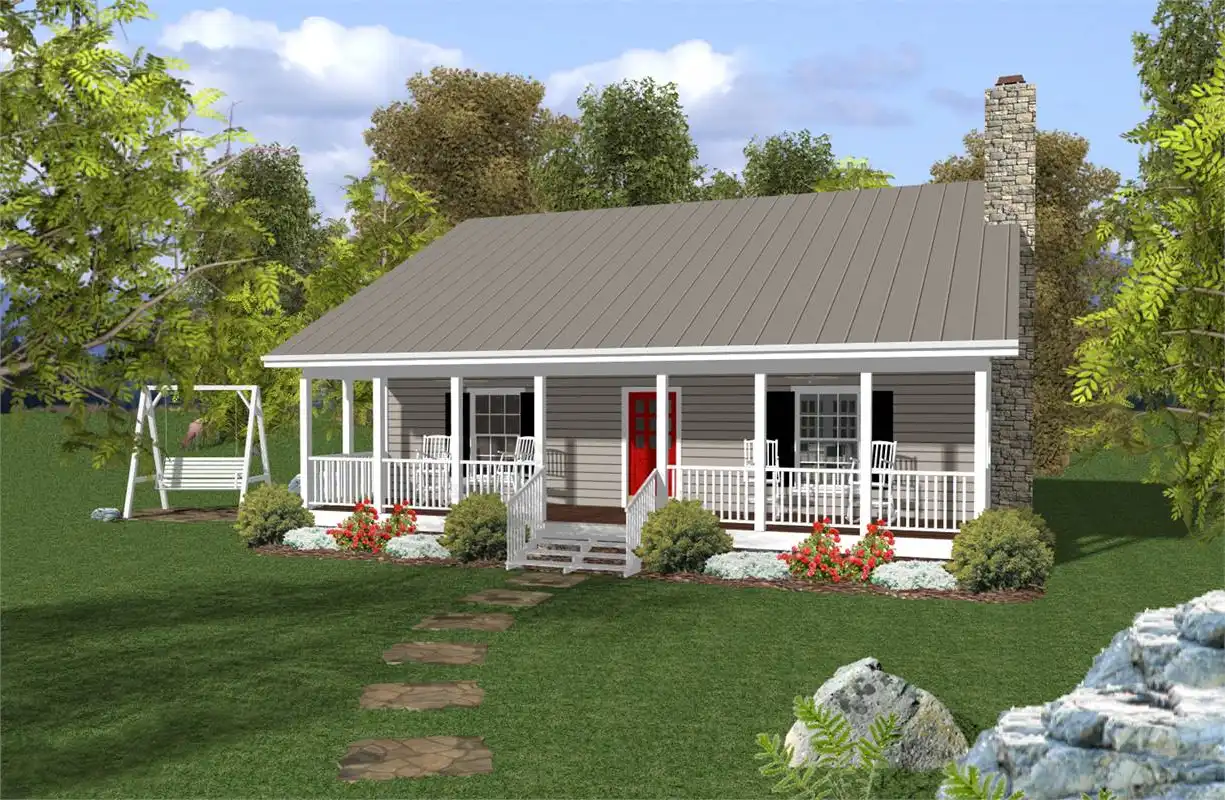 Relax on the rocking chair porches of this 953 sq. ft. retreat. With two large bedrooms with oversized closets, a spacious kitchen and family room with a fireplace, this home has everything you need to enjoy a vacation getaway. The kitchen has a sunny corner double sink, roomy center island /snack bar and shares a vaulted ceiling with the family room. Just off the kitchen are a powder room and a convenient laundry center. A hall bath rounds out this plan.