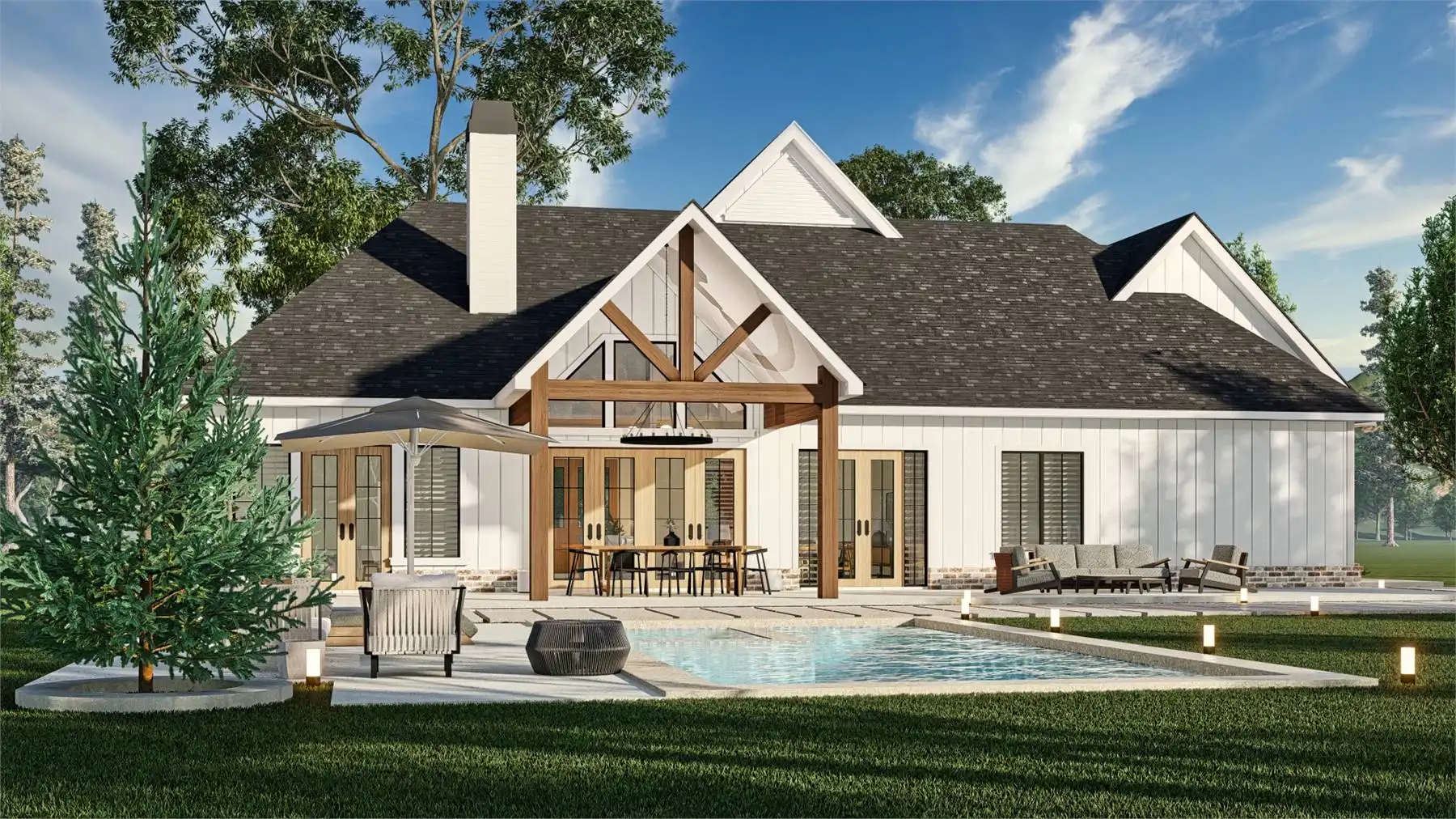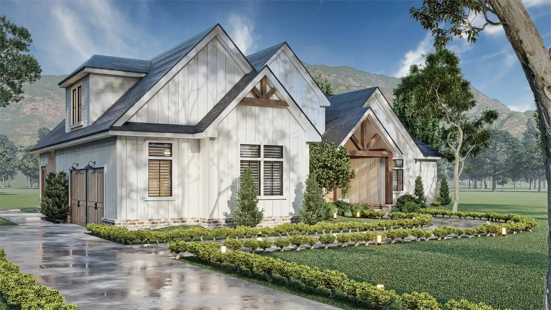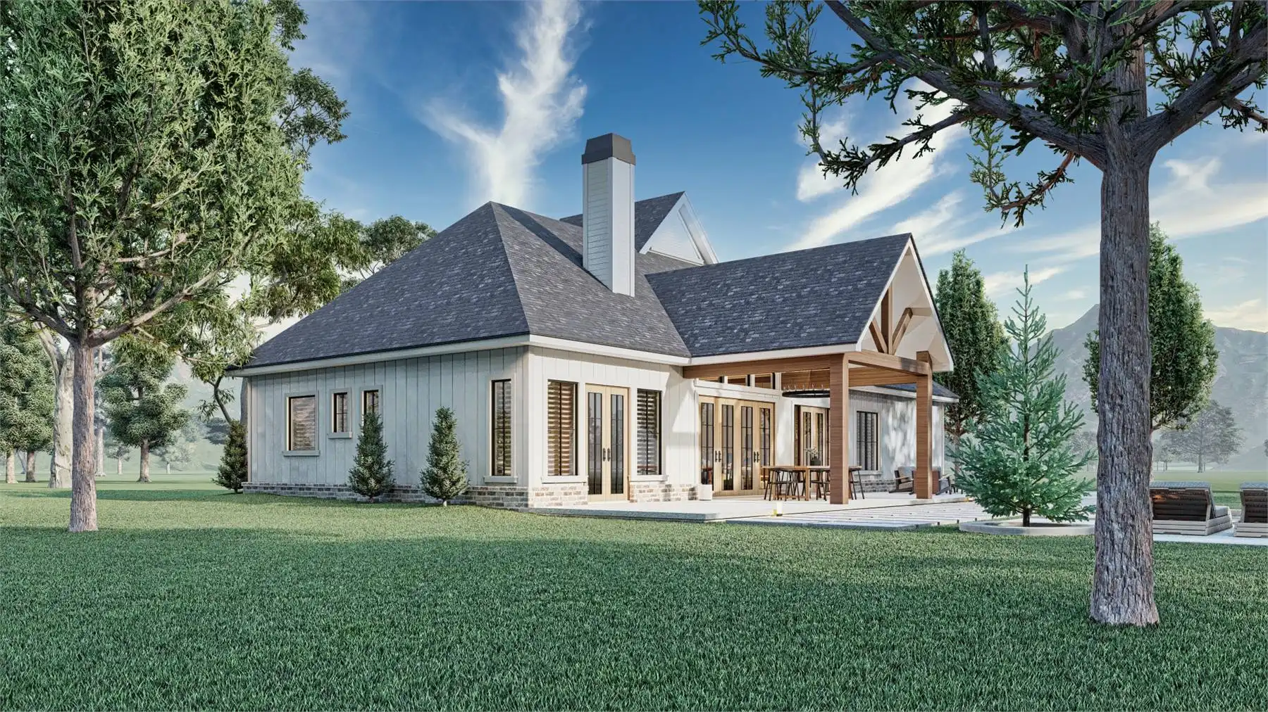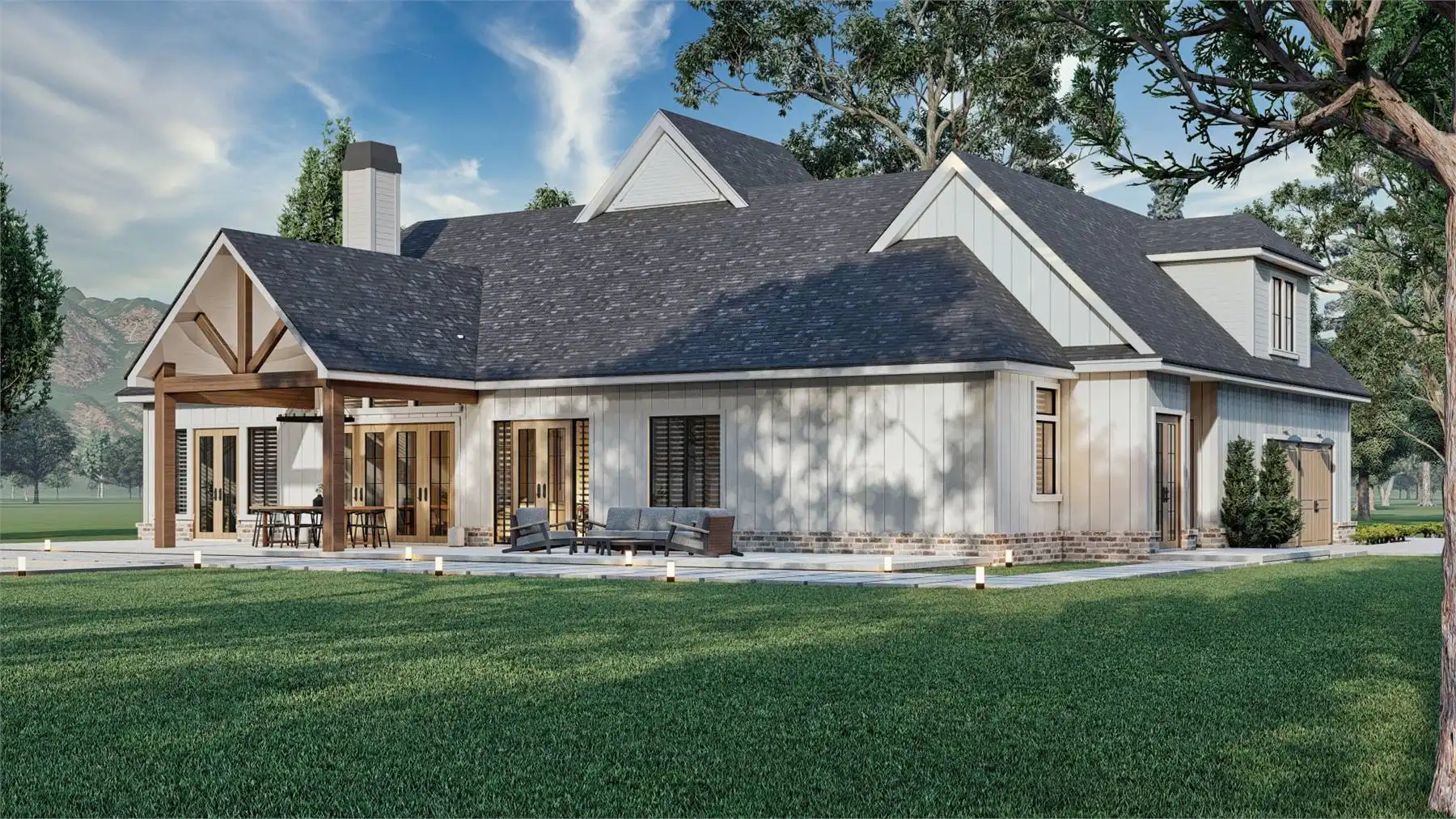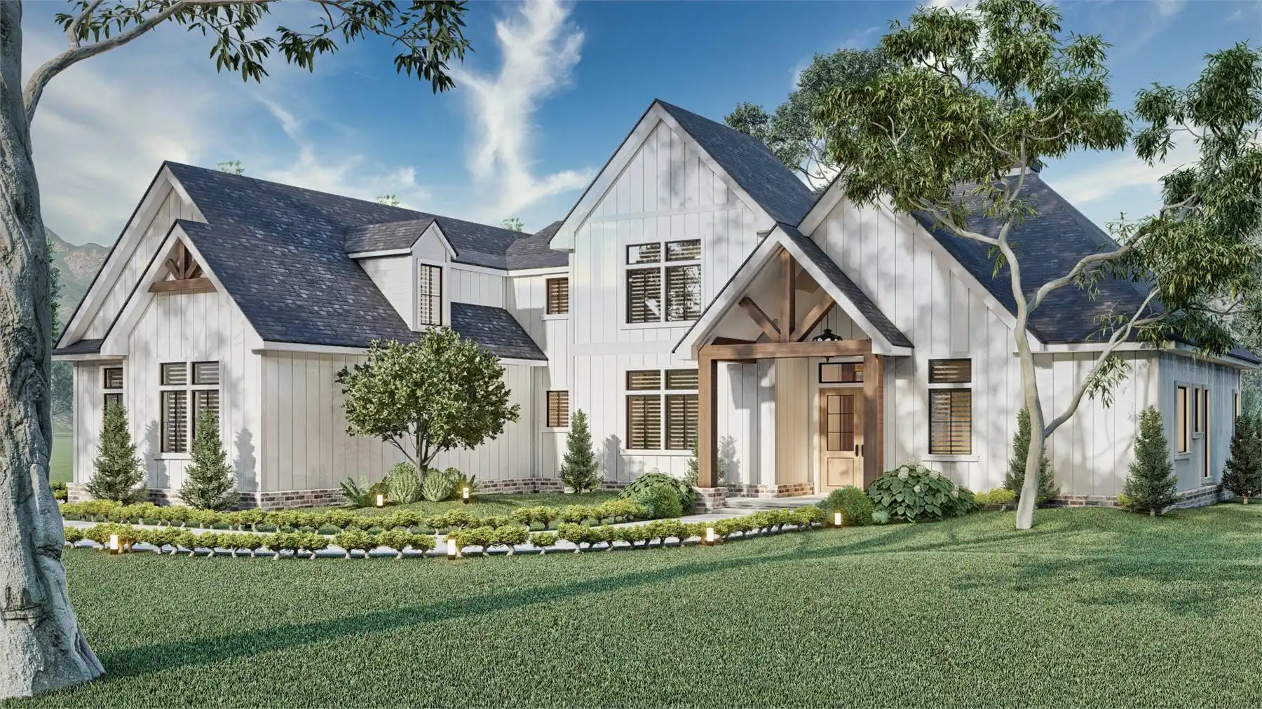 Welcome to a charming 2,091-square-foot board-and-batten farmhouse, a single-story haven that effortlessly marries rustic elegance with contemporary design. As you step through the front door, a vaulted ceiling foyer sets the tone, inviting you into the expansive open floor concept. The great room, adorned with a fireplace, seamlessly flows into the dining room and U-shaped kitchen with an island and a convenient butler pantry. The thoughtful split-bedroom layout positions the owner's bedroom on the left side, creating a private retreat complete with an ensuite and a walk-in closet. The remaining two bedrooms find their place on the opposite side of the house, ensuring optimal privacy. A magnificent outdoor patio in the rear and a covered porch beckon, providing perfect spaces to unwind and enjoy the beauty of the surroundings. With three bedrooms, two baths, and a two-car garage, this farmhouse is a harmonious blend of functional design and inviting warmth.