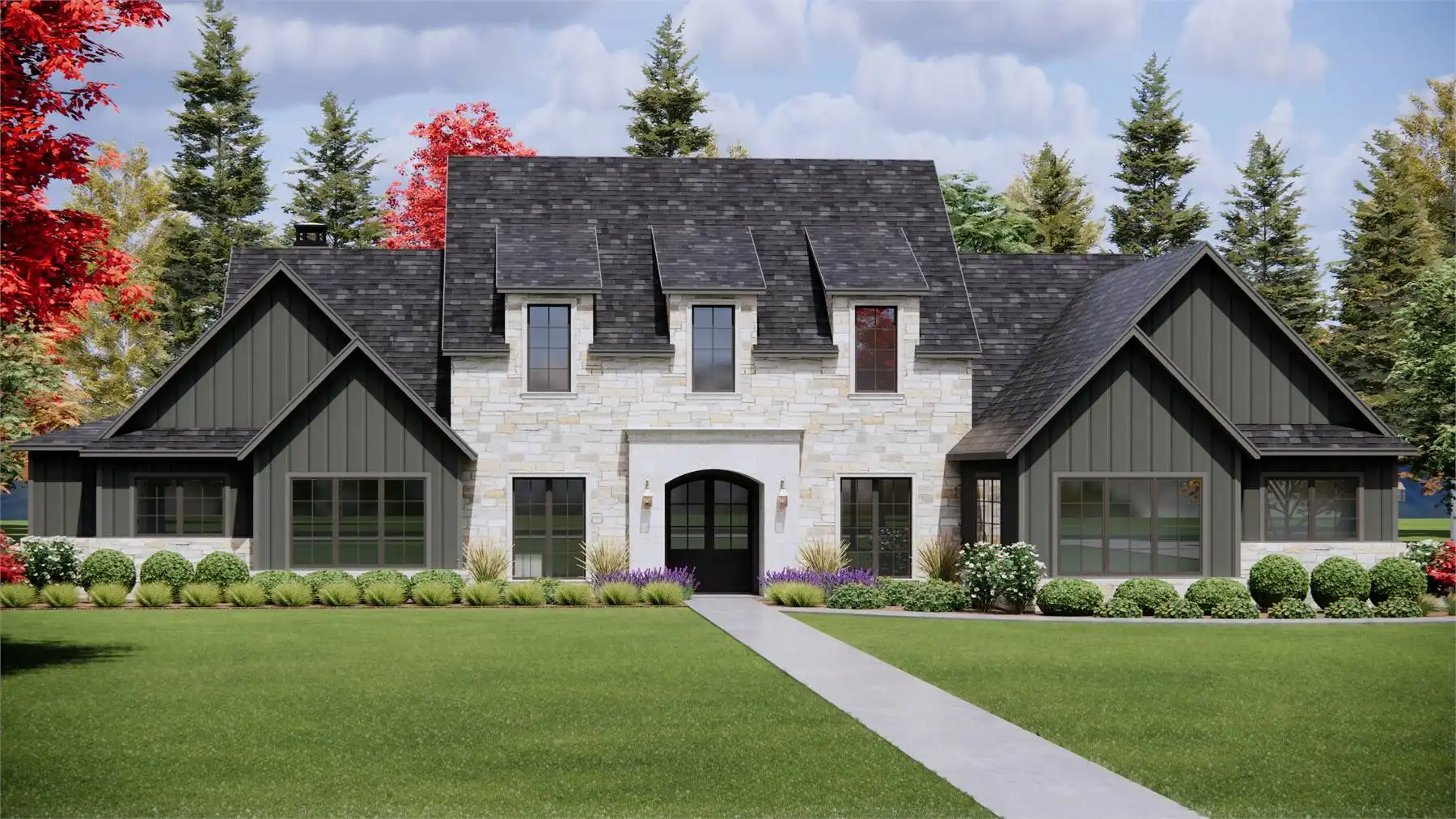 Come see what House Plan 6761 has to offer if you're in the market for a grand European home with transitional appeal! Behind this beautiful gabled and dormered facade, you'll find 4,130 square feet with four bedrooms and four-and-a-half bathrooms across two stories. The main level includes the foyer, totally open-concept great room, luxe primary suite, guest suite, and office. Two more bedroom suites and the loft are located upstairs. Make sure to notice all the storage throughout this layout as well as the spacious porch in back!