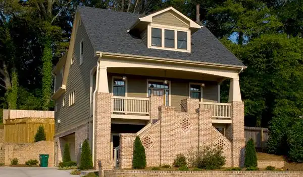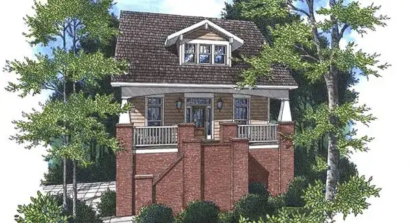 A Craftsman style bungalow with a surprise! This house is perfect for narrow lot development that has a little fall to the property. The unique garage entry allows you to fit this 30 wide plan with a side entry garage on a 45-50 wide lot. This can be built where a rear loading garage plan wouldnt work making it a great addition to a traditional type neighborhood with less than perfectly flat conditions.
