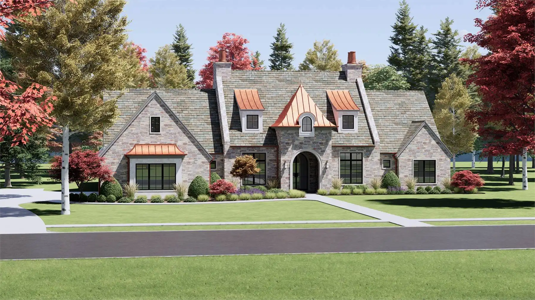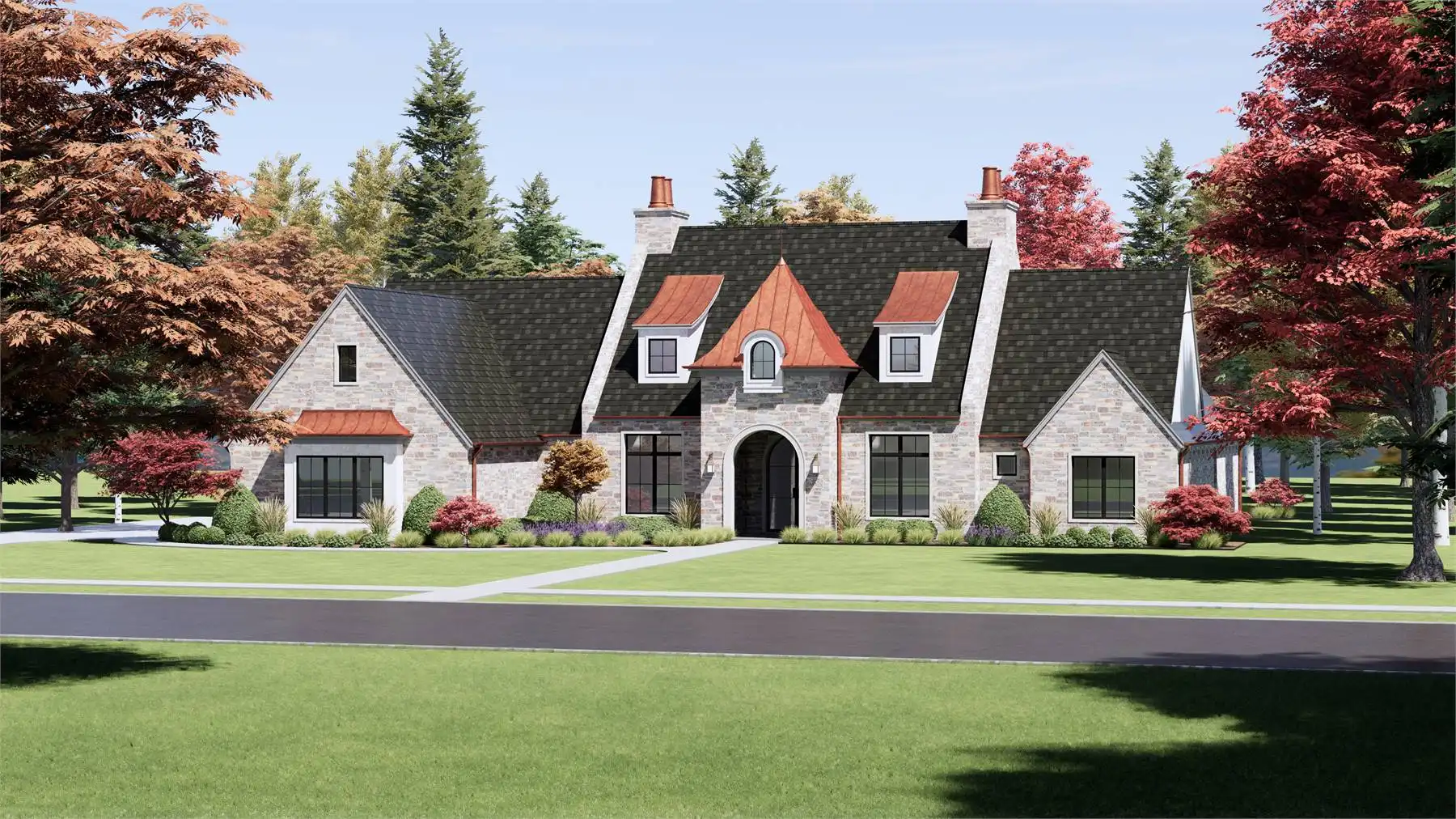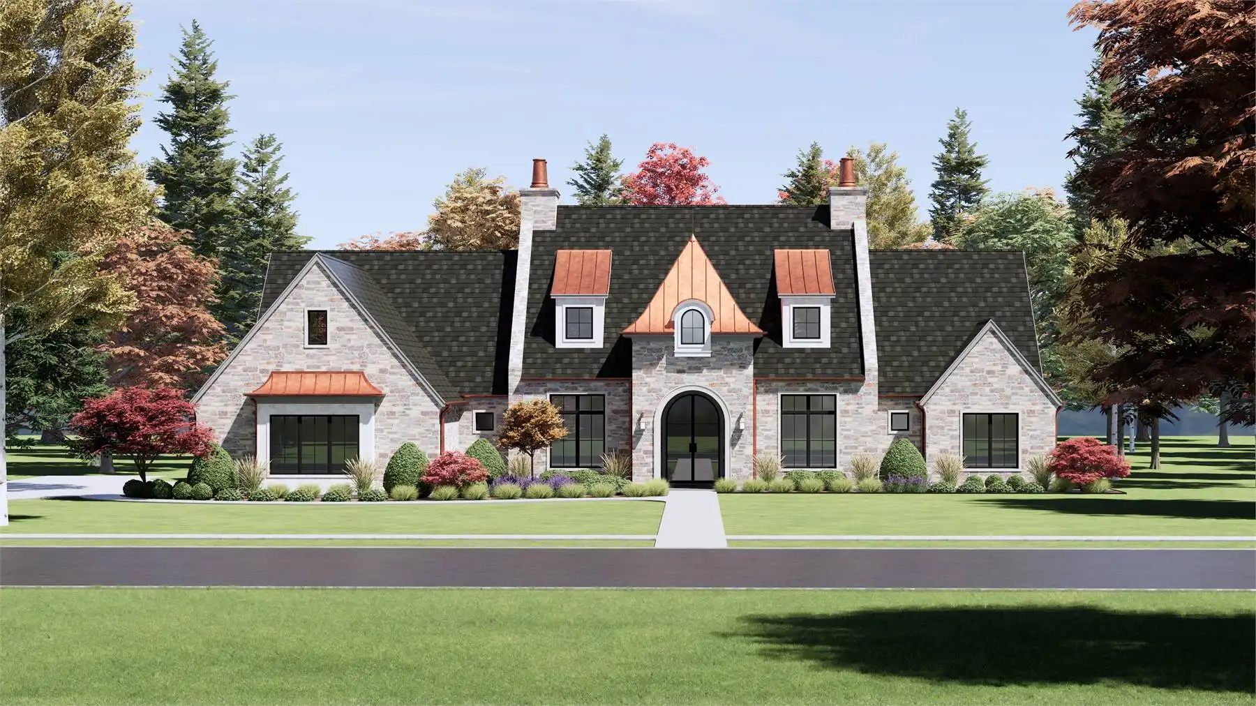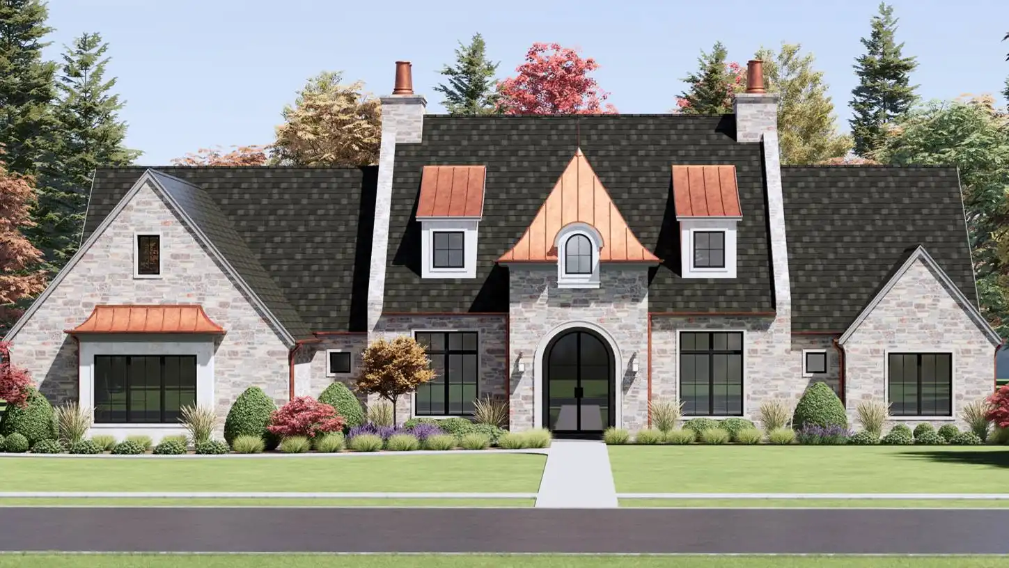 Stop and take a look at House Plan 6787 if you want a grand European ranch of French country inspiration! This 4,001-square-foot home boasts four bedrooms and four-and-a-half bathrooms across its spacious floor plan. The center of the layout is comprised of the office off the foyer and the open great room with a U-shaped island kitchen on one side that overlooks the vaulted dining and living areas. On one side, you'll find three bedroom suites and a vaulted game room. On the other, the primary suite has its privacy. It has a vaulted bedroom and five-piece bath, of course. All this comes wrapped up in beautiful old-world style including stone siding and copper roof highlights!