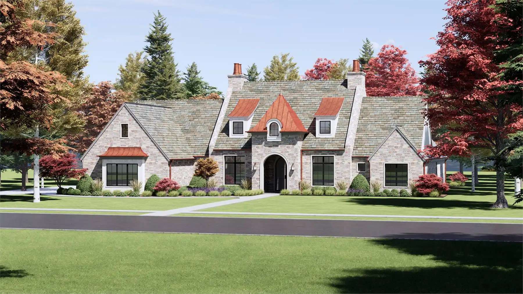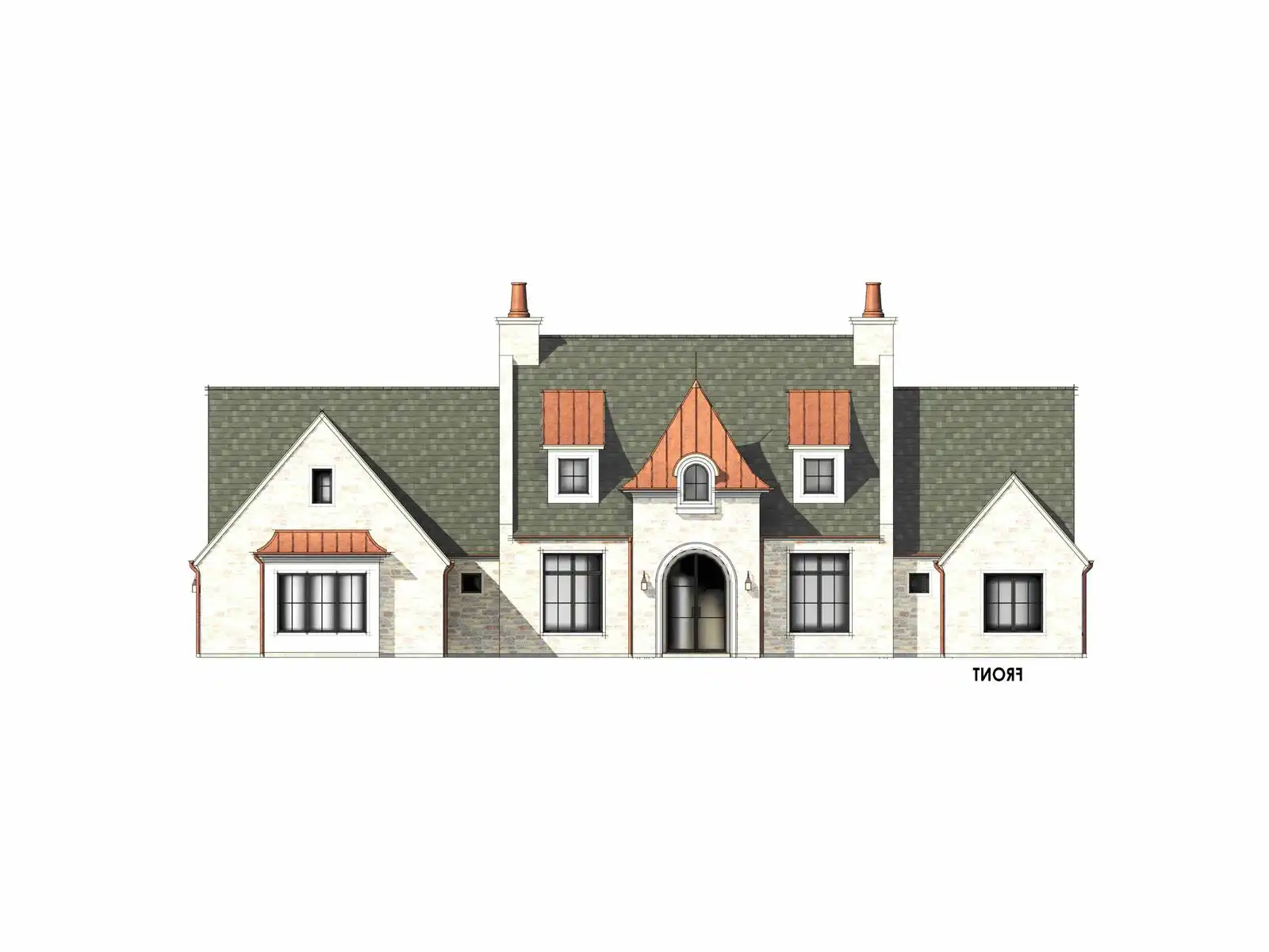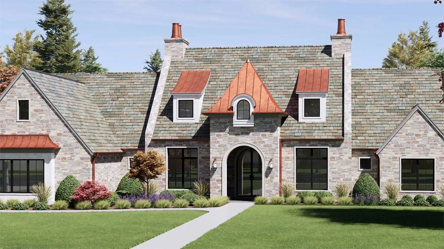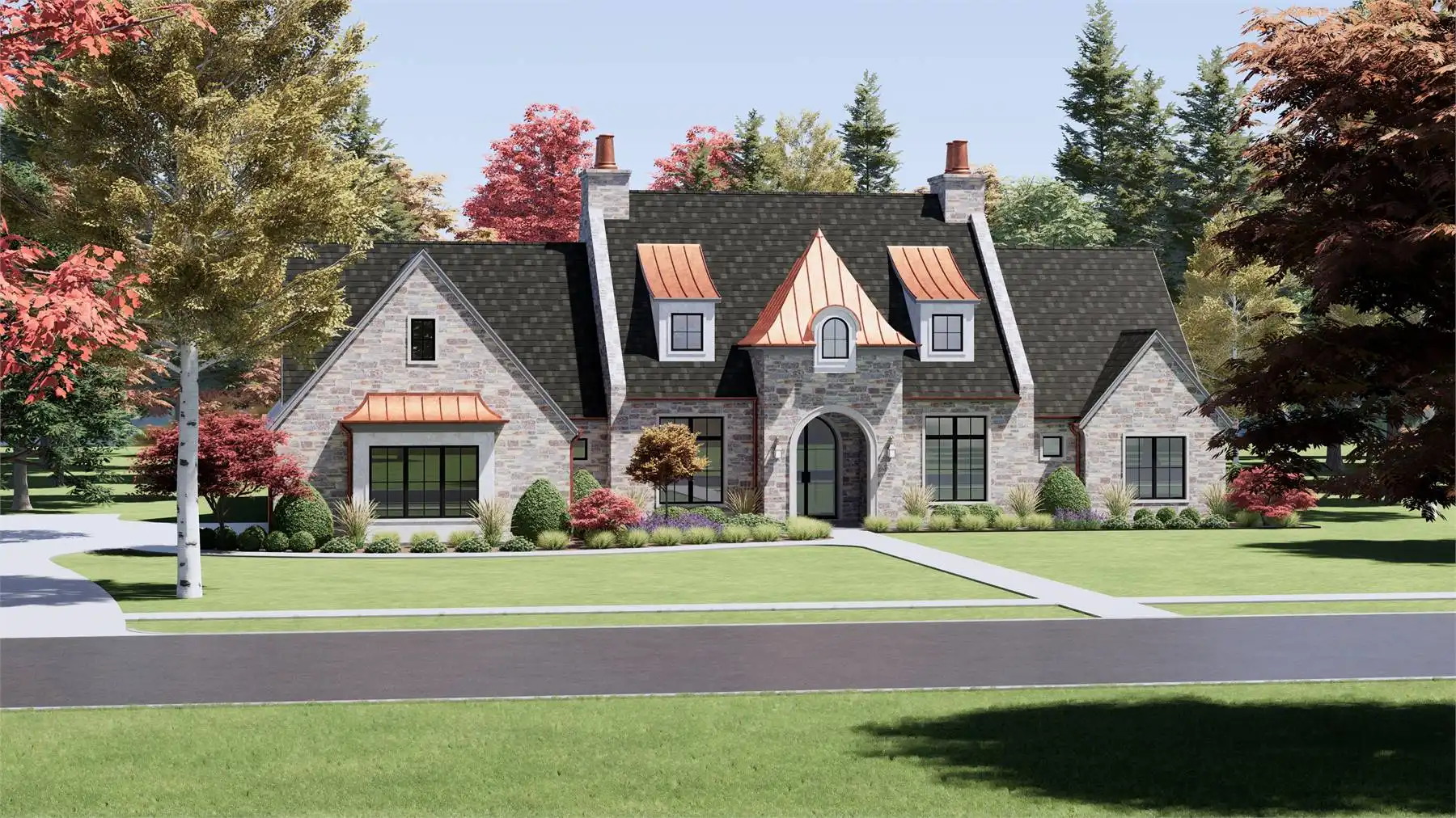 Stop and take a look at House Plan 6787 if you want a grand European ranch of French country inspiration! This 4,001-square-foot home boasts four bedrooms and four-and-a-half bathrooms across its spacious floor plan. The center of the layout is comprised of the office off the foyer and the open great room with a U-shaped island kitchen on one side that overlooks the vaulted dining and living areas. On one side, you'll find three bedroom suites and a vaulted game room. On the other, the primary suite has its privacy. It has a vaulted bedroom and five-piece bath, of course. All this comes wrapped up in beautiful old-world style including stone siding and copper roof highlights!