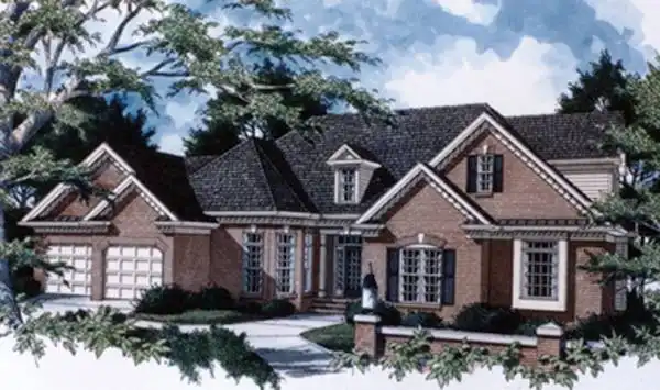 This stylish brick home is accented by the turret effect of the dining room bay creating a romantic old world feel. A dormer window from above lights the two-story entry, showcasing angled entries to the formal rooms. An open flow to the casual area of the house makes the people in the kitchen feel a part of all that transpires as they face the angled fireplace from the kitchen sink. The oversized pantry takes care of every overflow need. The master suite features a sitting area with privacy deck. The angled entry into the master bath shows off the garden tub flanked by his and hers vanities. An enormous walk-in closet features its own window seat. The second floor includes two spacious bedrooms that share a jack and jill bath. Along with first floor universal design, the staircase is wide enough to accommodate a chair lift making the entire plan accessible.