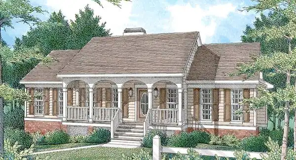 Country charm describes this split bedroom drive under design. The large front porch creates the perfect place to sit and rock while visiting with passing neighbors. A modified cathedral ceiling opens up the center of the house where the fireplace acts as a room divider for the dining room. Even in the small space there is a separate breakfast room.