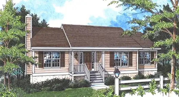 Simple country roof lines create the feel of a full porch. But upon entering, the cathedral ceiling in the living room creates a dramatic fireplace wall. A u-shaped kitchen provides plenty of counter space and storage. The laundry closet is conveniently located in the hall, minimizing transportation of dirty clothes. The cathedral ceiling in the master suite creates a plant shelf that expands the size of this room making it feel larger than it is. The master bath has a luxurious garden tub with an over-sized spa-like shower head.