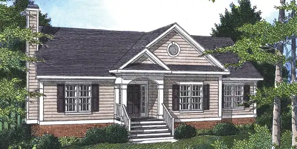 An elegant covered entry creates a grand feel for this compact design. The cathedral ceiling in the living room creates a dramatic fireplace wall. The u-shaped kitchen provides plenty of counter space and storage. The laundry closet is conveniently located in the hall, minimizing transportation of dirty clothes. The cathedral ceiling in the master suite creates a plant shelf that expands the size of this room, making it feel larger than it is. The master bath has a garden tub with a showerhead allowing for the luxury of the oversized tub while enjoying an oversized shower as well.