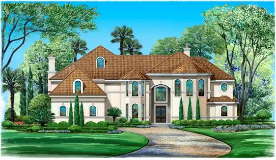 The perfect Mediterranean luxury house plan ends here. Entering the two-story Foyer, your eyes are immediately drawn to the curved staircase and large decorative pillars that divides the Dining room and the Living room. The Living room is directly ahead of the Foyer and has built-ins that flank the fireplace and is accompanied by a large bank of windows for great views of your backyard. The elegant Dining room is to the right of the Foyer, and is in close proximity to the pantry and Kitchen, ideal for serving dinner to family or guests. The Family gathering area consists of the gourmet Kitchen, a cozy Breakfast area and the Family room. The family room has many built-in shelves that are on either side of the warming fireplace. The Kitchen's island adds to the counter space and houses the cook top stove, while the two peninsula bars separate the Kitchen from the Breakfast area. Just behind the Breakfast area and Family room is a large patio, which provides some much needed shade in the summer's heat. The luxurious master suite boasts a bayed window and a lavish master bathroom that features his and hers vanity sinks, a separate shower, a garden tub, and a spacious wardrobe. To finish up the first floor of this house plan is a three car garage and a small storage space. On the second floor are three family bedrooms, all complete with a walk-in closets and a full bathroom. Also located upstairs is the Game room, Study, a large Storage room, and a Media room with its own small balcony. You'll enjoy the view of the Foyer and Living room as you look down on them from the loggia; you'll also enjoy the view of the backyard with the large outdoor lounge, which completes this luxurious Mediterranean style home.