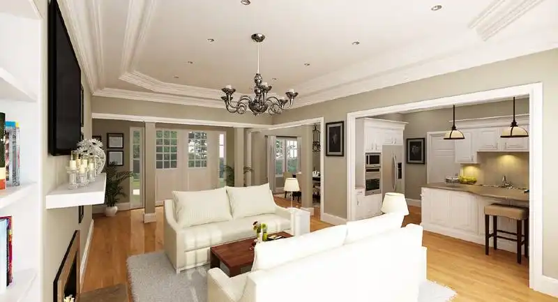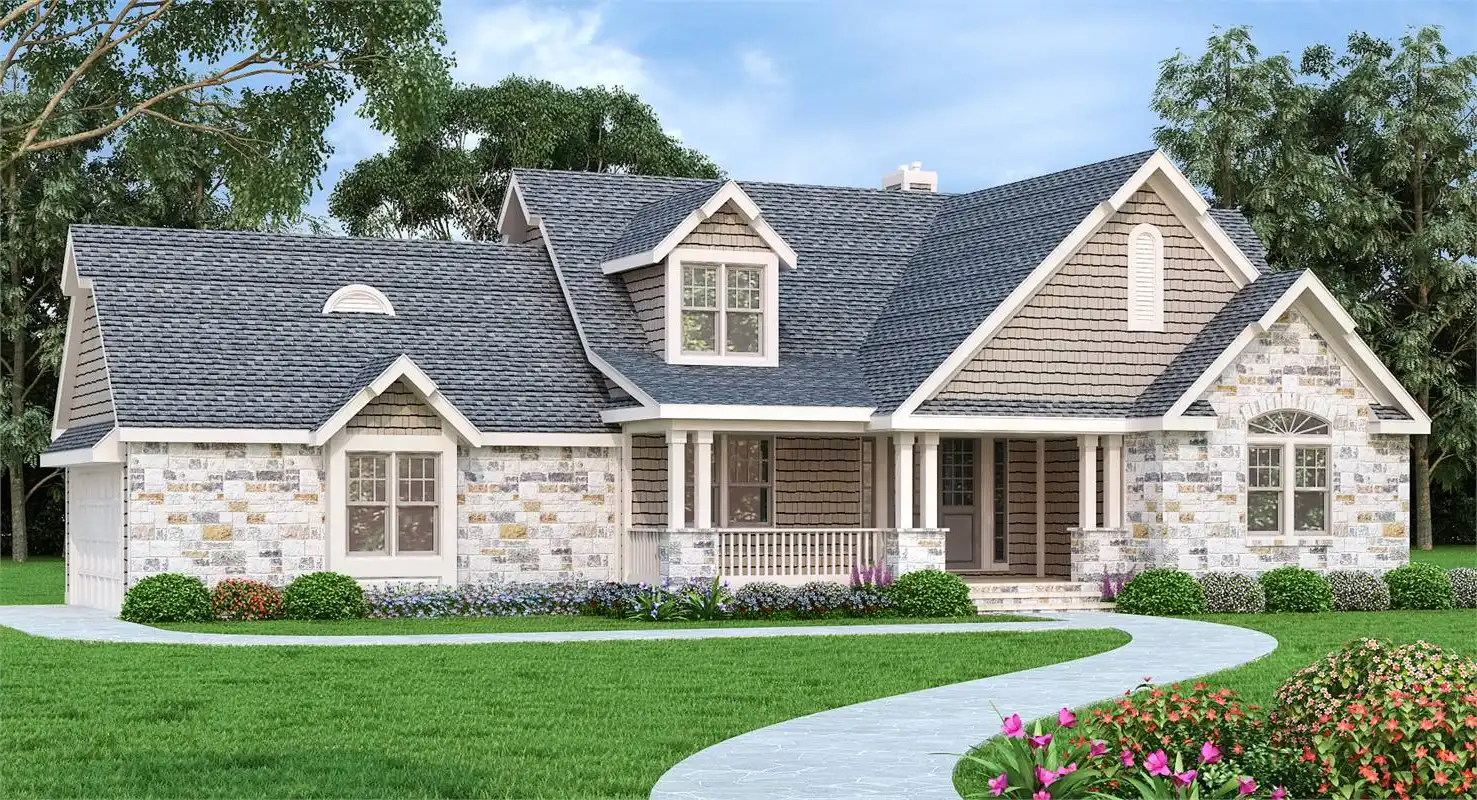 An inviting front porch welcomes visitors to this affordable ranch house plan, with three bedrooms, two baths and 1,828 square feet of living area. Double doors introduce the foyer and the spacious great room in this home plan, which hosts any gathering in comfort. Note the fireplace and the high ceiling. The gourmet kitchen flaunts a work island as it serves the classic dining room and the bright breakfast nook. Don't overlook the option of al fresco dining on the rear porch or patio. The deluxe master bedroom boasts a tray ceiling, two walk-in closets and outdoor access. A garden tub anchors the personal bath, along with a separate shower and two sinks. Two secondary bedrooms with walk-in closets share a hall bath. Our customers love the two-car garage and the handy laundry/mudroom area. Take a look at the unfinished bonus areas on the upper level of this home design. How about making a guest room and an art studio?