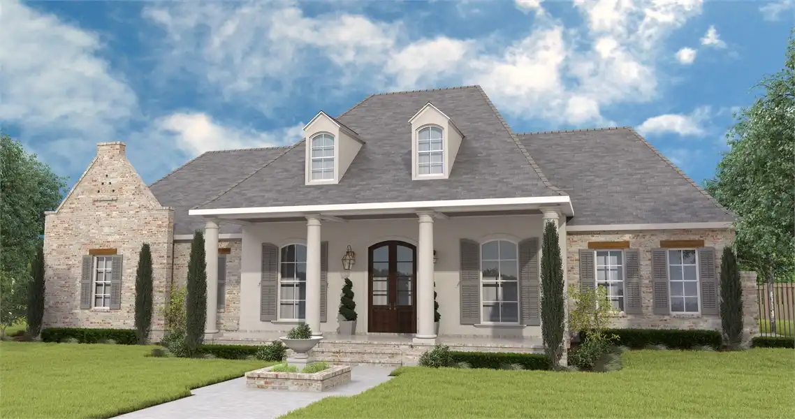 Arches and shutters lend a French country feel to this stately house plan, with four bedrooms, three full baths, two half-baths and a luxury 3,001 square feet of living area. Welcome guests on the front porch of the home plan, and then show them into the spacious family room, to relax in front of a crackling fire. Expand any gathering to the sizable rear verandah with its handy summer kitchen. The wide-open main kitchen offers island snack space for four. Note the convenient pantry and the adjacent dining room. Retire to the peaceful master suite at day's end. The private bath boasts a focal-point tub, a walk-through shower and two vanities. Note the walk-in closet and the important safe room for storm protection. Two more bedrooms have personal baths. A workout room, which could accommodate overnight guests, lies near a pet domain. Our customers love the large workshop at the rear of the home design.
