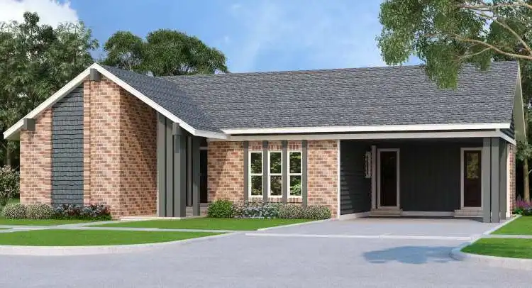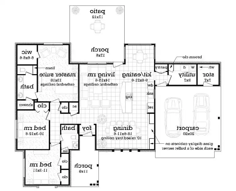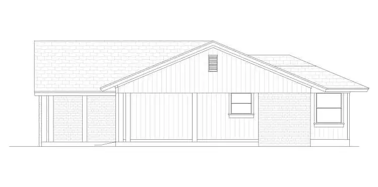 A prominent gable roof fronts this affordable contemporary-style house plan, with three bedrooms, two baths and 1,550 square feet of living area. Entertain guests in the spacious living room of this home plan, where a cathedral ceiling soars overhead. Step out to the rear porch and patio for a breath of fresh air. The island kitchen serves the cozy eating nook and the sizable dining room with style. Glass display cabinets flank a buffet server. The quiet master suite in this home design offers a cathedral ceiling and a walk-in closet. The private bath flaunts a sit-down shower and a dual-sink vanity. Builders point out the double carport and the handy storage room.