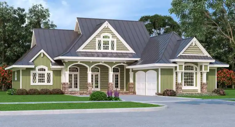 Tasteful arches embellish this appealing cottage-style house plan, with three bedrooms, 2.5 baths and 2,050 square feet of living area. Beyond the front porch of this home plan, the living and dining rooms host guests in comfort and style. Expand any party to the rear outdoor areas for fresh air and stargazing. The gourmet kitchen flows into a casual eating area. The vaulted master bedroom is a welcome sight after a busy day. In the personal bath, you'll find a garden tub, a separate shower and two vanities. Two walk-in closets will be appreciated. A second full bath serves two additional bedrooms in this home design. Our customers love the sizable storage room off the two-car garage.
