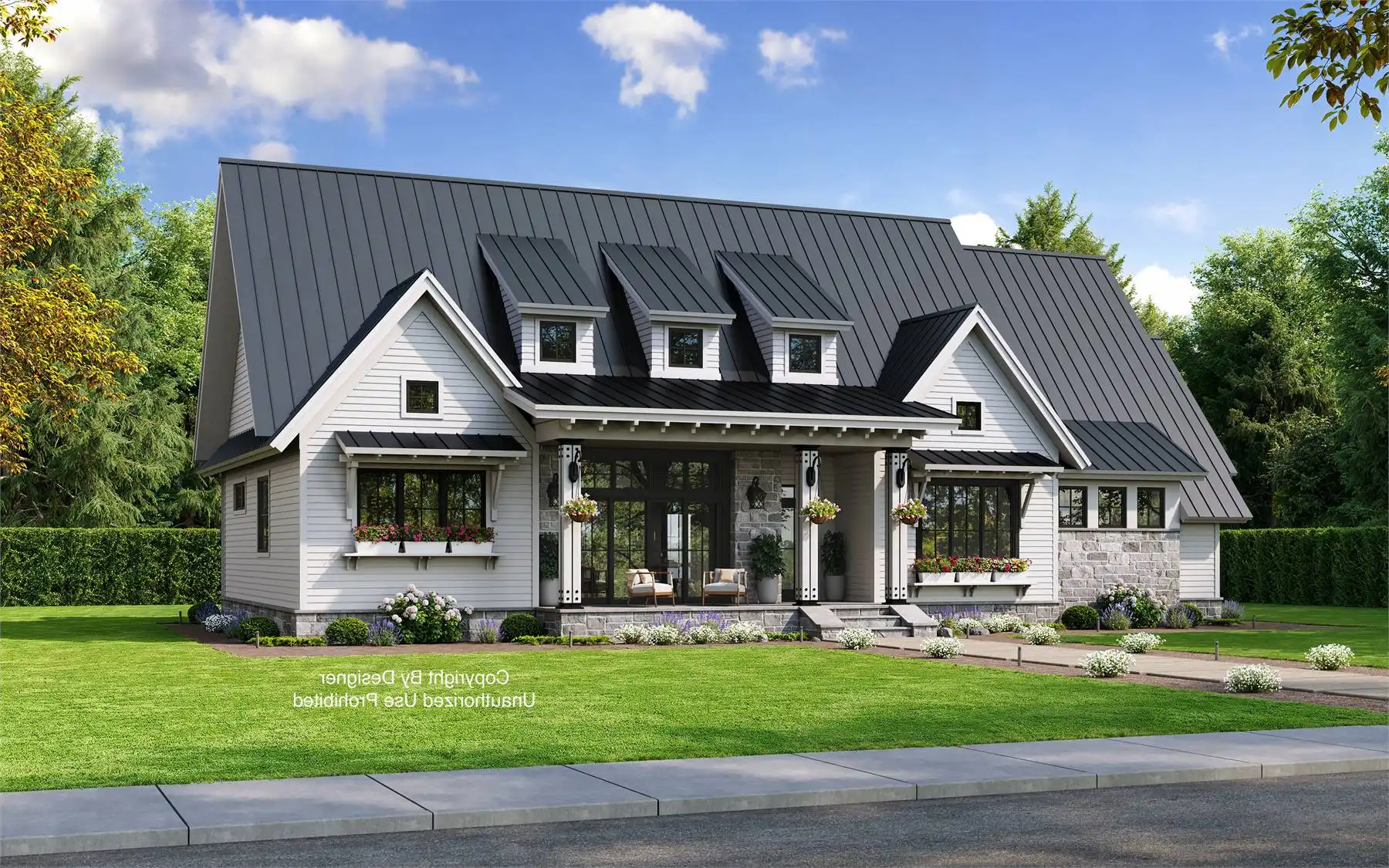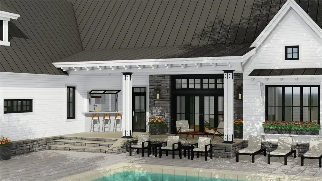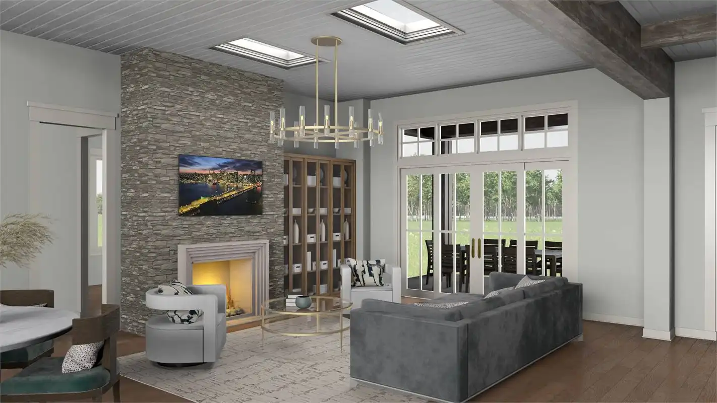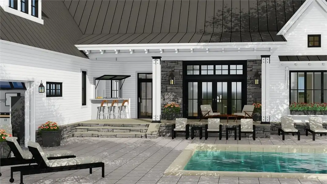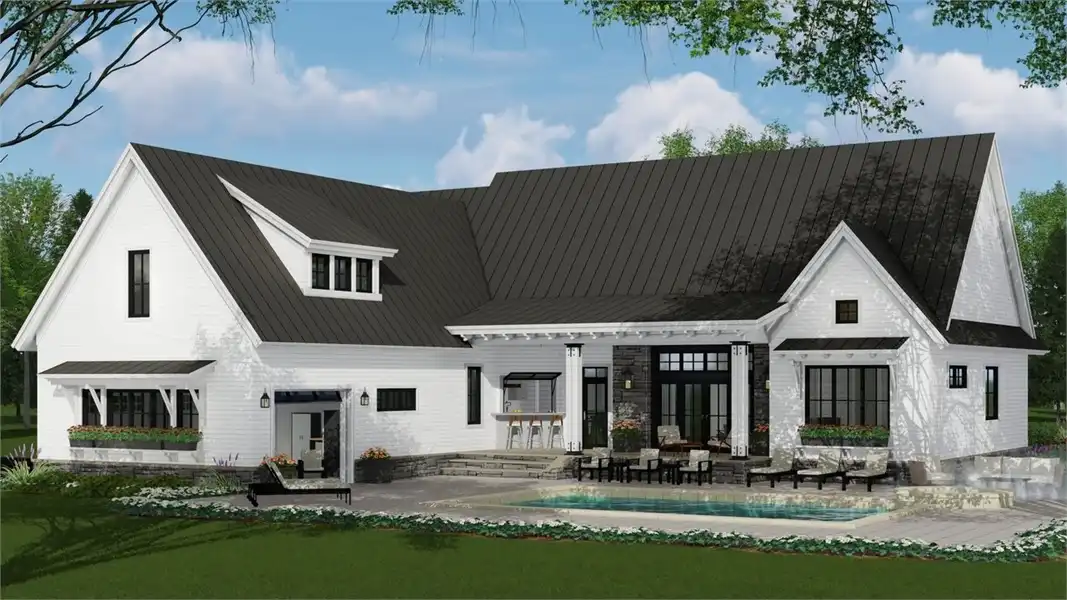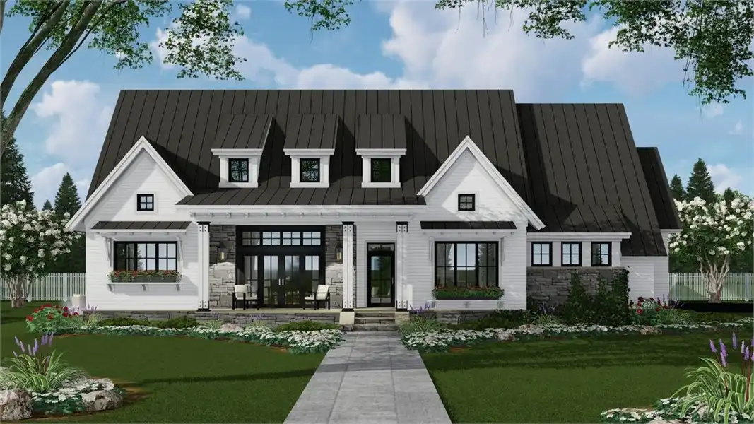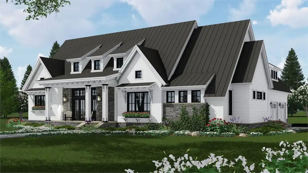 A peaceful front porch and stone accents adorn this graceful country-style house plan, with three bedrooms, 2.5 baths and 2,287 square feet of living space. A 12-ft. ceiling is a highlight of the sizable great room in this home plan, where a fireplace adds warmth. Step out to the rear porch with guests, for a breath of fresh air. The island kitchen may be the most interesting one you've ever seen! The formal dining area and the casual breakfast nook offer outdoor views and plenty of elbow room. Unwind in the master bedroom, where a cathedral ceiling visually expands the space. A garden tub anchors the master bath, which also flaunts a sit-down shower and two sinks. Note the oversized walk-in closet. Across the home, two more bedrooms with walk-in closets share a Jack and Jill bath. Builders point out the versatile resource area, for studying or menu planning. Above the two-car garage of this home design, the bonus suite could accommodate a boomerang child.