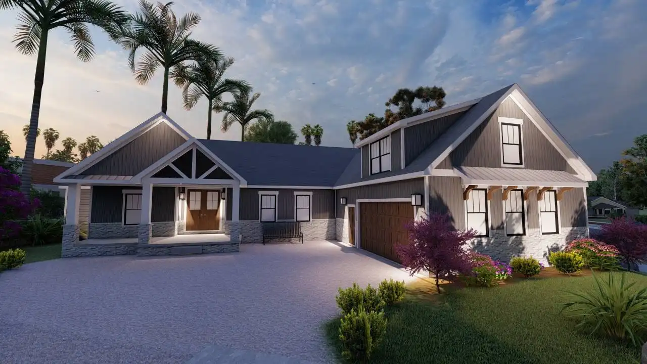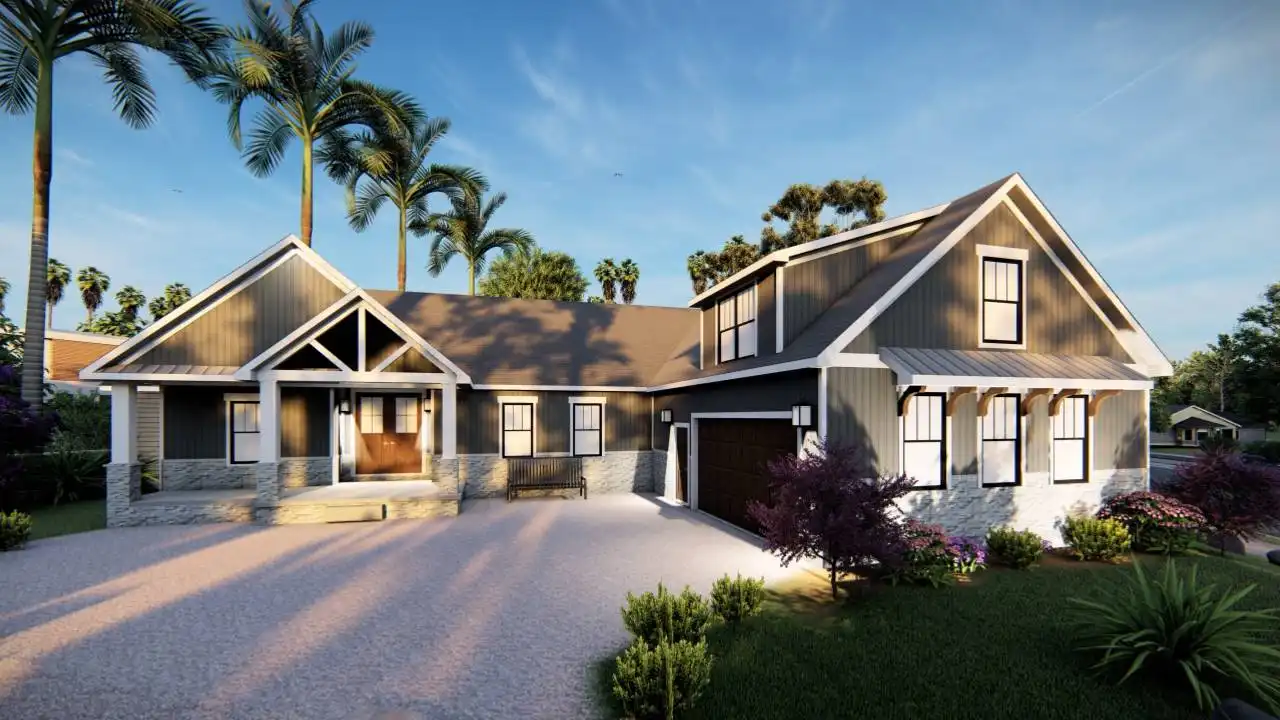 House Plan 6962 is a wonderful midsize ranch with a front side-entry garage, so look no further if that's what you need for your lot! The interior boasts 2,648 square feet with open-concept living including an island kitchen and vaulted great room, an office off the foyer, and four split bedrooms including a five-piece primary suite and three bedrooms that share a hall bath. Other highlights include the deck in back, the large mudroom, and the bonus over the garage.