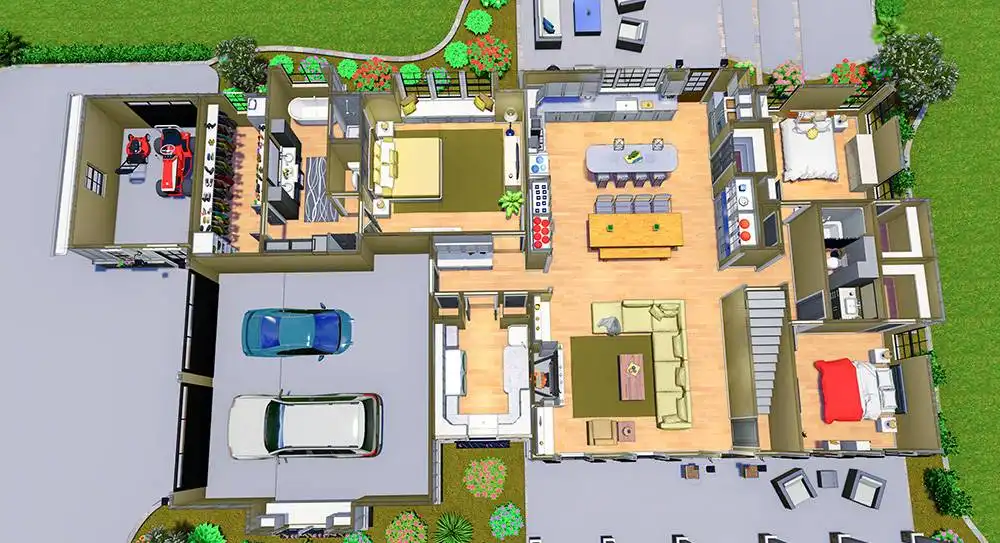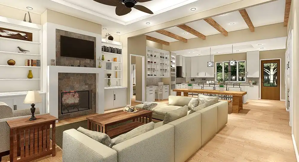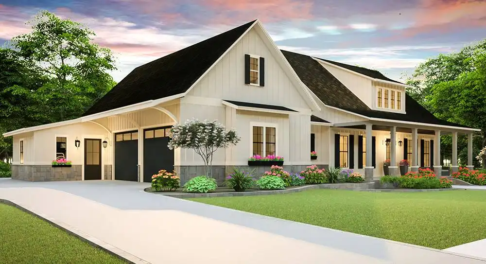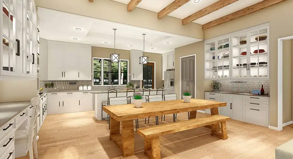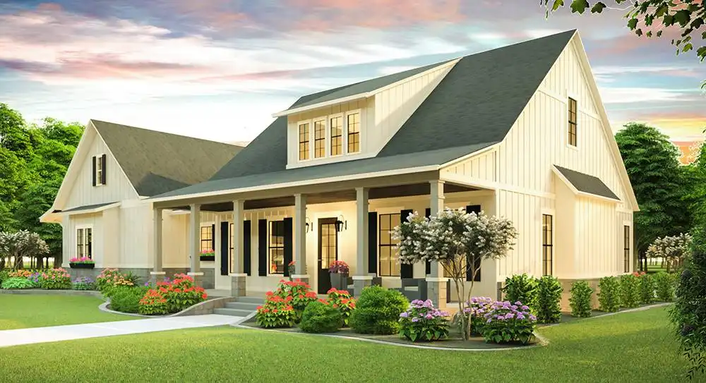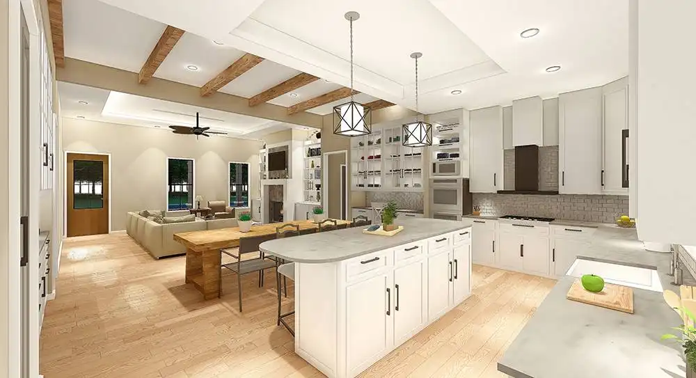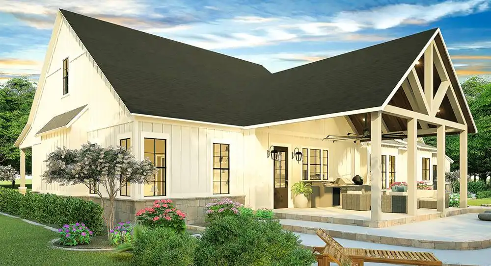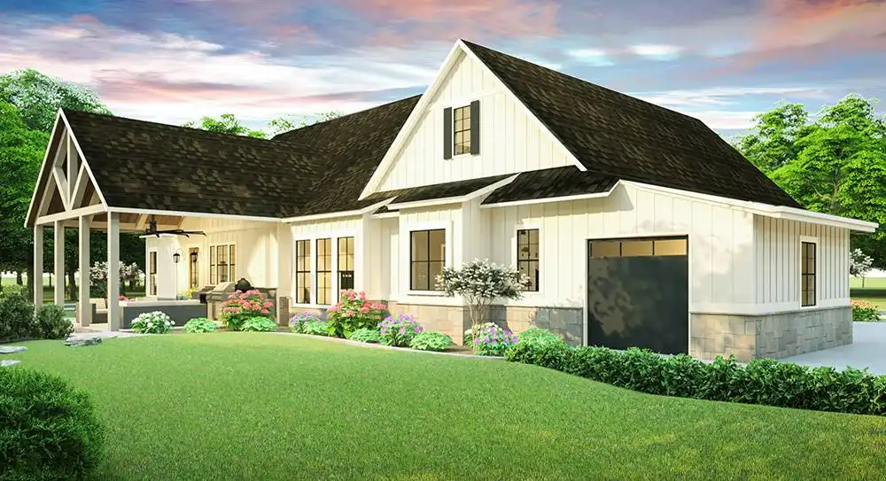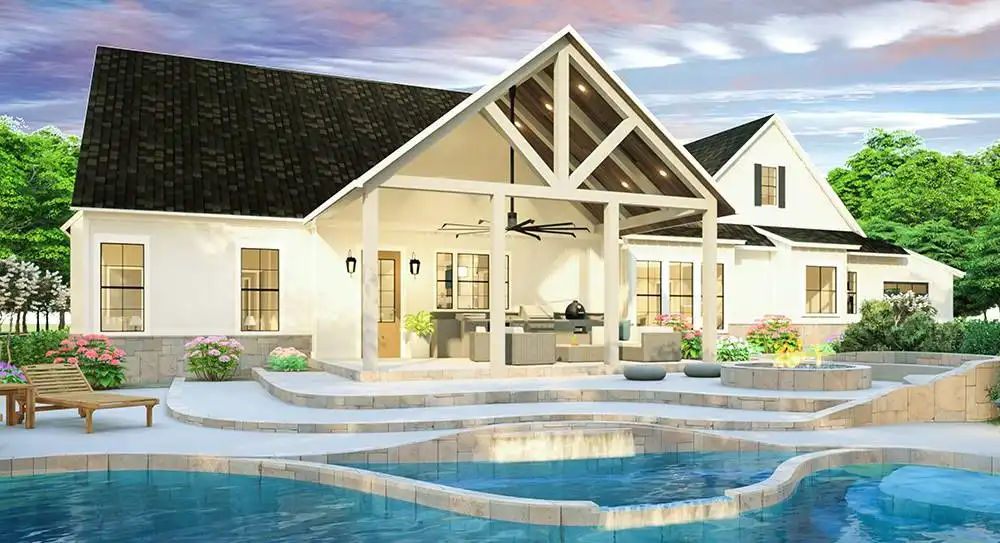 This modern country farm style home has an open concept including the living, dining, and kitchen area. These spaces are separated by unique ceiling designs. The wooden beams in the dining area not only separate the open space but brings the country style into the modern layout. The open concept is the main access separating the master bedroom, utilities, and garage from the extra two bedrooms on the first floor. This home has room to expand to the second floor for an additional bonus space. The front porch has more of a traditional farm house look with plenty of room to sit and enjoy the surrounding nature. The back porch has an exclusive wooden ceiling that is enhanced with wooden beams. The additional outdoor kitchen is a great entertainment area for family and friends.