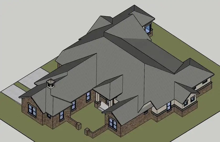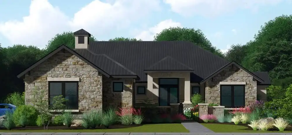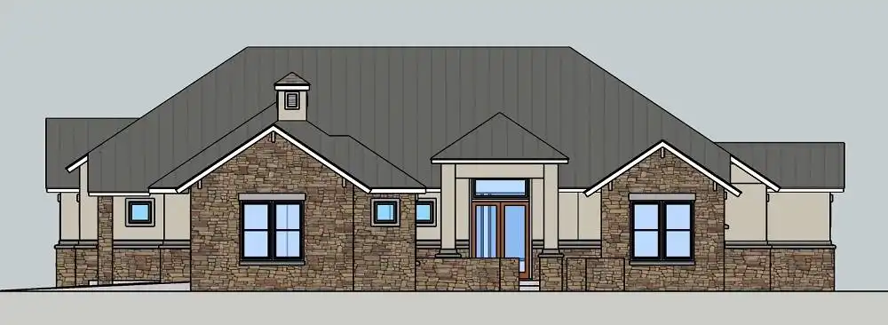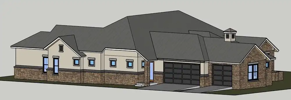 This contemporary ranch style plan. With 3,348 square feet, 4 bedrooms and 4 bathrooms, this home is unlike any other ranch that you have ever seen. A semi-enclosed courtyard provides a great walk-up to the front door. Upon entering on to the foyer, you are immediately greeted with the tremendous family room and plenty of space and storage all around. Two bedrooms, three bathrooms, and a game room are all found on the left wing of the floor plan, creating privacy and separate space for kids playing and spending time with friends. To the right side of the home, one will find a spectacular kitchen and dining room space, complete with tons of counter space and an over sized island and breakfast bar. The dining room gives way to the outdoor covered porch space, making entertaining a breeze. A sun room is also accessible from the porch, which flows in to a hallway and the master suite. A stunning master bath is only surpassed by two massive walk-in his and hers closets. To finish the home, you can find an extremely private office near the garage, the perfect space to get that last bit of work done or take personal time to finish out a hard day’s work.