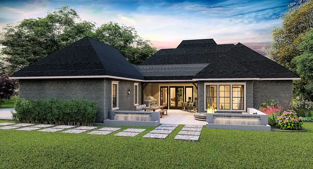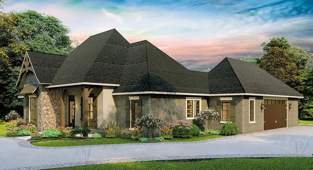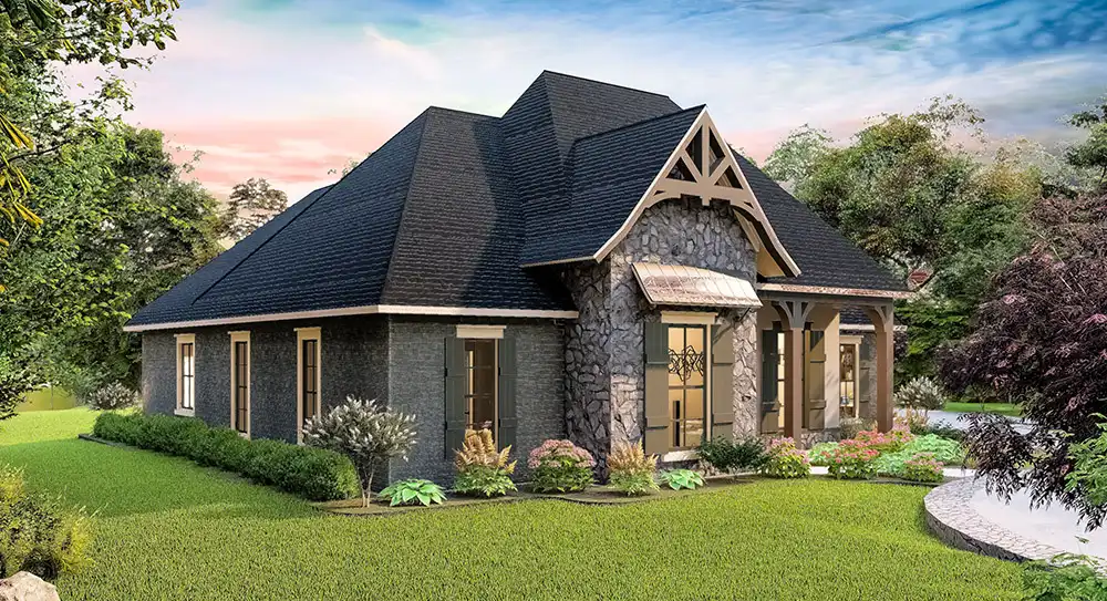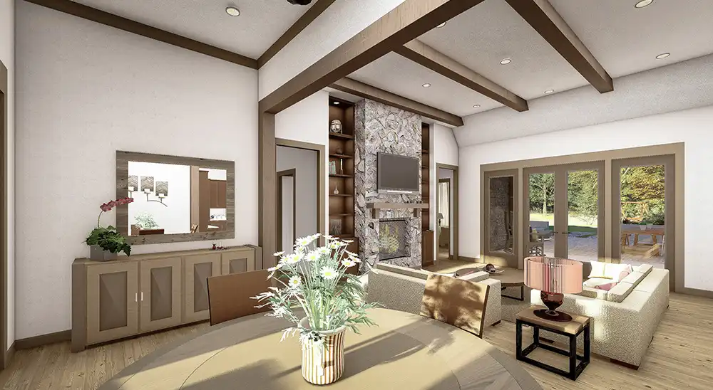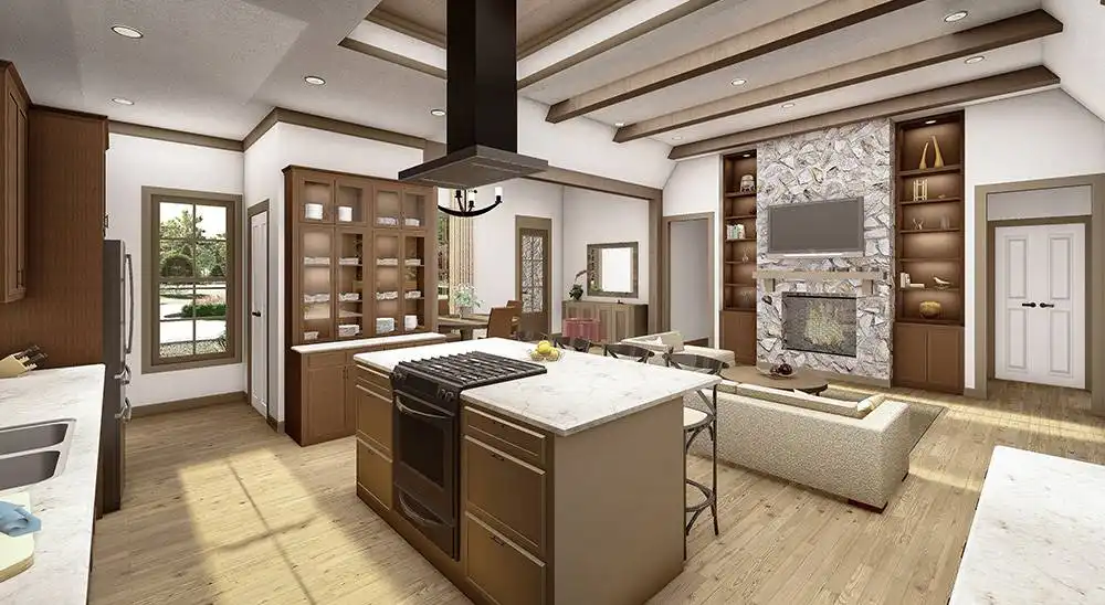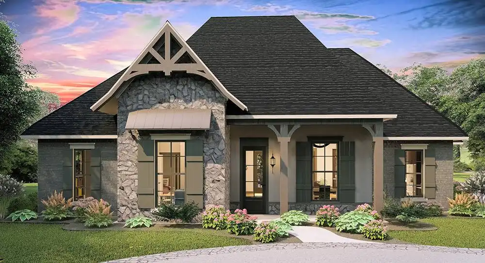 The Timberstone is a warm craftsman style home that is prompt with four bedrooms and two and a half baths. When entering the front of the home, the open foyer and dining area start the efficiently de designed floor plan. Moving through the main layout, the living area and kitchen provide the perfect area for family gatherings. The kitchen is equipped with many cabinets for storage and two buffet bars that outline a center island. Off the kitchen there is a quaint desk/work space parallel to the pantry. This home has a connected garage towards the back of the house that is spacious and provides room for w workspace and storage. Adjacent to the garage is the mud/utility room where one can find more storage s space before entering the kitchen. With so many bedrooms designed for this home, the fourth bedroom could be considered as a home office if needed. Glass French doors become a threshold to the back-porch embracing the connection from nature t to the living room. The back porch is designed with an outdoor kitchen creating a great area for e entertaining your family and friends. You can find so much inspiration throughout this home design.
