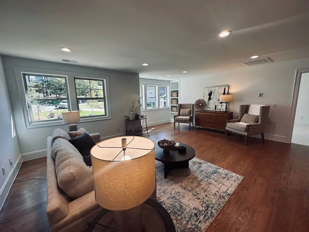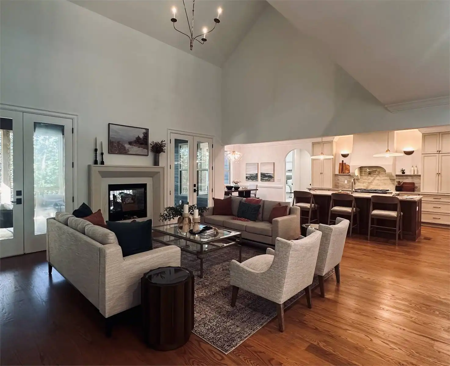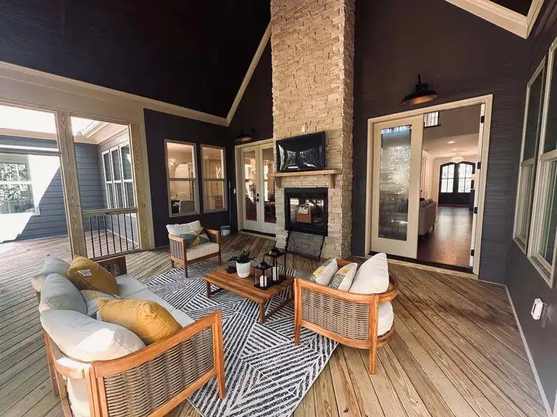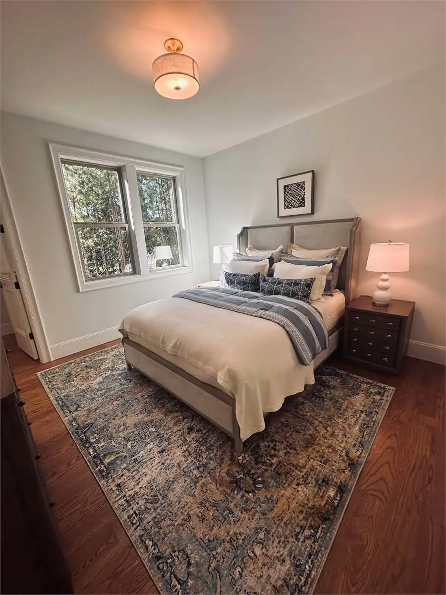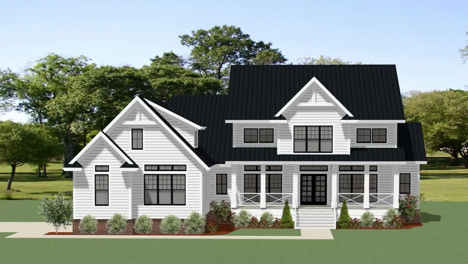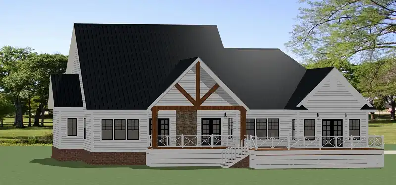 A neighborly porch is a welcoming entrance to this modern 3,830 s.f. farmhouse. A large vaulted family room leads out onto a vaulted covered porch with a 2-sided fireplace for outdoor entertainment all year. The open floor plan allows a direct view into the well-equipped kitchen complete with a sunny breakfast nook, a large island with seating for four, extra cabinets and counter space and a large walk in pantry. A walk-through butler’s pantry leads into a formal dining room perfect for family gatherings. The 3-car garage leads into a well-appointed mudroom with lockers and closet space and is attached to a laundry complete with cabinets, a sink and direct access into the master closet. The master suite enjoys a soaking tub, separate shower, double vanities, an oversized walk in closet and French doors leading out to the deck. The main floor also offers a quiet study with built in shelving and two family bedrooms, each with a walk-in closet and sharing a Jack and Jill bath. There’s an upper level guest suite with a full bath and a large loft/media room overlooking the family room below that can be both a rec room or a quiet place to relax. A large unfinished bonus room offers plenty of storage as well as room for future expansion.