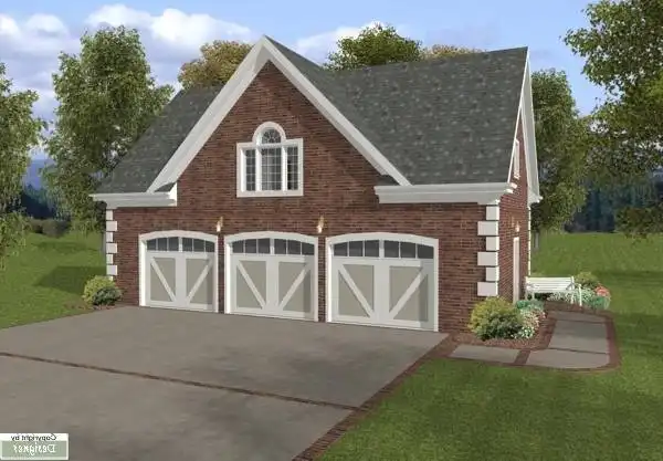 The Hudson Carriage House is a 3 car garage with a 750 sq. ft. studio above. With siding exterior reminiscent of a country barn, this plan would be perfect temporary quarters during construction of your permanent home. Or it would be ideal for an in-law apartment, nanny quarters, college student apartment, etc. This design features an eat-in kitchen, a spacious family room, a bathroom and a bedroom with a roomy closet The laundry appliances are tucked beneath the stairs on the garage level with an optional laundry chute on the living level.