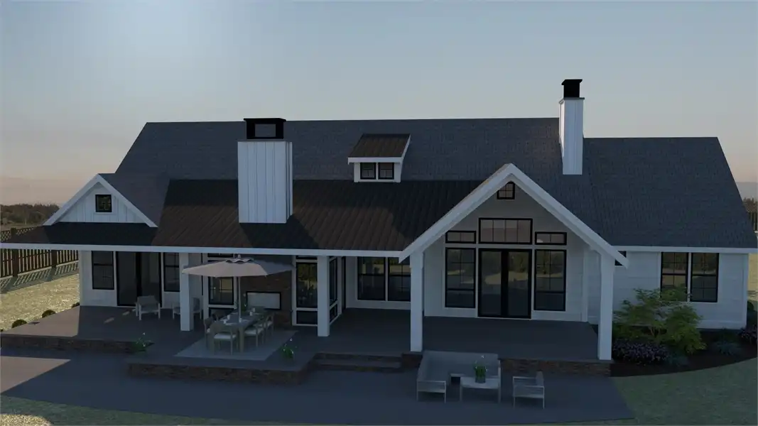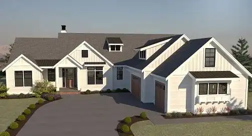 This country farmhouse style plan is the best of both worlds. With 2,688 square feet of space, this home boasts everything from a 3-car garage, a great master suite, and stunning outdoor space; and everything in between. A beautiful kitchen and over-sized island are directly off of the dining room and the hearth room, which features an indoor/outdoor fireplace and reading nook. 3 bedrooms, including the master suite, adorn the main floor, while the second floor houses a great bonus room space, perfect for a playroom or family space. The expansive outdoor space is the true beauty of this home, and it has no shortage or areas to entertain and enjoy the outdoors while being free from the elements.