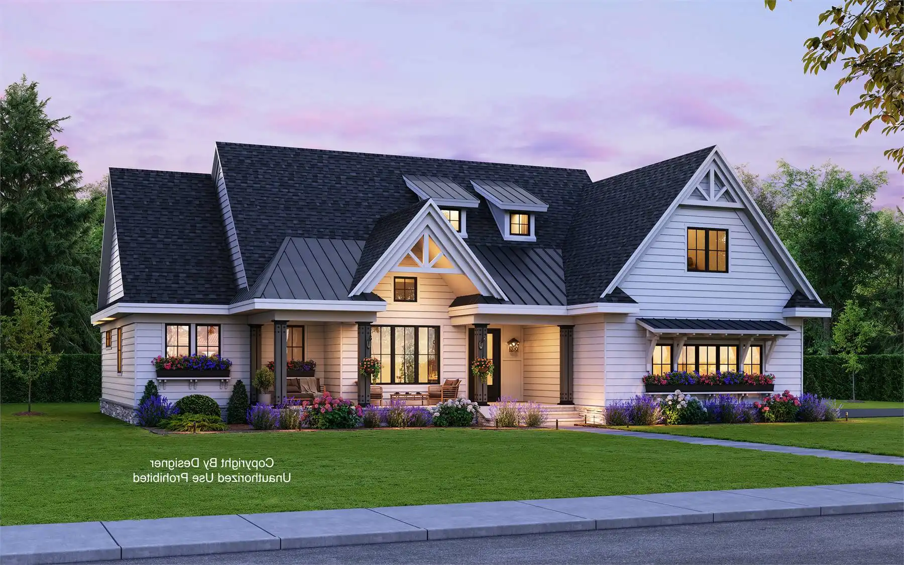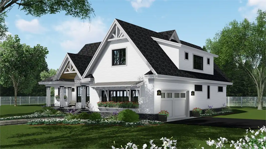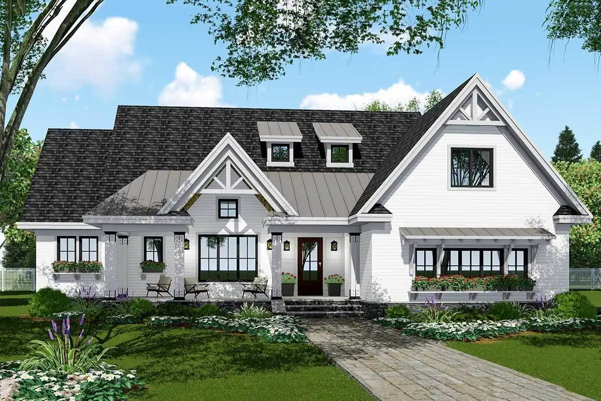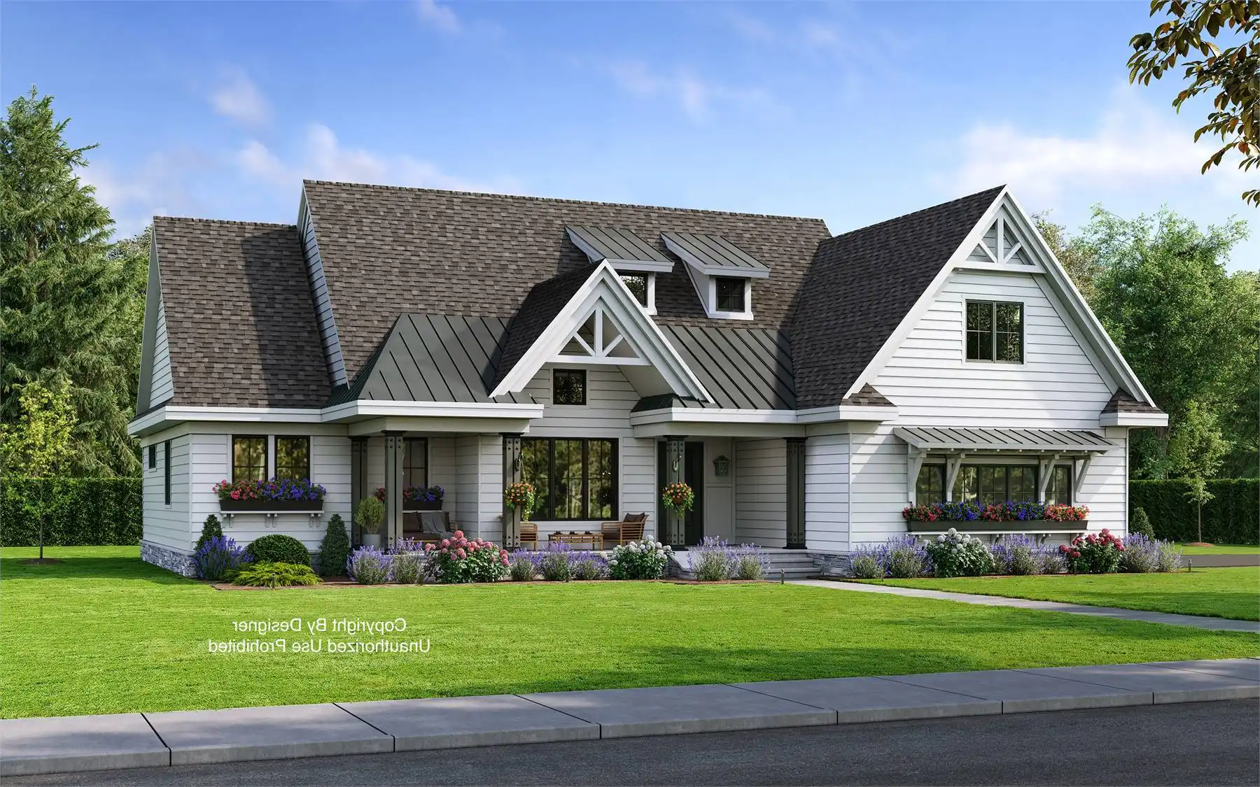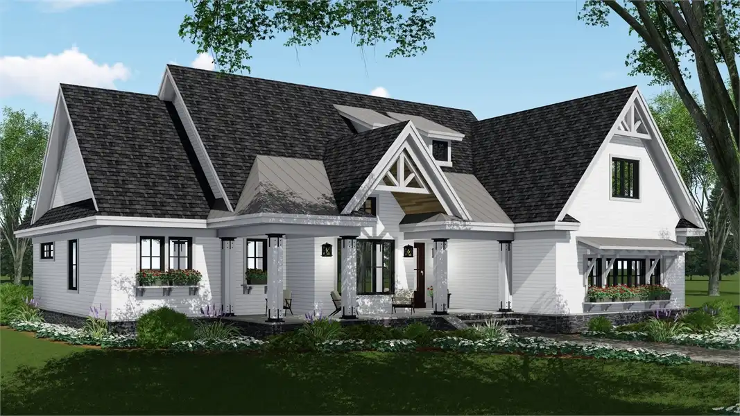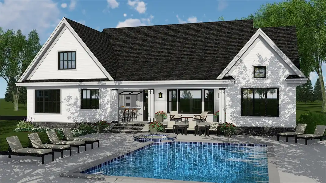This house plan is the perfect hybrid of a craftsman and a farmhouse style. Complete with 2,751 square feet as well as 4 bedrooms and 3.5 bathrooms, this plan has plenty of space as well of plenty of practicality. The sizable front porch is perfect for an afternoon spent outside with a good book or a cold drink on a summer’s day, while the large windows of the home offer plenty of light in to the building. The unique island of the kitchen and its seating areas make family dinners or breakfasts before work, easily attainable. One of the best parts of the plan is the versatile rear porch and seating areas which lend themselves perfectly to the addition of a pool, adding a whole new element to outdoor living. The second floor also offers 2 bedrooms as well as a loft that is great for a TV area or game space.