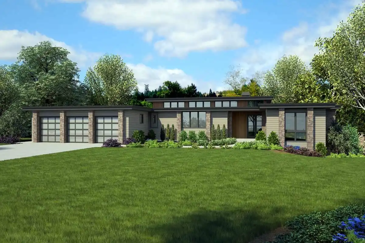 Boasting 2,959 square feet, along with 4 bedrooms and 4.5 bathrooms, this single story home has no shortage of space or surprises. A modern front façade mixes various design elements and provides great curb appeal. A 3-car garage features ample space for a workshop or hobby area, or even additional storage. A covered front entryway gives way to the foyer and its 10’ ceilings. To the left of the foyer you’ll find what can be referred to as the “bedroom wing” of the home, as 3 of the 4 bedrooms that this plan offers can be found here, including the master suite. As an added bonus, every bedroom in this home has its own walk-in closet and full bathroom, ensuring privacy for everyone. The master suite features an impressively large bedroom and closet, as well as a relaxing bathroom. Back towards the foyer, to the right you enter in to one of the largest living room and dining room combinations that you have ever seen. With over 600 square feet of living space, this massive area also opens on to the rear porch, as well as having direct access to the gourmet kitchen and its walk-in pantry. Beyond this amazing central space, you’ll find a private home office, as well as a mudroom, laundry room, half bathroom, and stairs down to the lower level of this plan. The fun only continues down with the lower level, a space that provides a large game room, built-in wet bar, covered outdoor living space, and finally a full bedroom and bathroom, great for guests. With all of these offerings, one thing is for certain, with this plan, you’ll never run low on space.