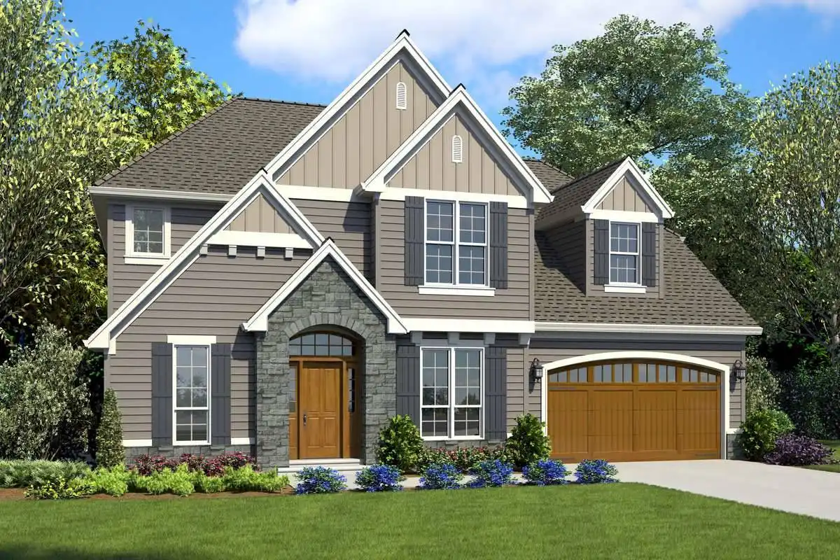 This traditional plan brings with it, a bit of country charm. Amongst its 2-story layout, you will find 2,535 square feet of living space which provides great and functional areas such as the 4 bedrooms and 2.5 bathrooms. Plenty of welcoming charm can be found from first glance, as elements such as stone and wood join together to give this home a refined feeling. Once inside, you enter on to the grand foyer, with the stairs and a powder room to your right, and the formal dining room to your left. Further inside you will find the amazing open concept that makes this home one that the whole family will enjoy. Here the spacious great room joins with a breakfast nook as well as the eat-in island kitchen. Past the kitchen is a mud room and a walk-in pantry, as well as access to the garage which features its very own workshop space, great for all sorts of projects! The second floor is home to all of the bedrooms, including 3 uniquely spacious rooms which share a full bath, perfect for kids and guests alike. Finally, the master suite finishes the tour, redefining comfort. A large bedroom is joined by a private spa bath with a soaking tub, as well as a comfortable walk-in closet packed full of storage.