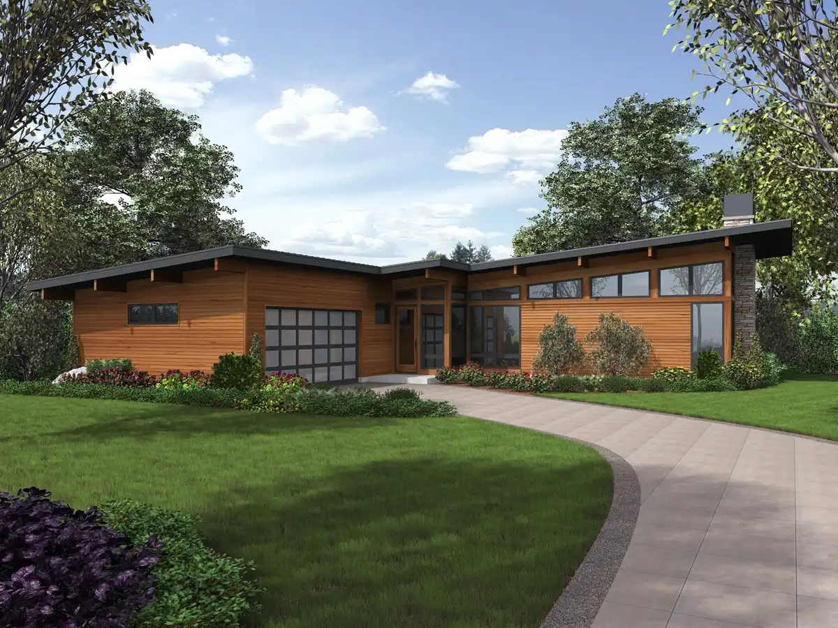 This contemporary style ranch a great option for homeowners who value a plan with added flair. A steeply sloped roof and large windows give this home a sleek feel, while its unique shape actually maximizes the layout’s efficiency. A 2-car garage and covered front entryway adorn the front, with the latter opening in to a vaulted foyer. From there, move forward in to the over 500 square foot living/dining room plus kitchen combination. This piece of the home juts out from the rest of the home, giving it the grand feeling of a banquet hall or ballroom, with the added bonus of several sliding glass doors, providing great views and functionality. Instead of moving directly in to this space from the entrance, turn to your right and enter the main area of the home. Here you will find 2 auxiliary bedrooms and a shared hallway bathroom, a laundry room for quick and easy chores, as well as the master suite, complete with a spacious walk-in closet, and a great bathroom with an over-sized walk-in shower.