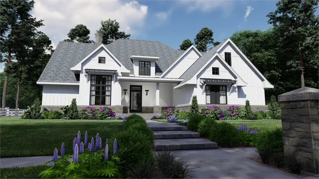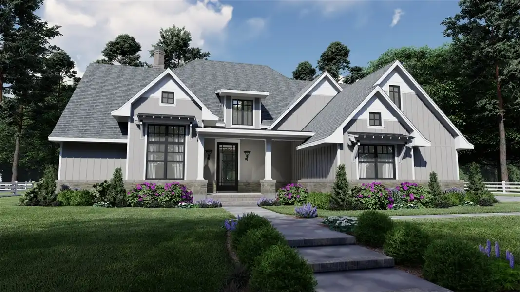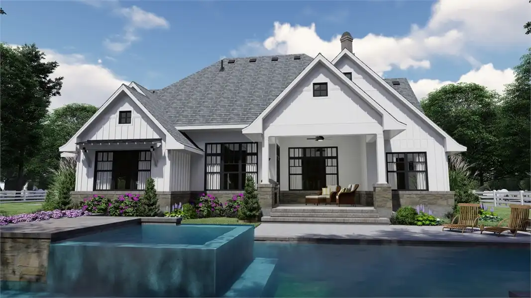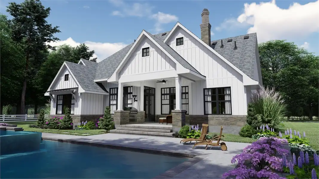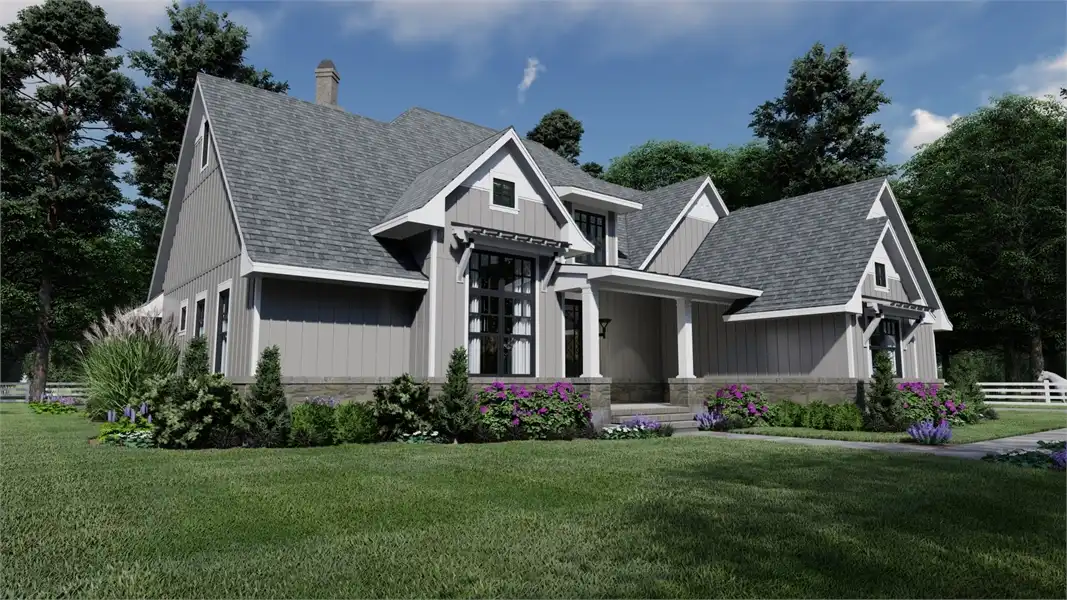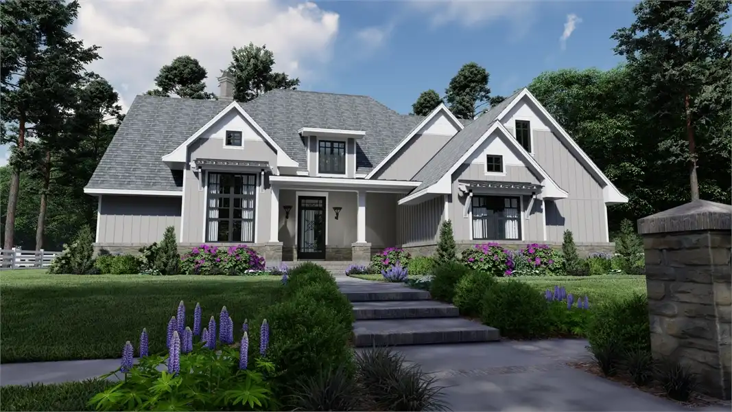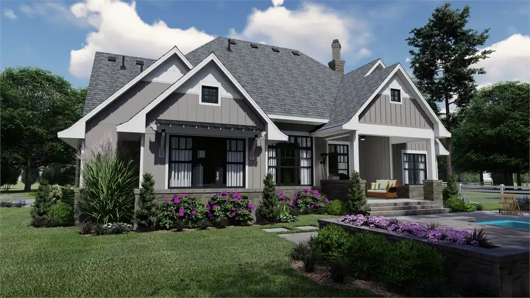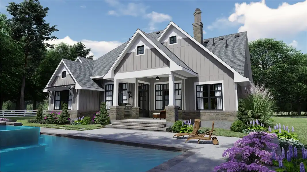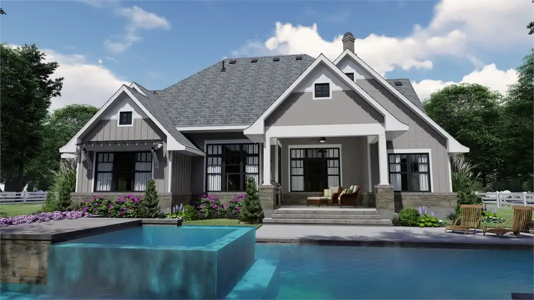 Striking columns and stone accents lend a Craftsman appeal to this 2,191-square-foot house plan with four bedrooms and four baths on the main level. You'll love the open living areas in this home plan, with the comfortable family room warmed by a fireplace. The island kitchen offers a nearby pantry to keep the family chef organized. Serve any meal in the bright dining area, or go out to the lanai for al fresco dining. Double doors introduce the posh master suite in this home design, a welcome sight after a busy day. Two walk-in closets flank the deluxe personal bath, where you'll find a garden tub, a refreshing shower and dual vanities. Two bedroom suites allow the children to have a measure of privacy. Builders point out that the fourth bedroom could be used as a study or home office, with direct access to a hall bath. An optional bonus suite above the two-car garage adds 290 sq. ft.