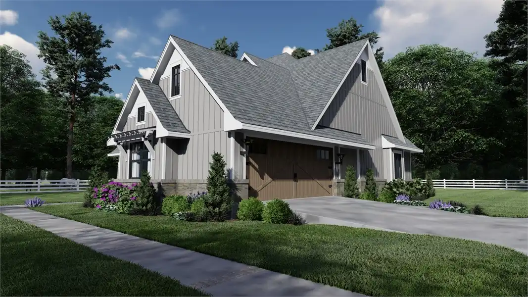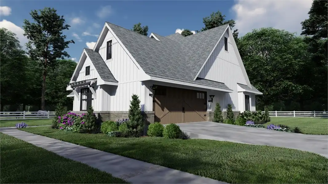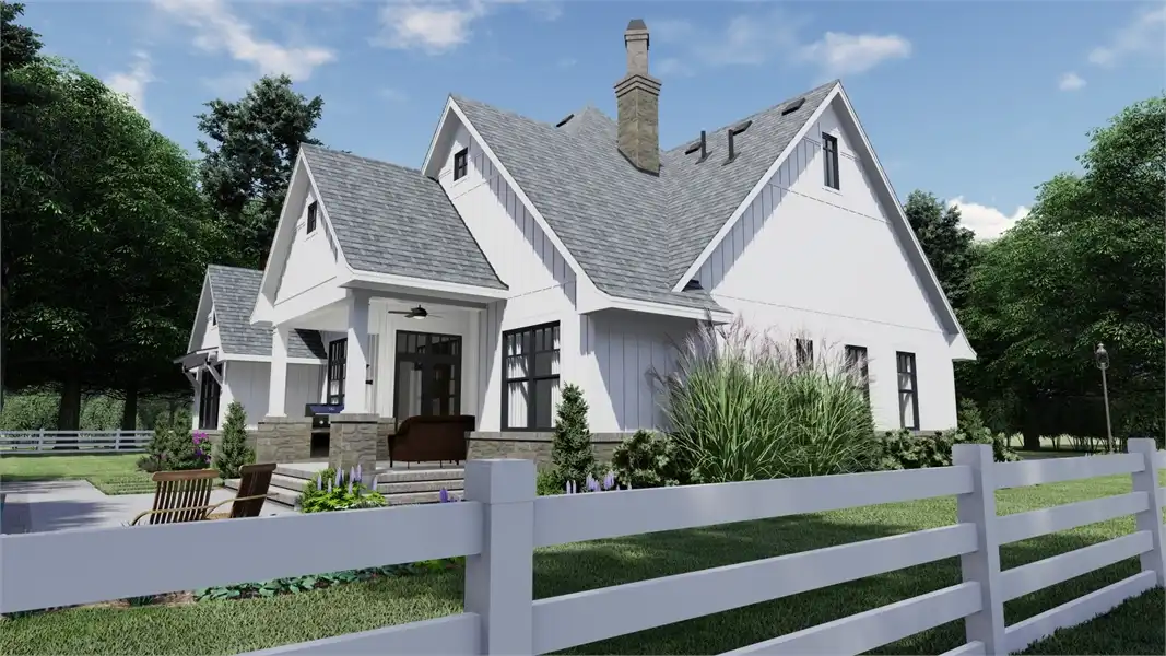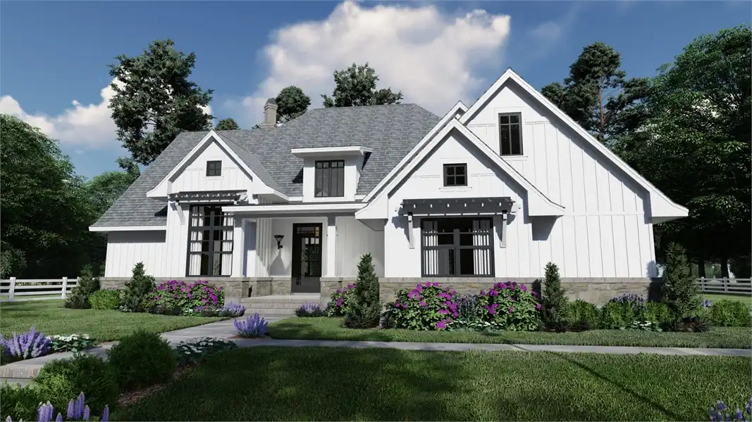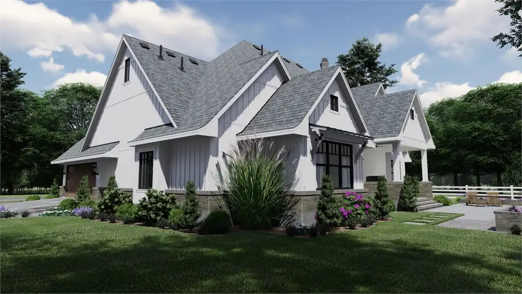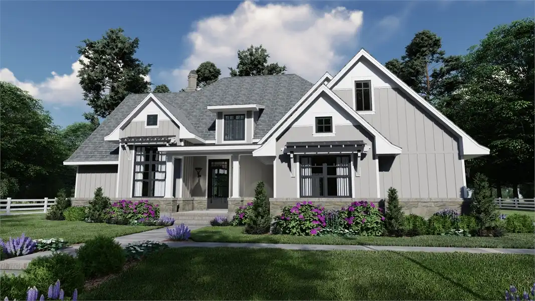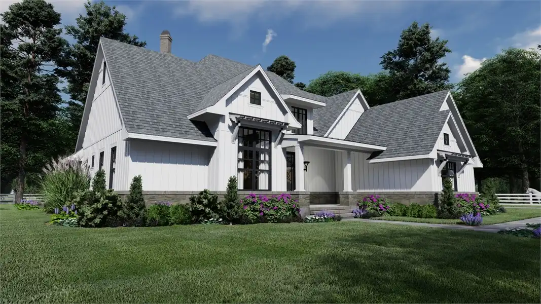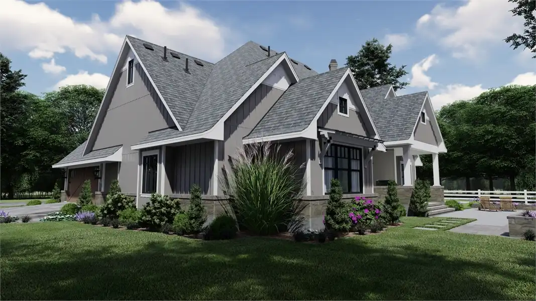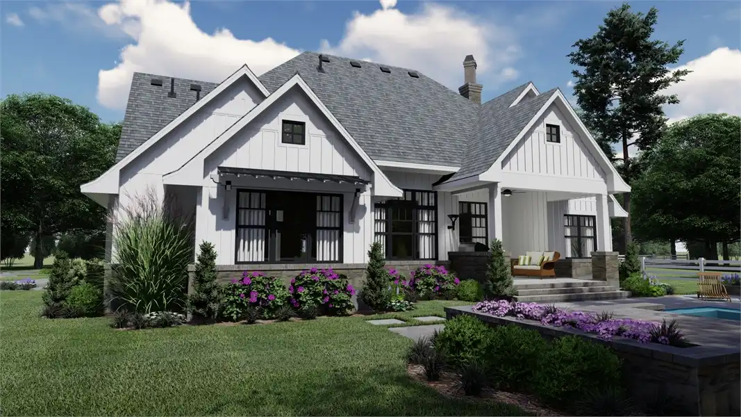 Striking columns and stone accents lend a Craftsman appeal to this 2,191-square-foot house plan with four bedrooms and four baths on the main level. You'll love the open living areas in this home plan, with the comfortable family room warmed by a fireplace. The island kitchen offers a nearby pantry to keep the family chef organized. Serve any meal in the bright dining area, or go out to the lanai for al fresco dining. Double doors introduce the posh master suite in this home design, a welcome sight after a busy day. Two walk-in closets flank the deluxe personal bath, where you'll find a garden tub, a refreshing shower and dual vanities. Two bedroom suites allow the children to have a measure of privacy. Builders point out that the fourth bedroom could be used as a study or home office, with direct access to a hall bath. An optional bonus suite above the two-car garage adds 290 sq. ft.