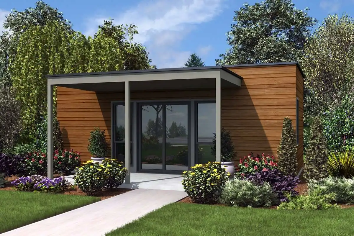 A straight forward floor plan offers the basic necessities, great for the new homeowner or couple looking to downsize. 312 square feet give you a solid footprint perfect for even the smallest lot, great for a vacation home or weekend getaway. A covered front patio opens in to a large studio bedroom space with enough area for a small couch or recliner and TV. A small kitchen provides a sink, washer and dryer, and basic cooking equipment. A full bathroom with a surprisingly spacious shower completes the home. A folding table tucks away but can be pulled down for dinner or when guests come to visit and admire your simple way of living.