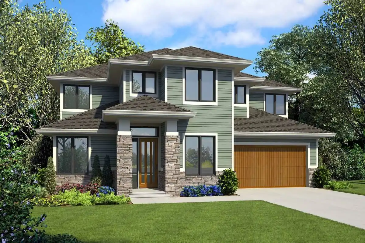 This 2-story contemporary house plan features 2,790 square feet of luxury living with an open concept layout that joins the great room with 12’ ceilings and fireplace to the breakfast nook and U-shaped kitchen with island seating. Additional highlights of the first floor include a private master suite behind the 2-car garage, a den/office space and formal dining room flank the front foyer. Upstairs, there is plenty of space for kids and guests alike, thanks to the 3 auxiliary bedrooms, two of which share a full hallway bath with dual vanities, and one that has its own en-suite, a great option for providing guests with added privacy. A second washer and dryer hookup will allow you the option to have a secondary laundry for added ease to your list of chores.
