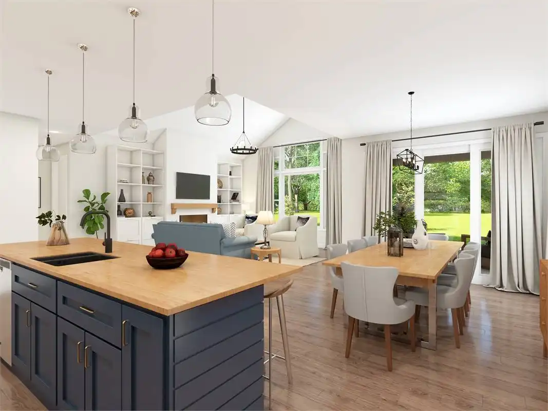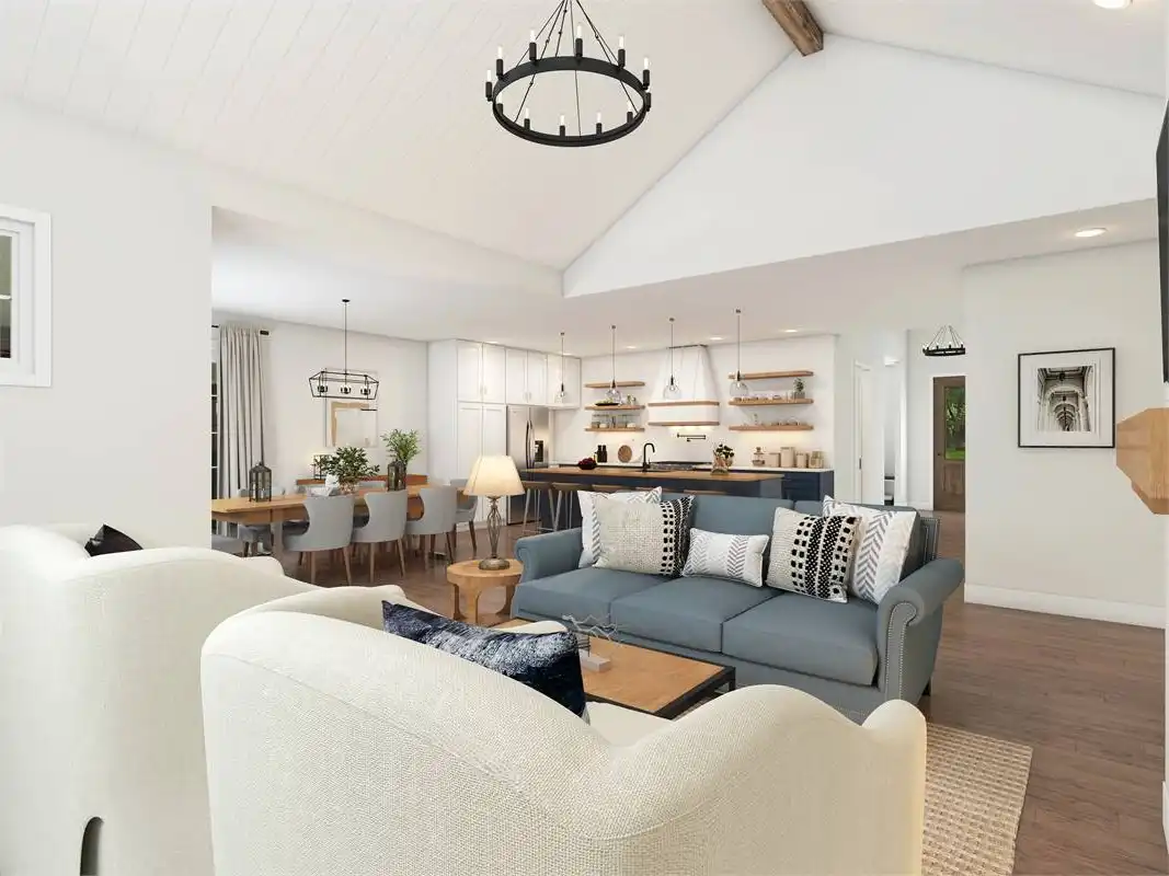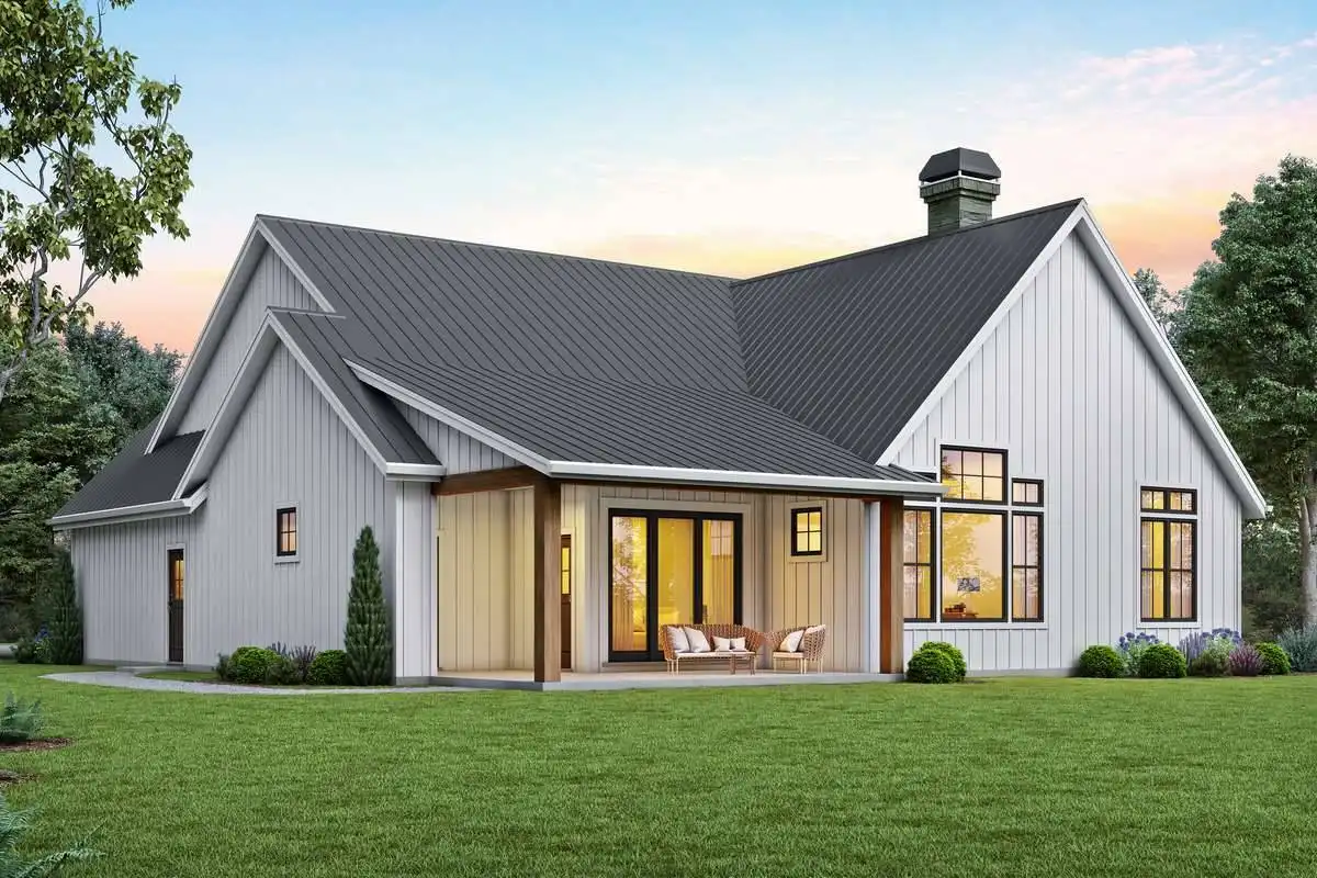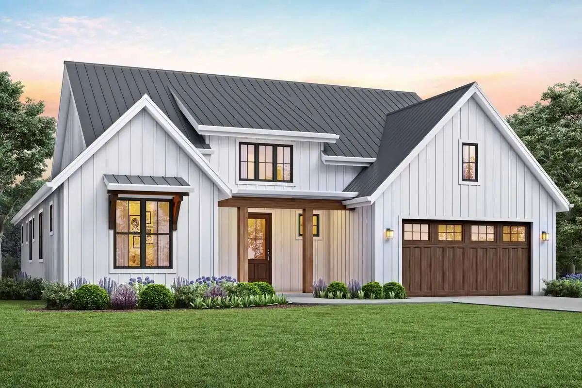 Prominent gables and a shed dormer dress up the façade of this affordable farmhouse-style house plan, with 1,878 square feet of living space containing three bedrooms and two baths. Guests will love the vaulted great room in this home plan, warmed by a focal-point fireplace. The open kitchen features a sizable island and a handy pantry. The versatile dining area hosts any meal with taste. For al fresco dining, step out to the outdoor living area and make use of the barbecue station. At day's end, retire to the vaulted master bedroom. In the private bath, you'll find a sun-drenched tub, along with a separate shower and a dual-sink vanity. Note the convenient walk-in closet. Another full bath services the two remaining bedrooms in this home design. Our customers love the extra garage space, which could be used as a workshop area.