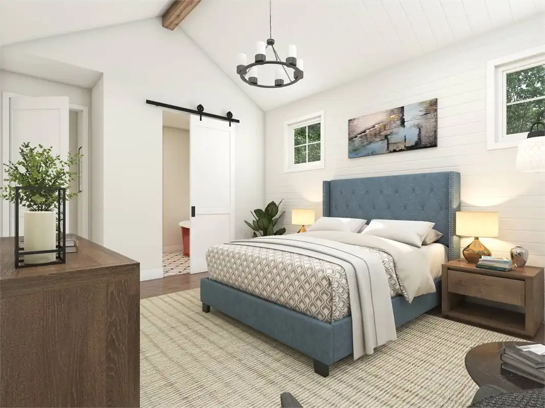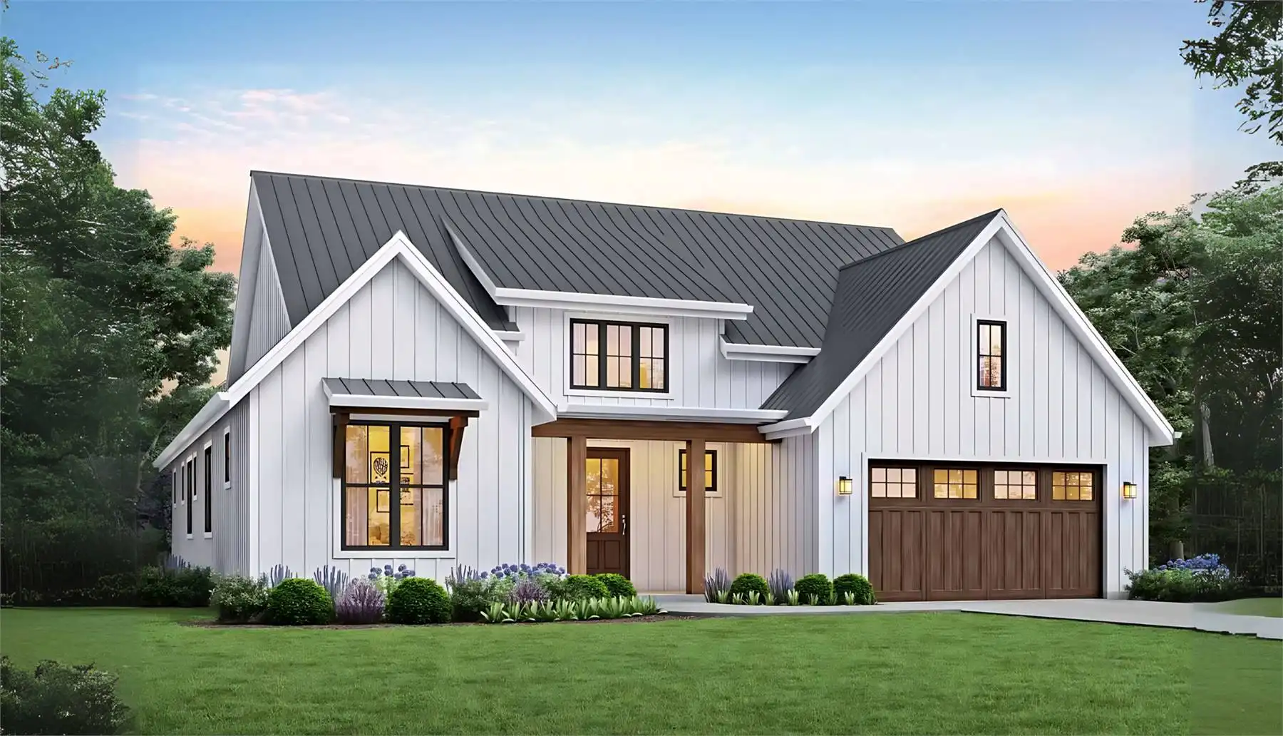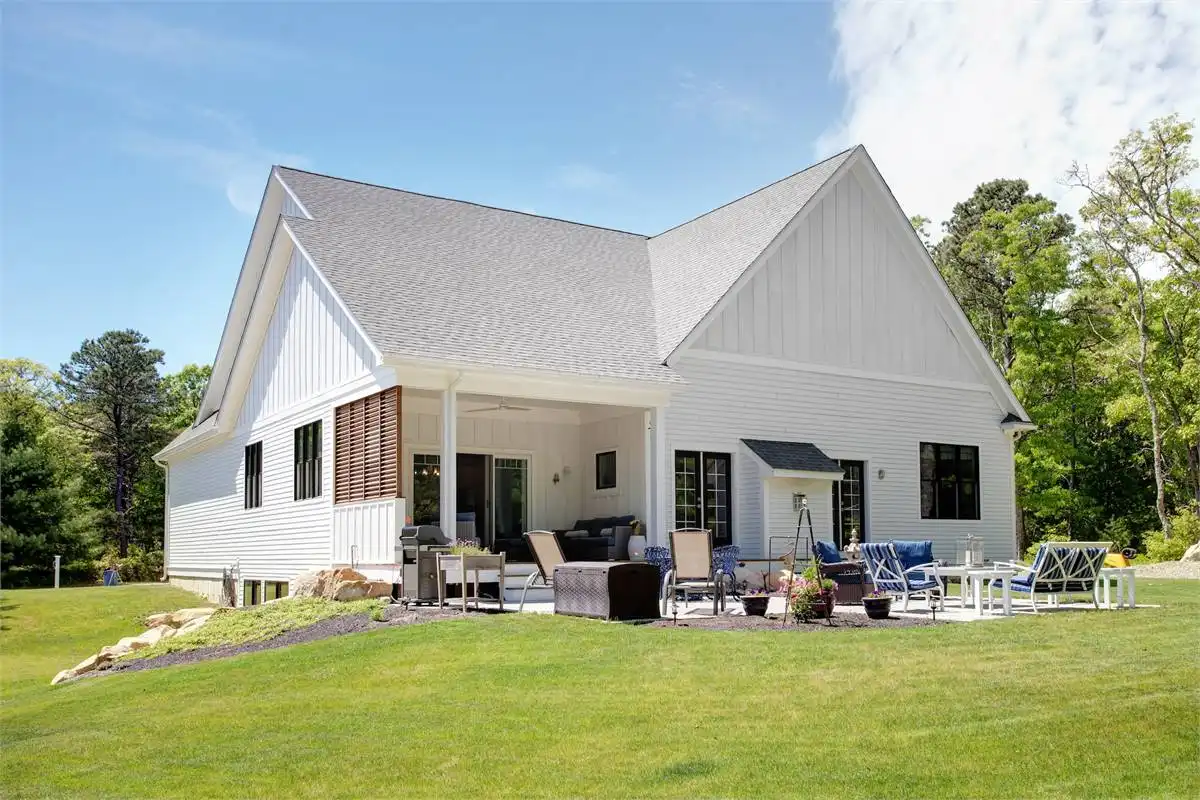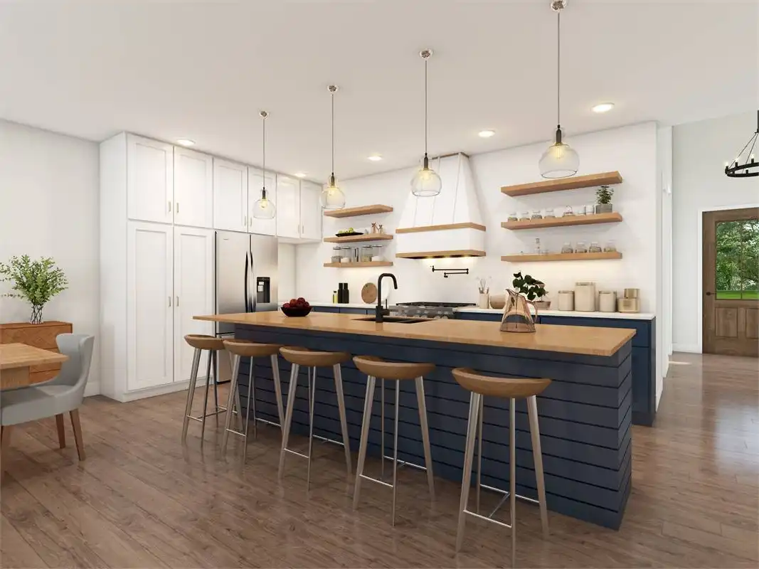 Prominent gables and a shed dormer dress up the façade of this affordable farmhouse-style house plan, with 1,878 square feet of living space containing three bedrooms and two baths. Guests will love the vaulted great room in this home plan, warmed by a focal-point fireplace. The open kitchen features a sizable island and a handy pantry. The versatile dining area hosts any meal with taste. For al fresco dining, step out to the outdoor living area and make use of the barbecue station. At day's end, retire to the vaulted master bedroom. In the private bath, you'll find a sun-drenched tub, along with a separate shower and a dual-sink vanity. Note the convenient walk-in closet. Another full bath services the two remaining bedrooms in this home design. Our customers love the extra garage space, which could be used as a workshop area.
